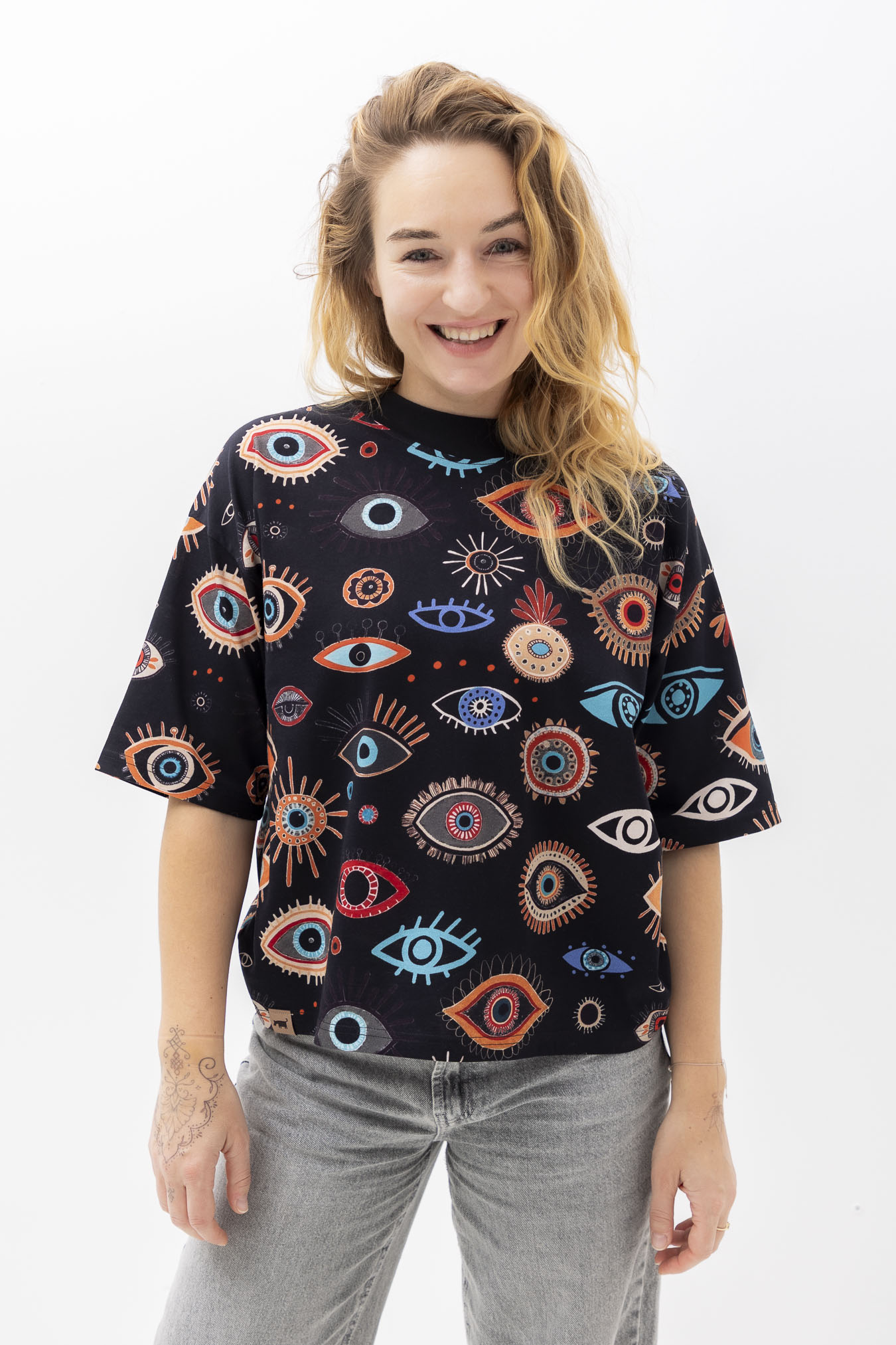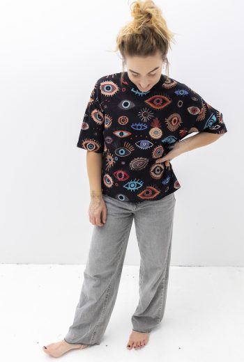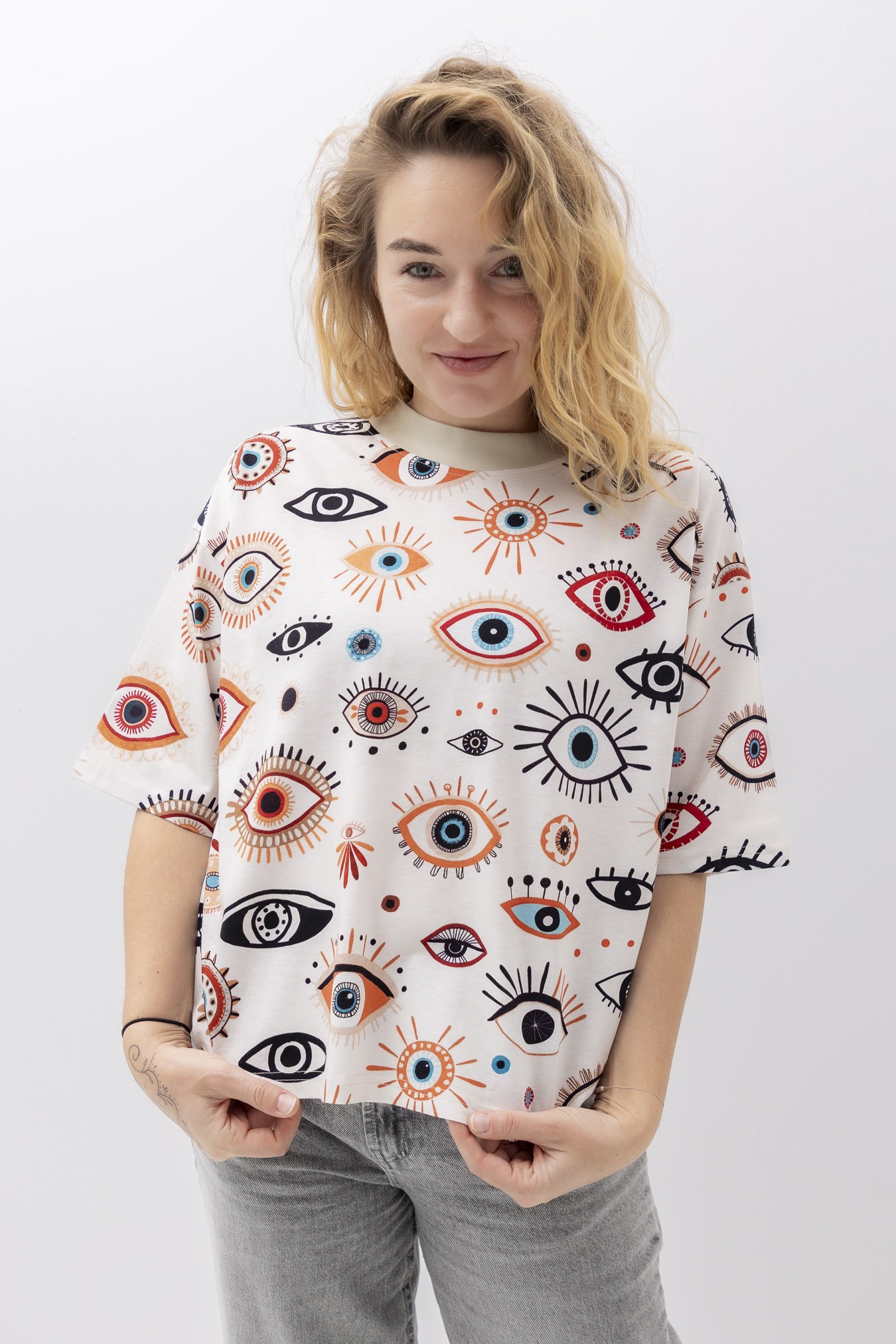 Stanik plażowy ma klasyczny krój bikini – trójkąty. Lycrę z nadrukowanym wzorem połączyliśmy z podszewką w kolorze białym. Góra od bikini wiązana jest za pomocą troczków- makaronów we wzór Orient. Dzięki czemu można łatwo dopasować kostium do sylwetki.