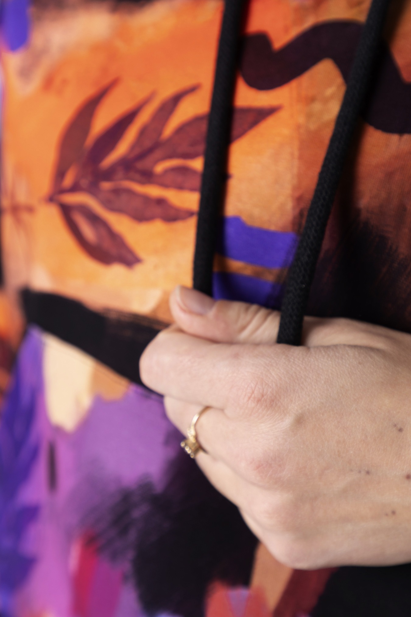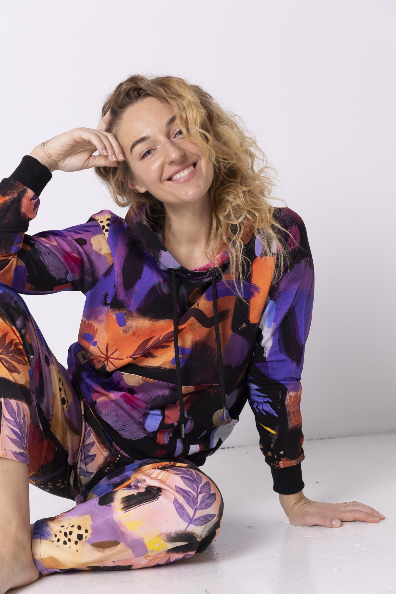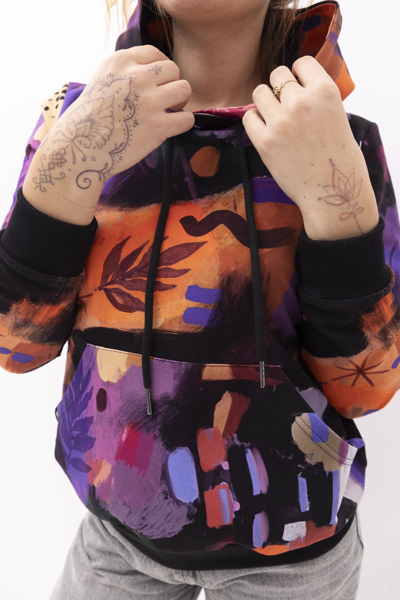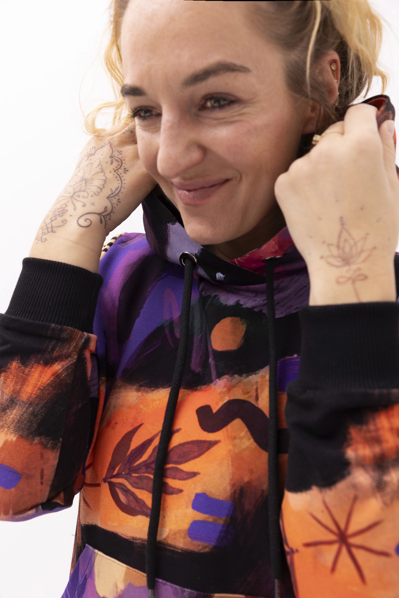 Bluza hoodie 2.0 Mazunte  przenosi w klimat oceanu, piasku i kolorów natury – ma w sobie spokój, ale też odrobinę dzikości. Wzór pełen ciepłych barw i morskich tonów przywołuje na myśl zachody słońca nad oceanem i beztroskę podróży. Jej krój delikatnie dopasowuje się do sylwetki, ale wciąż daje swobodę ruchu – dokładnie tak, jak lubimy najbardziej. Ściągacze na rękawach i dole nadają jej kształt, a duża kieszeń kangurka to idealne miejsce na dłonie lub drobiazgi, które chcesz mieć zawsze przy sobie. Miękka dzianina dresowa z pętelką otula komfortem, sprawiając, że nie będziesz chciała jej zdjąć – ani w mieście, ani w drodze ku słońcu.