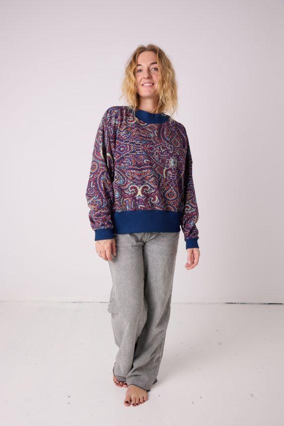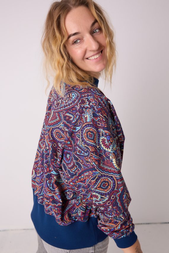 Bluza oversize Bali to jak mini wakacje, które możesz zabrać ze sobą wszędzie. Granaty, abstrakcyjne kształty i odrobina tajemnicy, jak fale odbijające światło księżyca. Luźny, oversize’owy krój otula Cię jak ciepły wiatr, a ściągacz przy dekolcie dodaje jej struktury i sprawia, że mimo luzu – wygląda stylowo. Brak kaptura pozwala łączyć ją także z bardziej eleganckimi elementami garderoby — wystarczy założyć cygaretki albo spódnicę i wciąż czujesz się wygodnie, ale wyglądasz jak miliony monet.