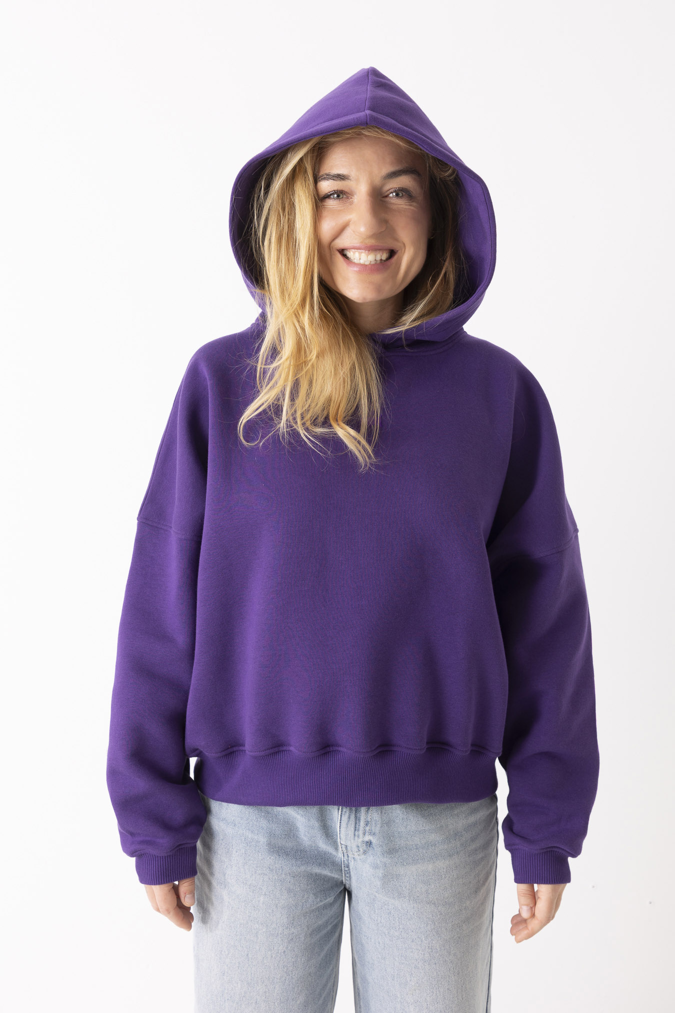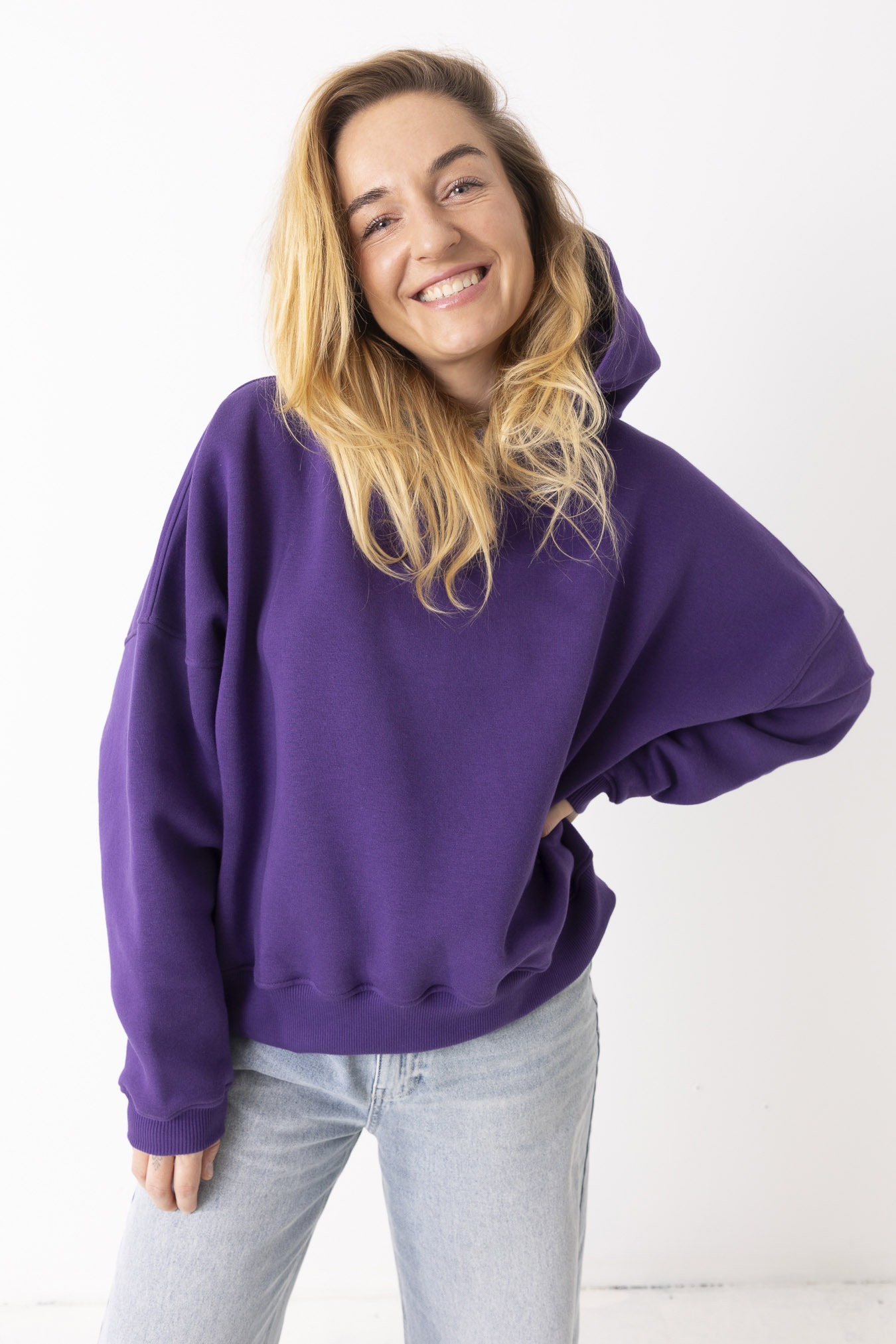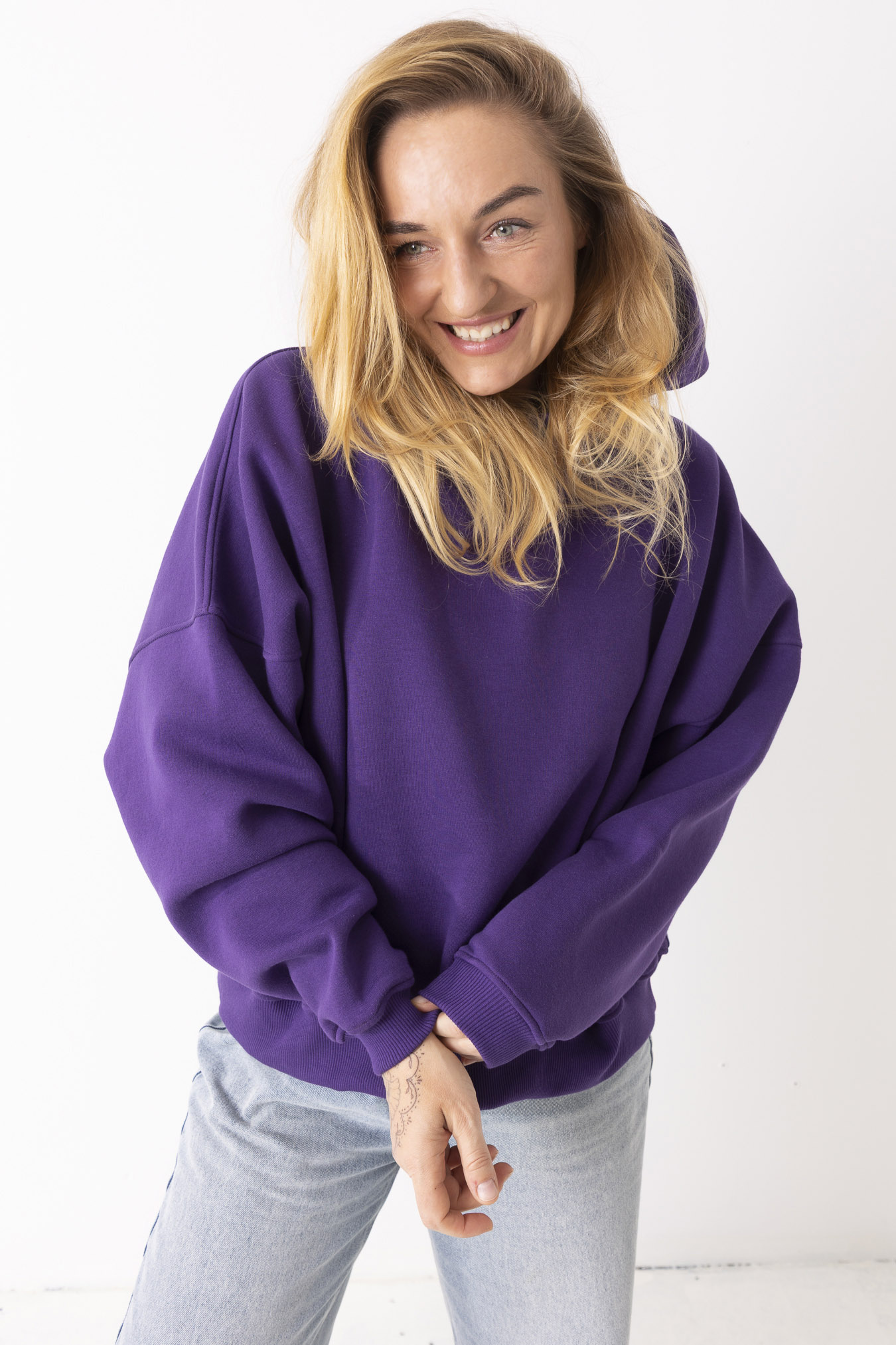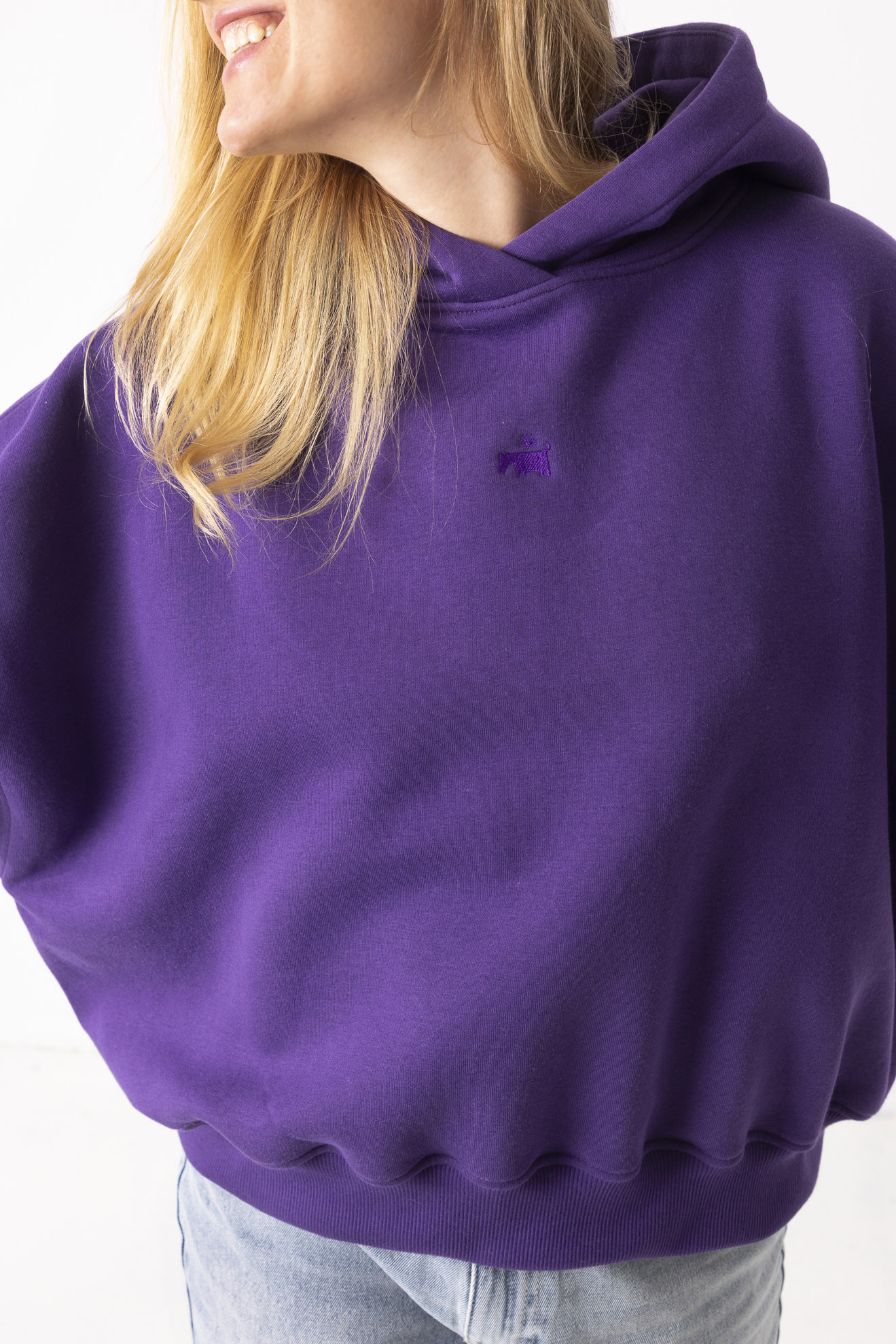Kiedy ją założysz, świat trochę zwalnia. Robi się ciszej, miękko i spokojniej. Fiolet otula jak wieczorne niebo – dodaje charakteru, ale nie krzyczy. Uszyta z mięsistej, polskiej dresówki drapanej, która przyjemnie grzeje i daje poczucie komfortu od pierwszego założenia. Obniżone ramiona i obszerny kaptur sprawiają, że możesz się w niej schować przed całym światem. To ta bluza, po którą sięgasz bez zastanowienia – na szybkie wyjście, spacer, kawę z przyjaciółką albo dzień, kiedy chcesz po prostu być „u siebie”. Niewielkie, haftowane logo w tonacji bluzy subtelnie dopełnia całość – detal, który nie narzuca się, ale zostaje w pamięci.