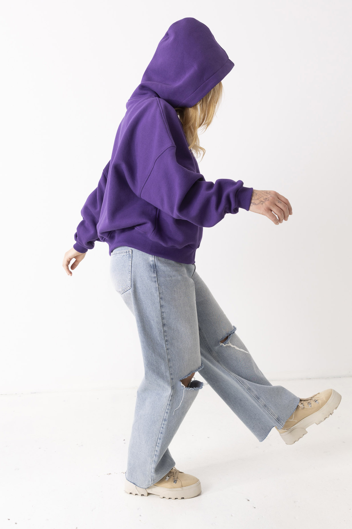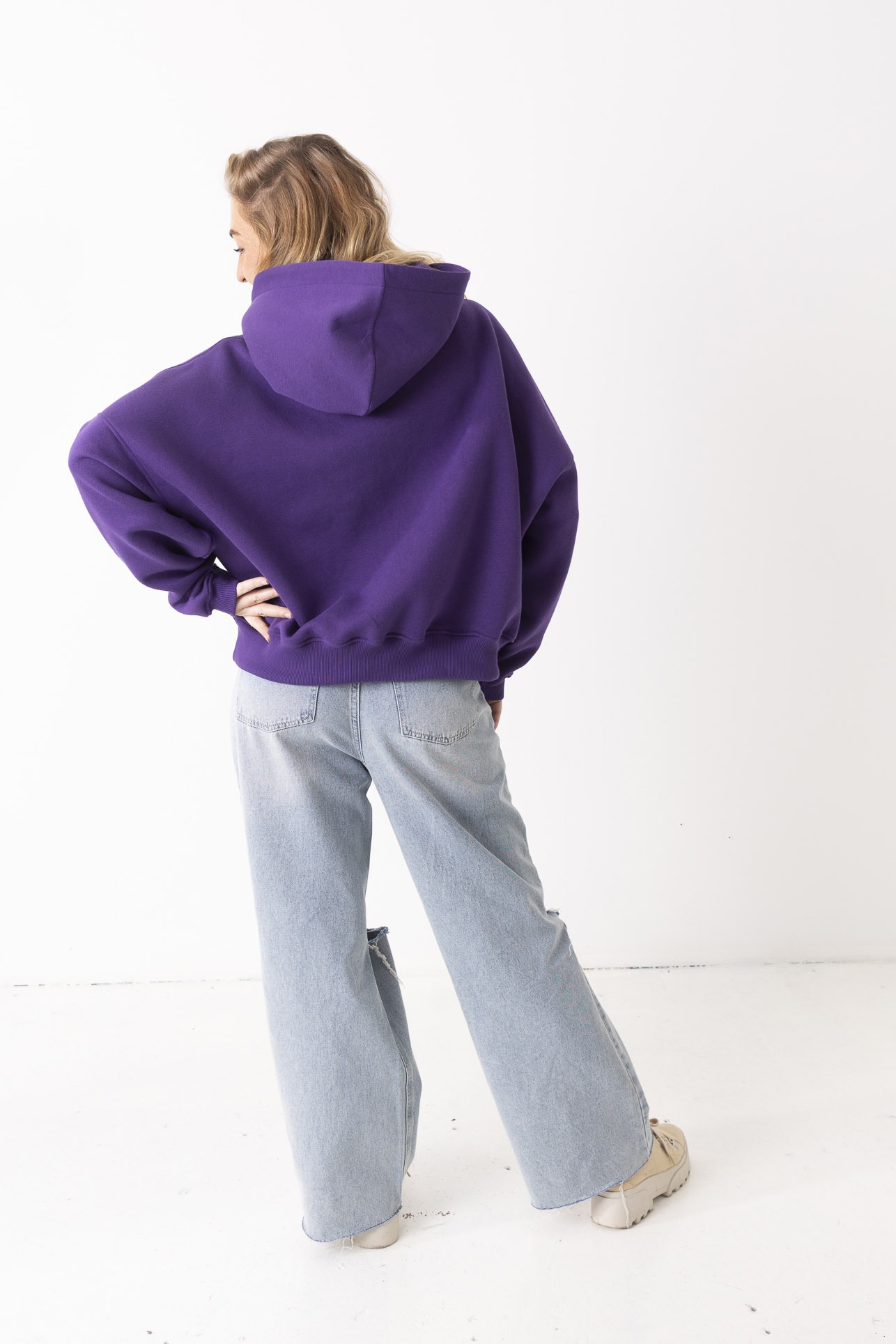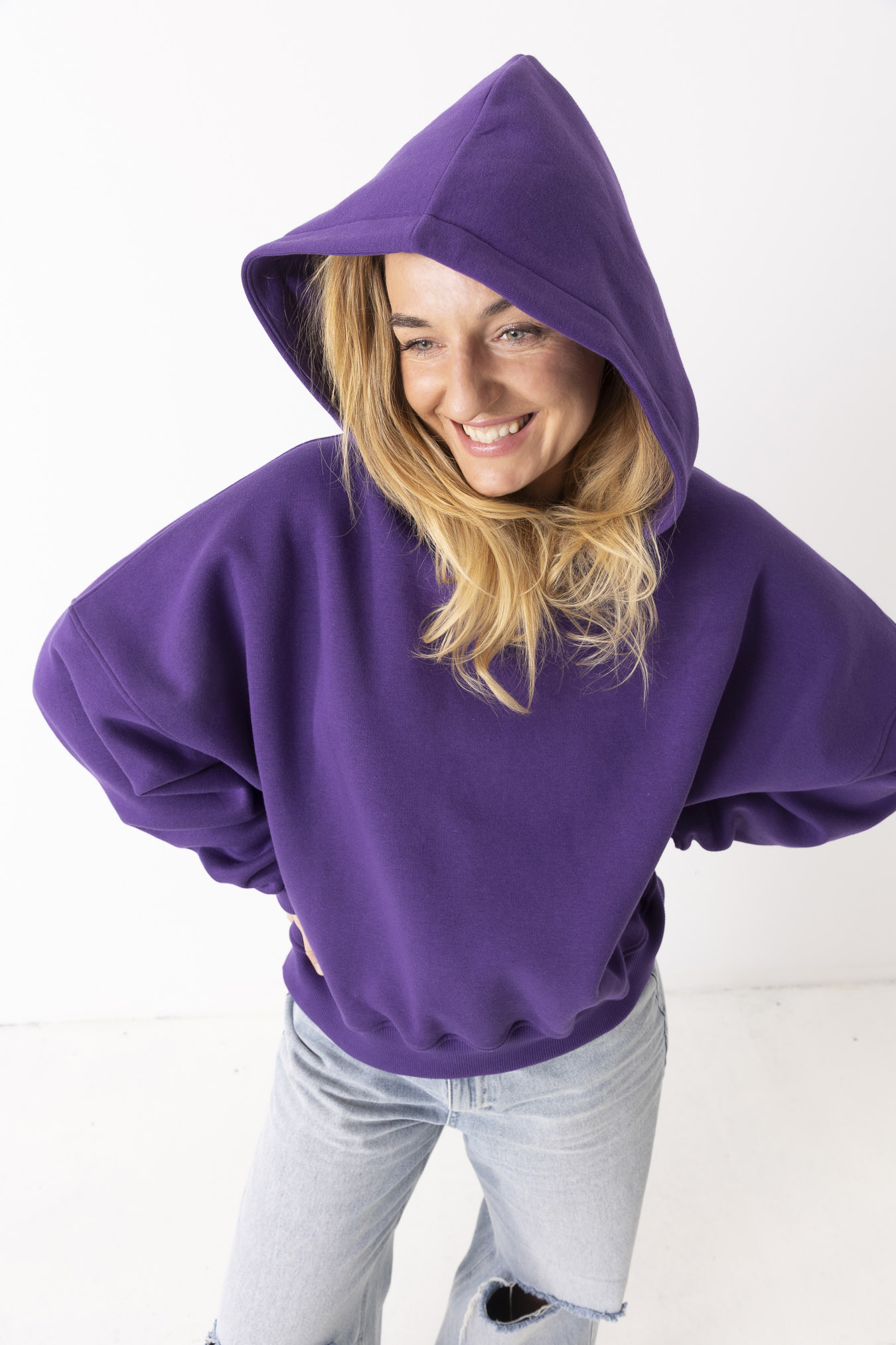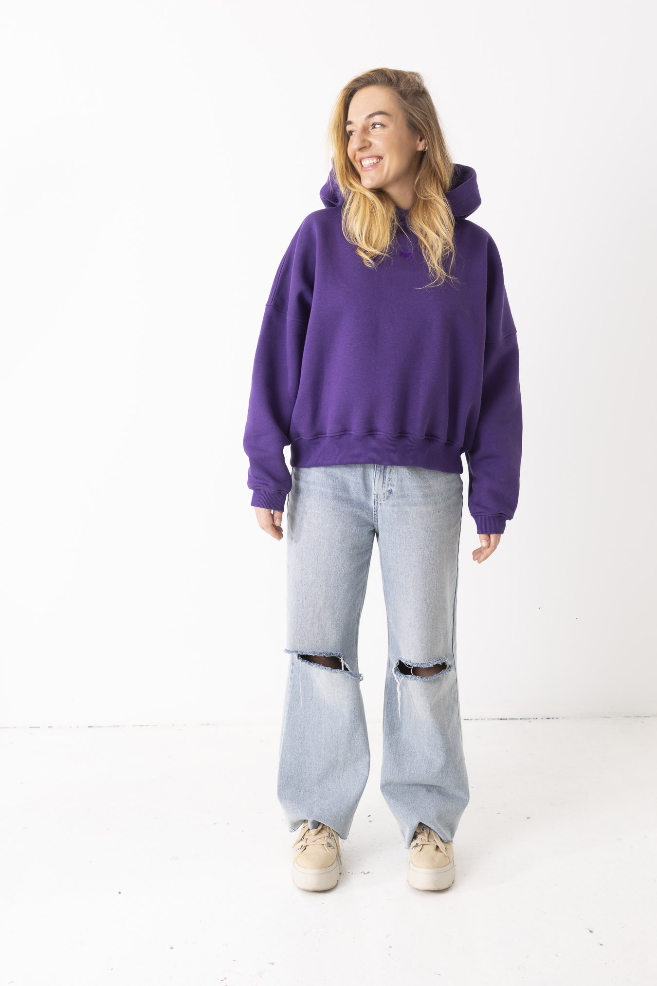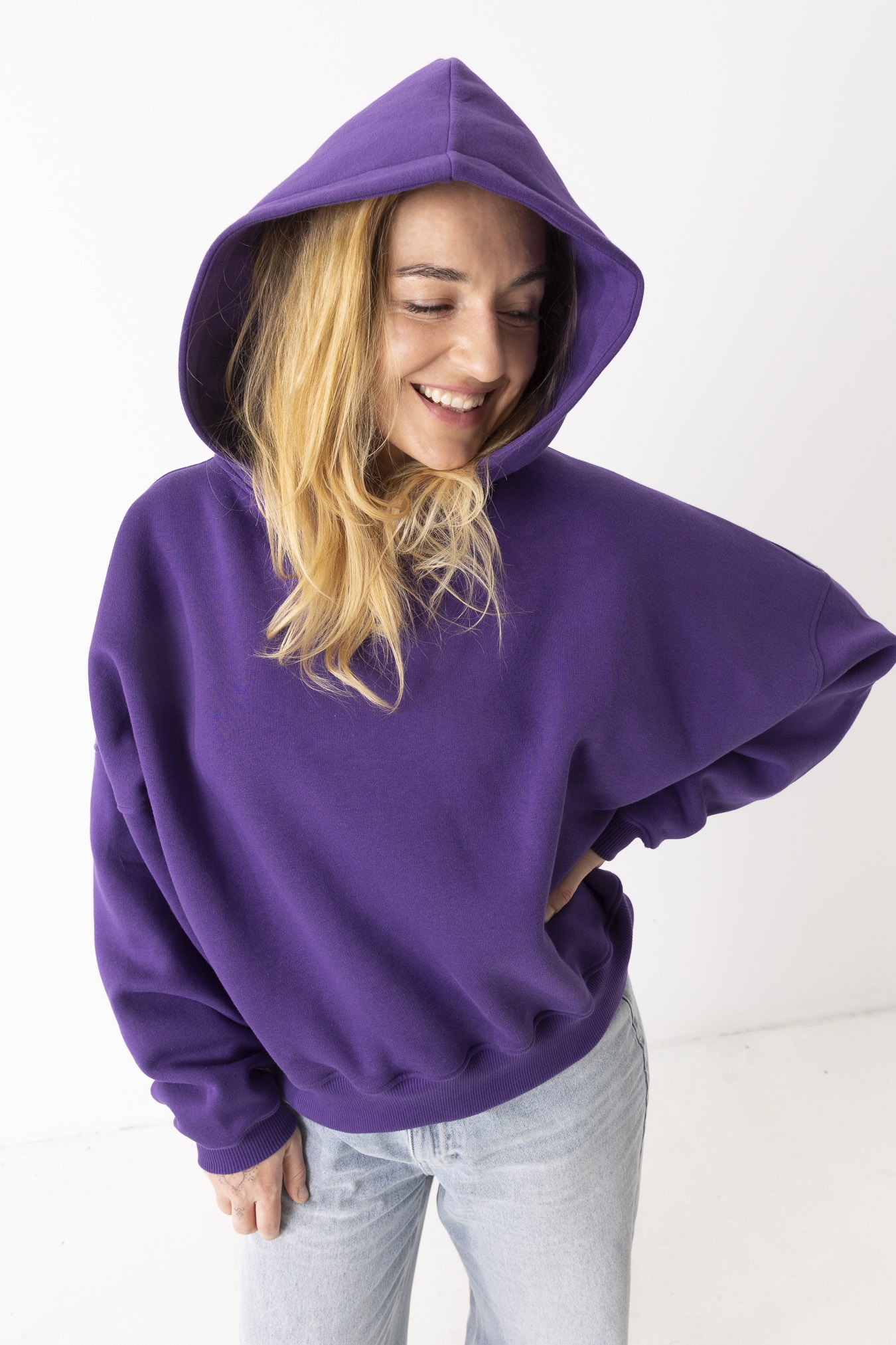 Kiedy ją założysz, świat trochę zwalnia. Robi się ciszej, miękko i spokojniej. Fiolet otula jak wieczorne niebo – dodaje charakteru, ale nie krzyczy. Uszyta z mięsistej, polskiej dresówki drapanej, która przyjemnie grzeje i daje poczucie komfortu od pierwszego założenia. Obniżone ramiona i obszerny kaptur sprawiają, że możesz się w niej schować przed całym światem. To ta bluza, po którą sięgasz bez zastanowienia – na szybkie wyjście, spacer, kawę z przyjaciółką albo dzień, kiedy chcesz po prostu być „u siebie”. Niewielkie, haftowane logo w tonacji bluzy subtelnie dopełnia całość – detal, który nie narzuca się, ale zostaje w pamięci.