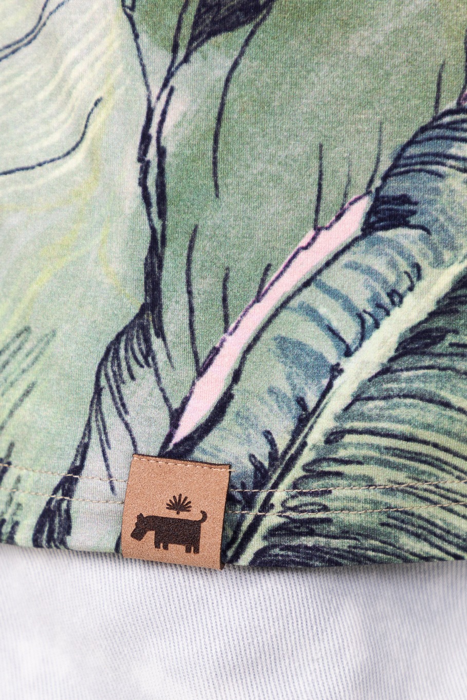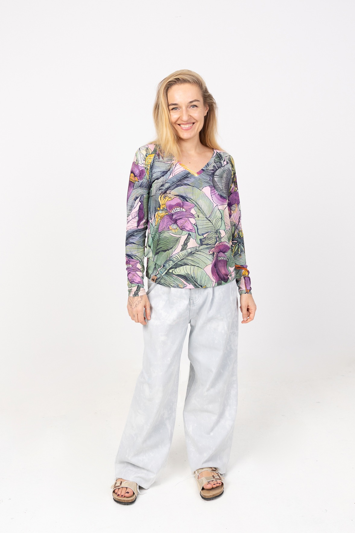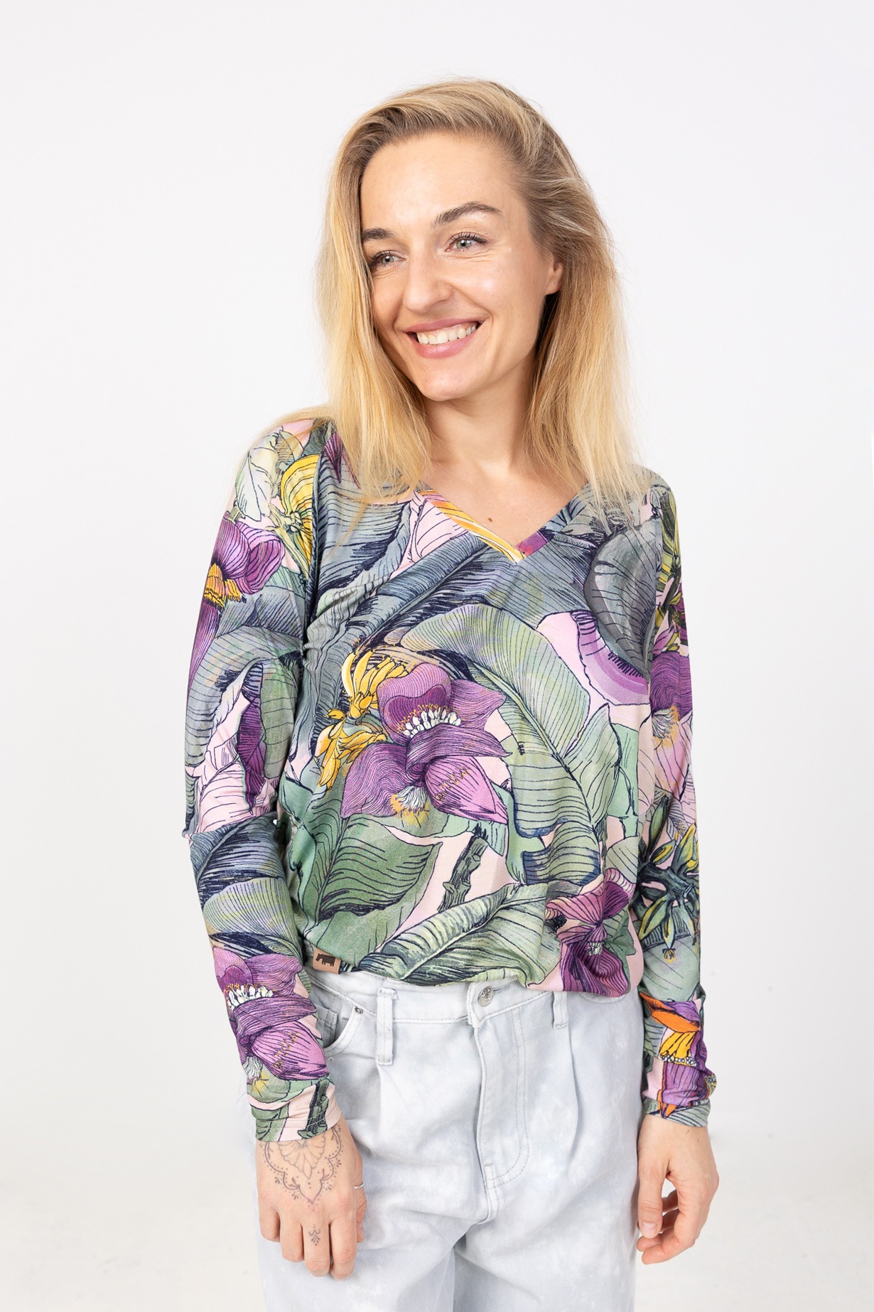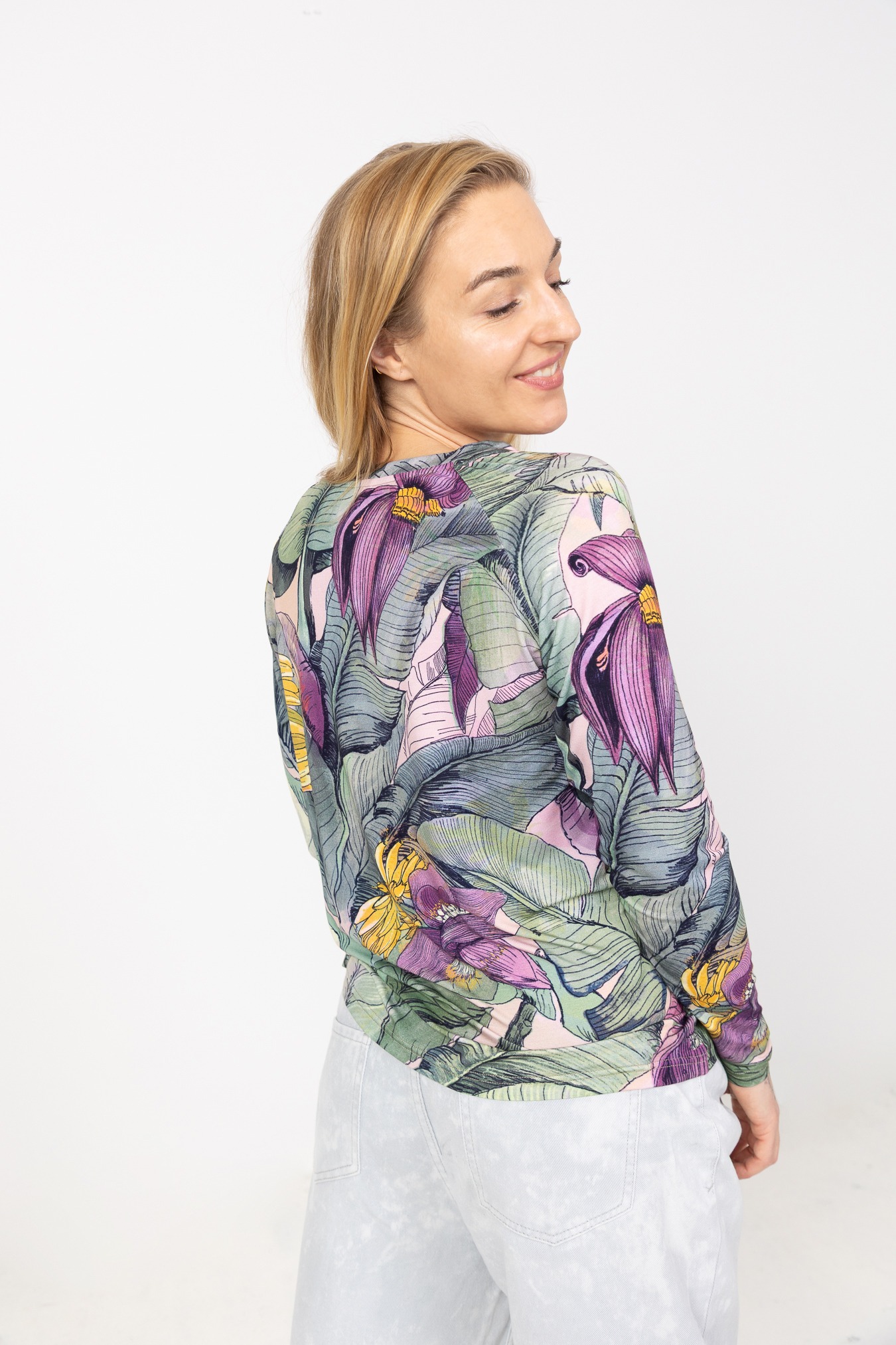 Bluza oversize Banany to czysta radość zamknięta w kolorach. Soczysty róż, słoneczny żółty, liście bananowca i owoce tworzą wzór, który od razu poprawia nastrój — jak krótki wyjazd w ciepłe miejsce, nawet jeśli za oknem zwykły dzień. Jej swobodny krój miękko układa się na sylwetce, a dekolt w serek subtelnie wydłuża szyję i dodaje lekkości całej formie. Możesz nosić ją wypuszczoną lub wpuszczoną – za każdym razem tworzy trochę inny charakter stylizacji, ale zawsze wygląda równie dobrze.