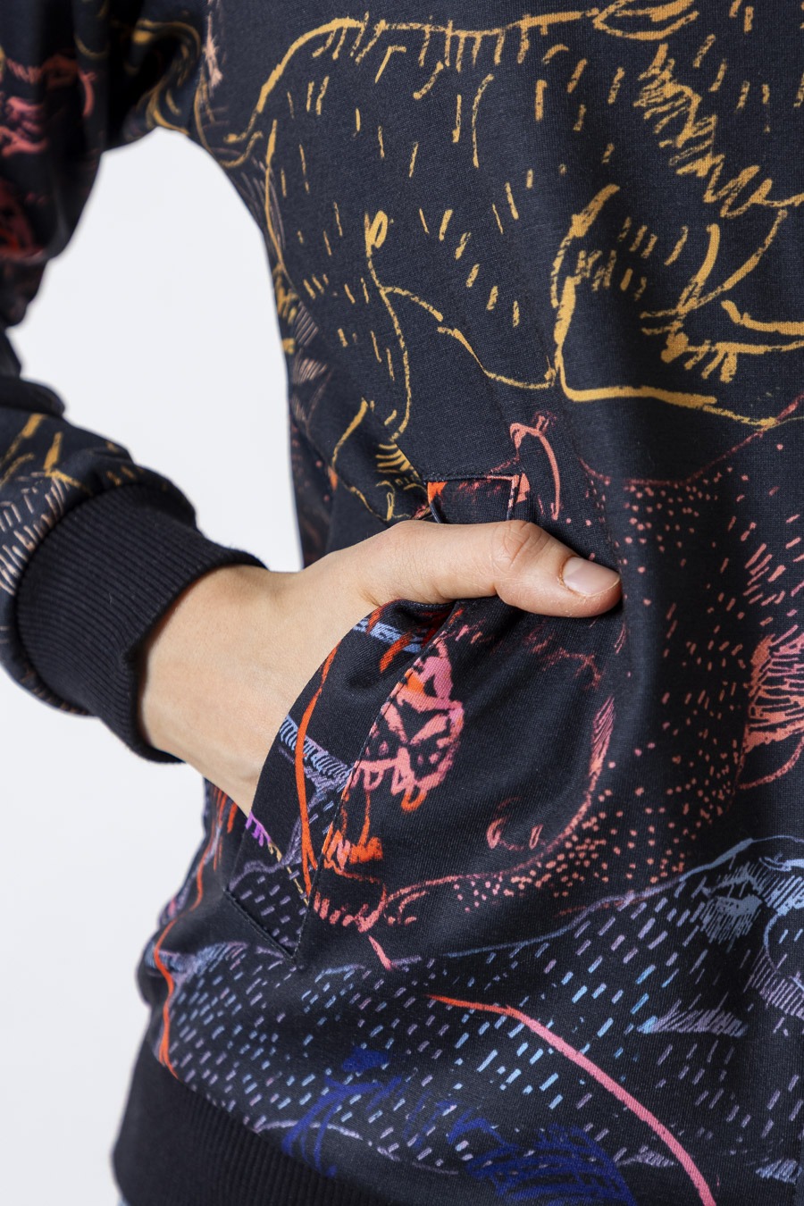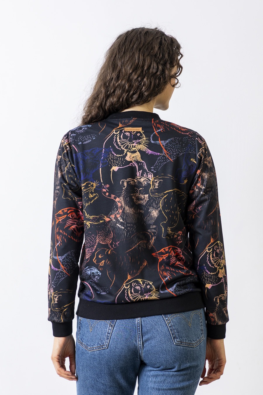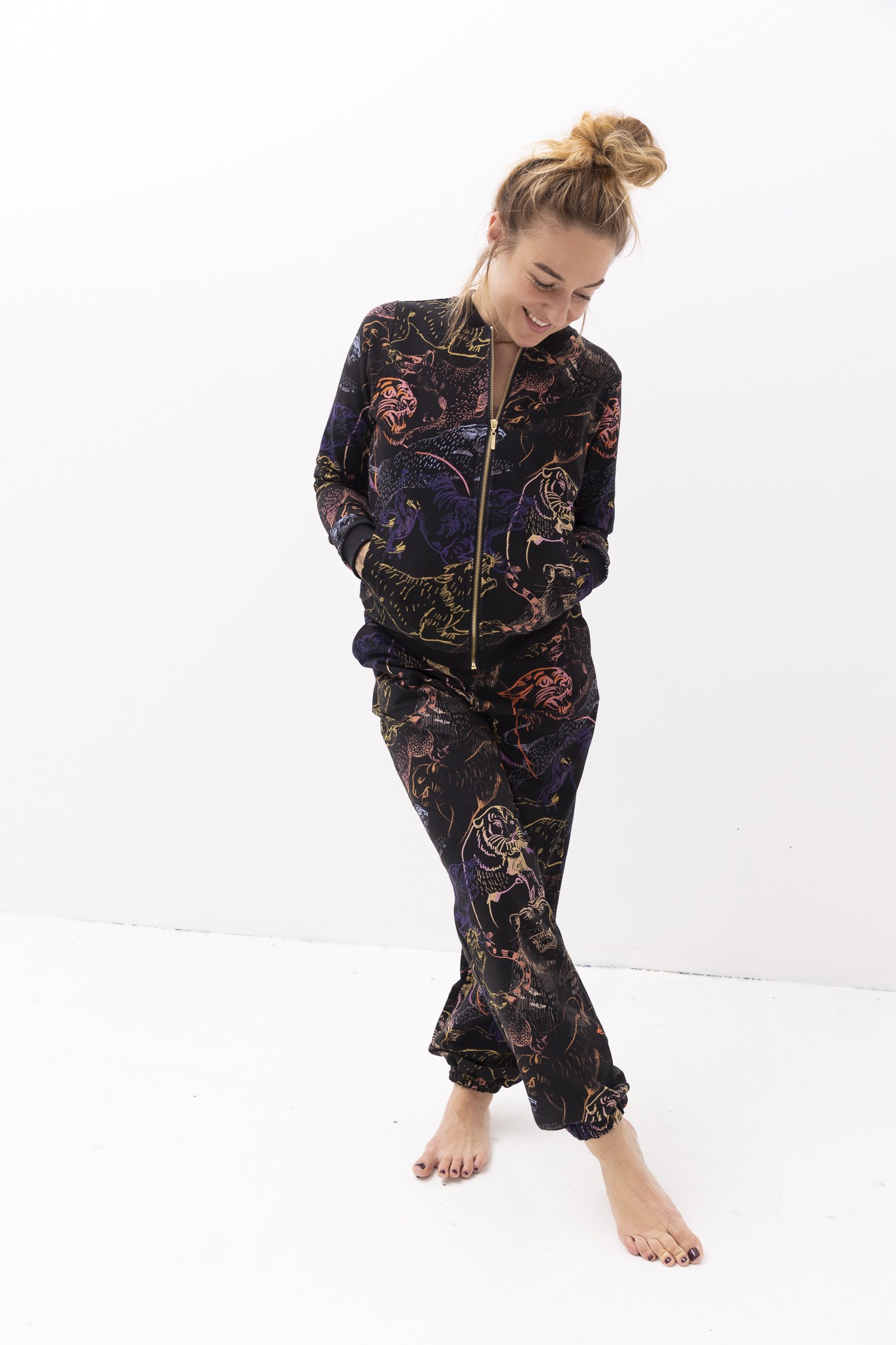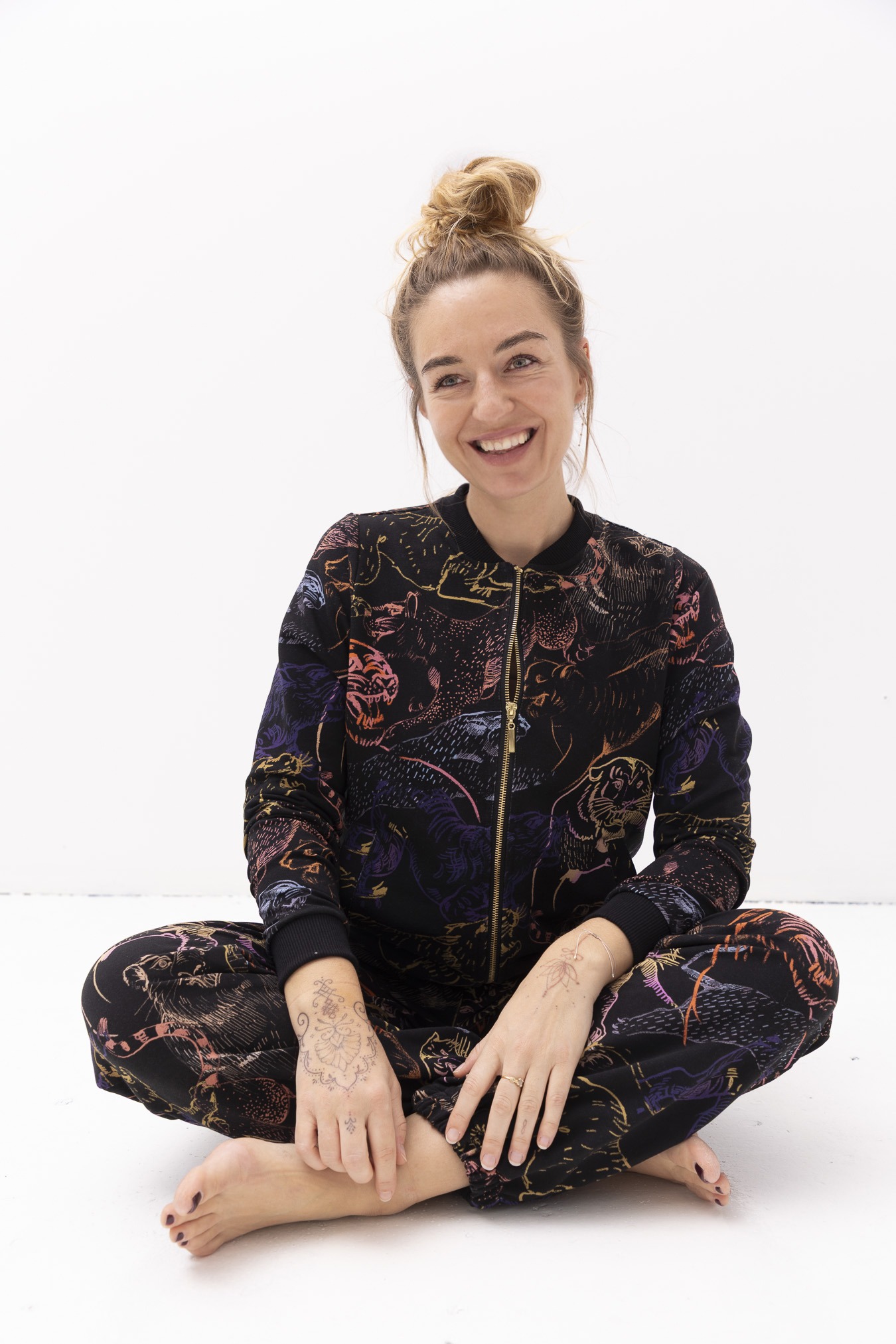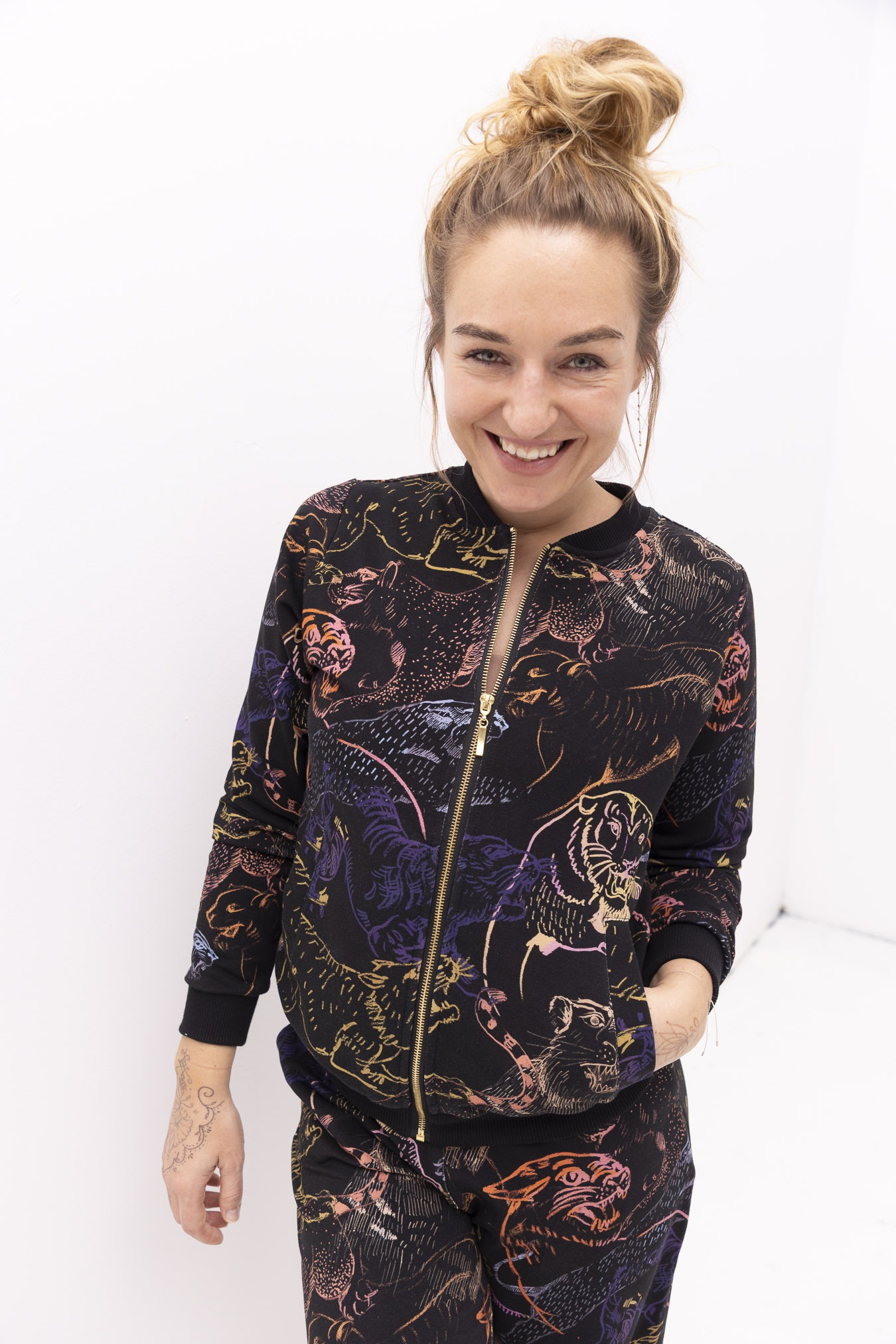 Z tym wzorem komfort i charakter mogą iść w parze. Ta kombinacja kolorów i kształtów to wspomnienie z podróży, które Jaśmina przełożyła na wzór, czyniąc tę kurtkę wyjątkową. Bawełniana bomberka ma krój sięgający bioder. Całość zapinana na zamek błyskawiczny. Zakończona wygodnym ściągaczem, który nadaje jej lekko sportowy charakter. Ściągacz znajduje się także przy rękawach, by zapewnić komfort w chłodniejsze poranki. Tworzy total look z naszymi spodniami Jogger w tym samym wzorze.