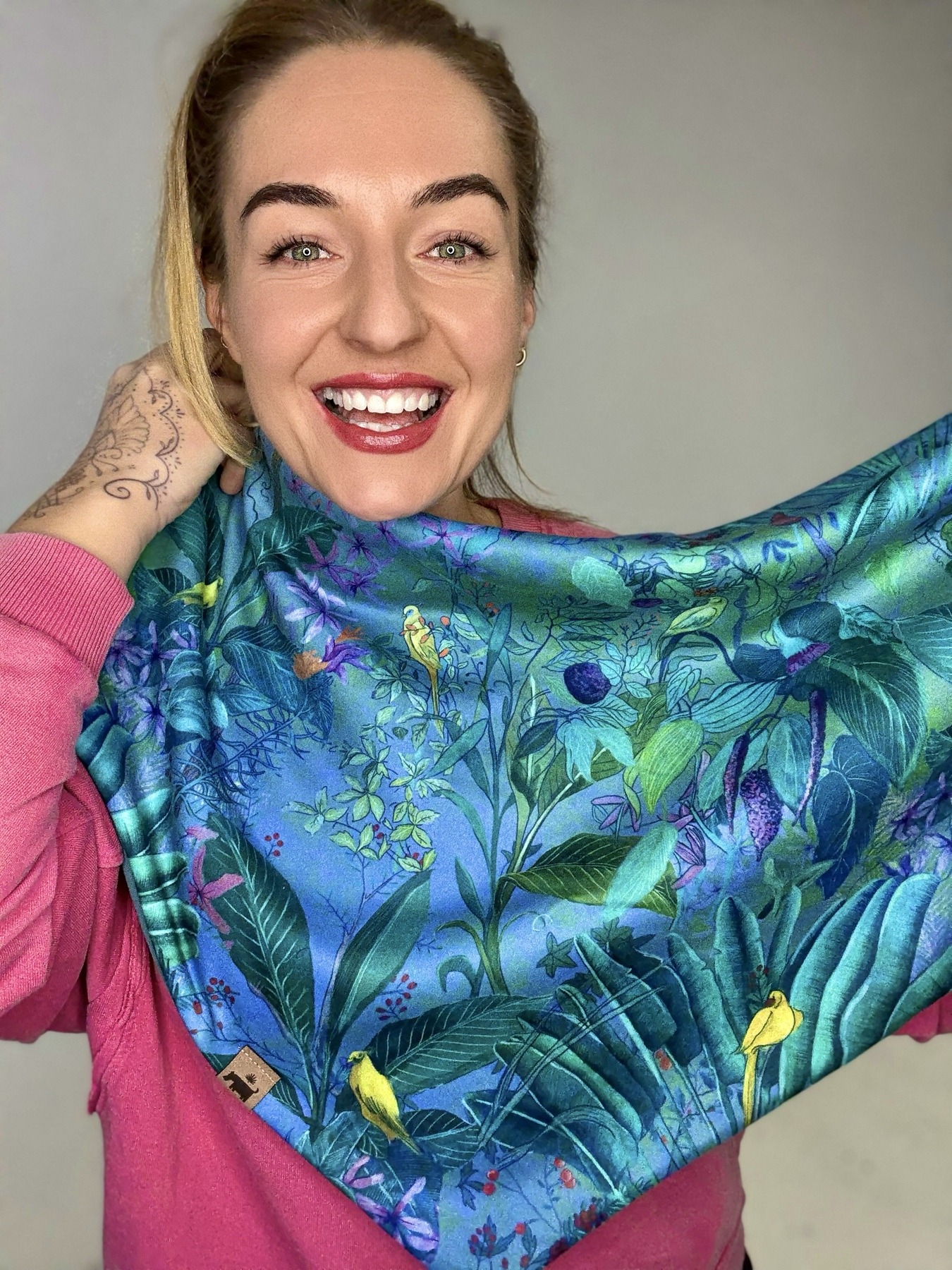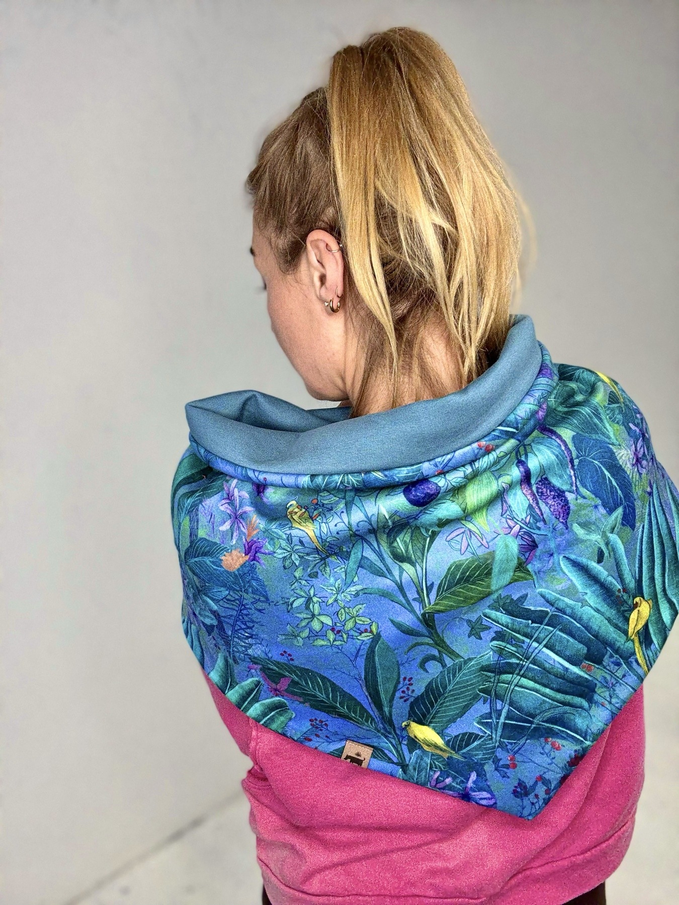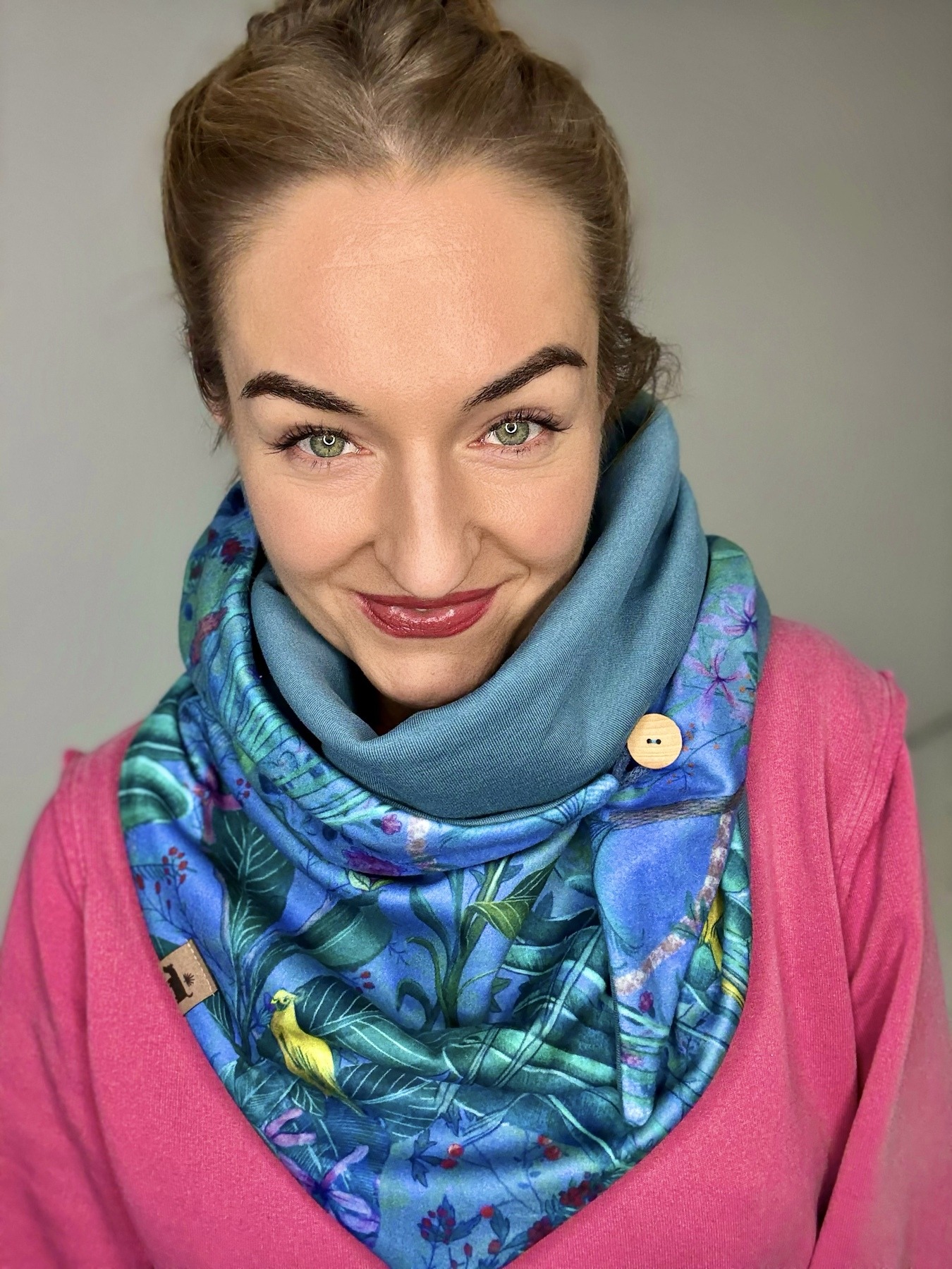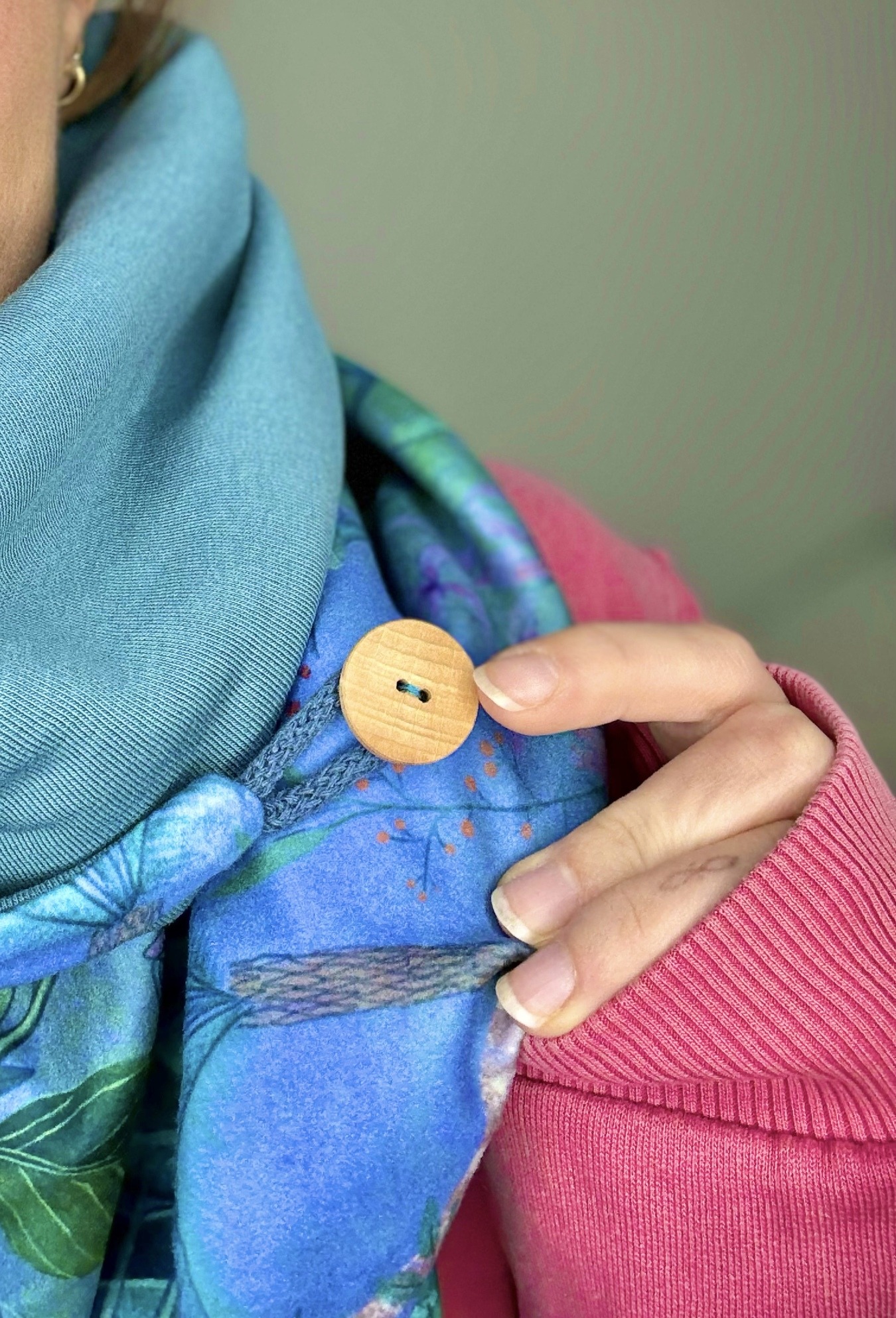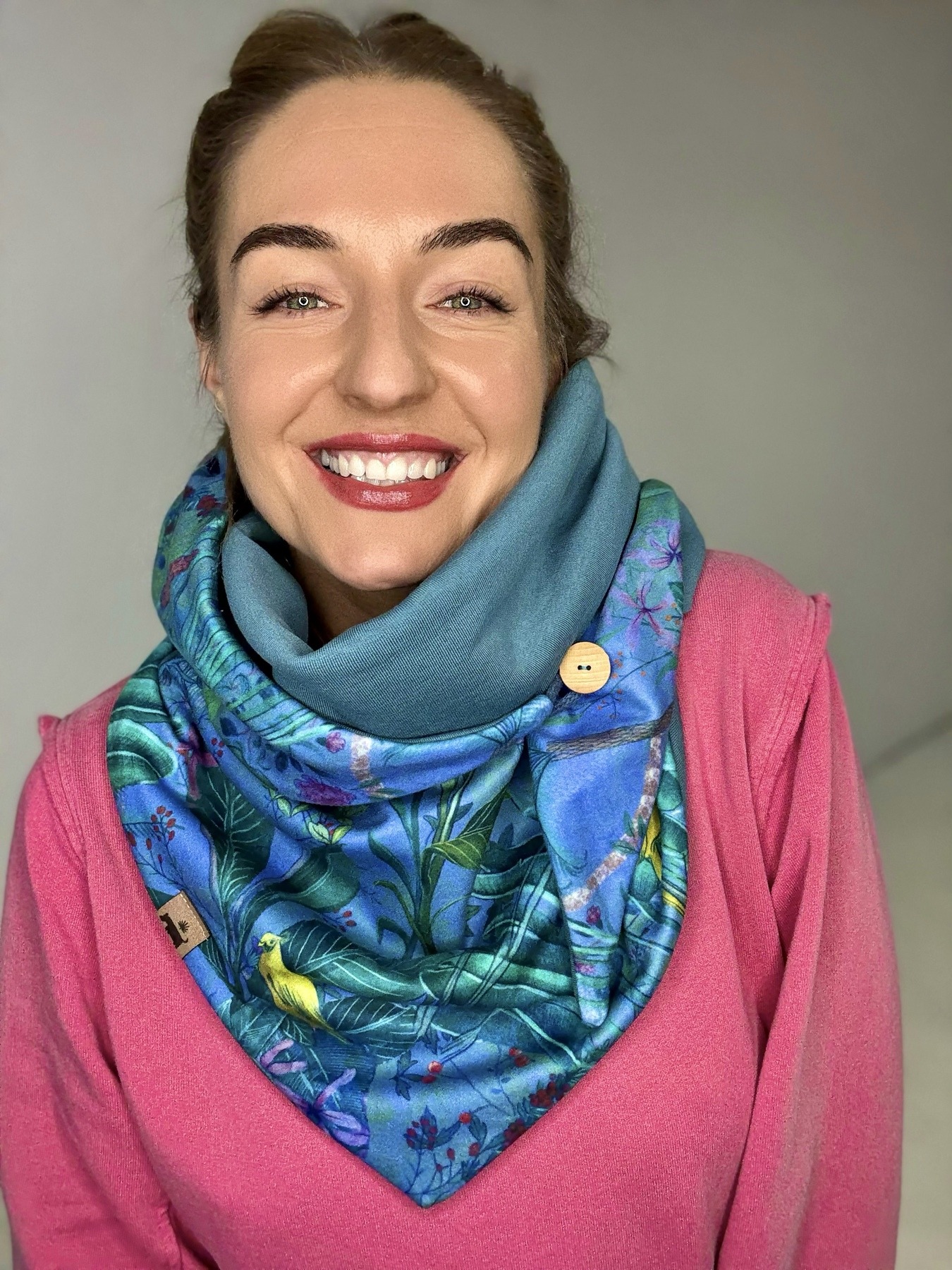 To nieodzowny dodatek w chłodniejsze miesiące. Sprytny kształt trójkąta równoramiennego elegancko układa się na ramionach, a wygodny system zapięcia na guziki i pętelki utrzymuje go na miejscu bez konieczności ciągłego poprawiania. Jedna strona wykonana jest z luksusowo miękkiej dzianiny dresowej, która jest niezwykle przyjemna w dotyku – idealna na chwile, kiedy potrzebujesz otulić się ciepłem. Wzór Arjuna Blue otuli Cię kojącymi odcieniami błękitu, przywodzącymi na myśl spokój głębokich wód i bezkresnego nieba.