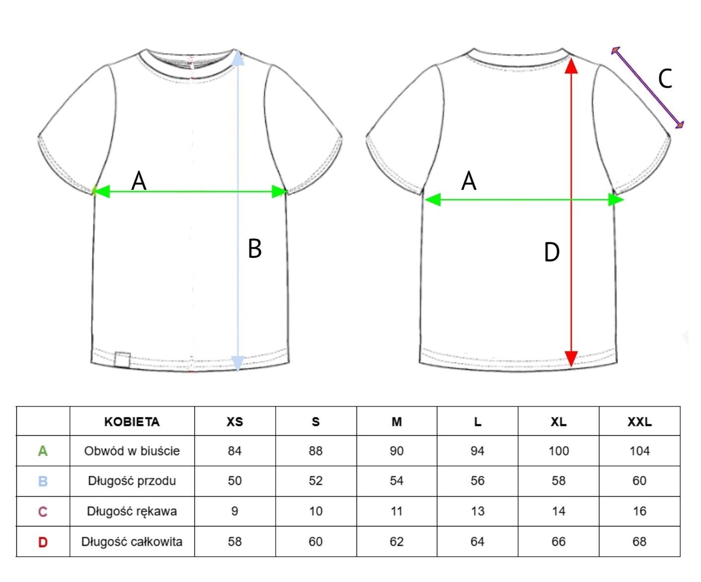 Koszulkę uszyliśmy z wysokiej jakości materiału o składzie: bawełna 95%, elastan 5%, dzięki czemu dzianina jest lekko elastyczna. Modelka ma na sobie rozmiar M.
