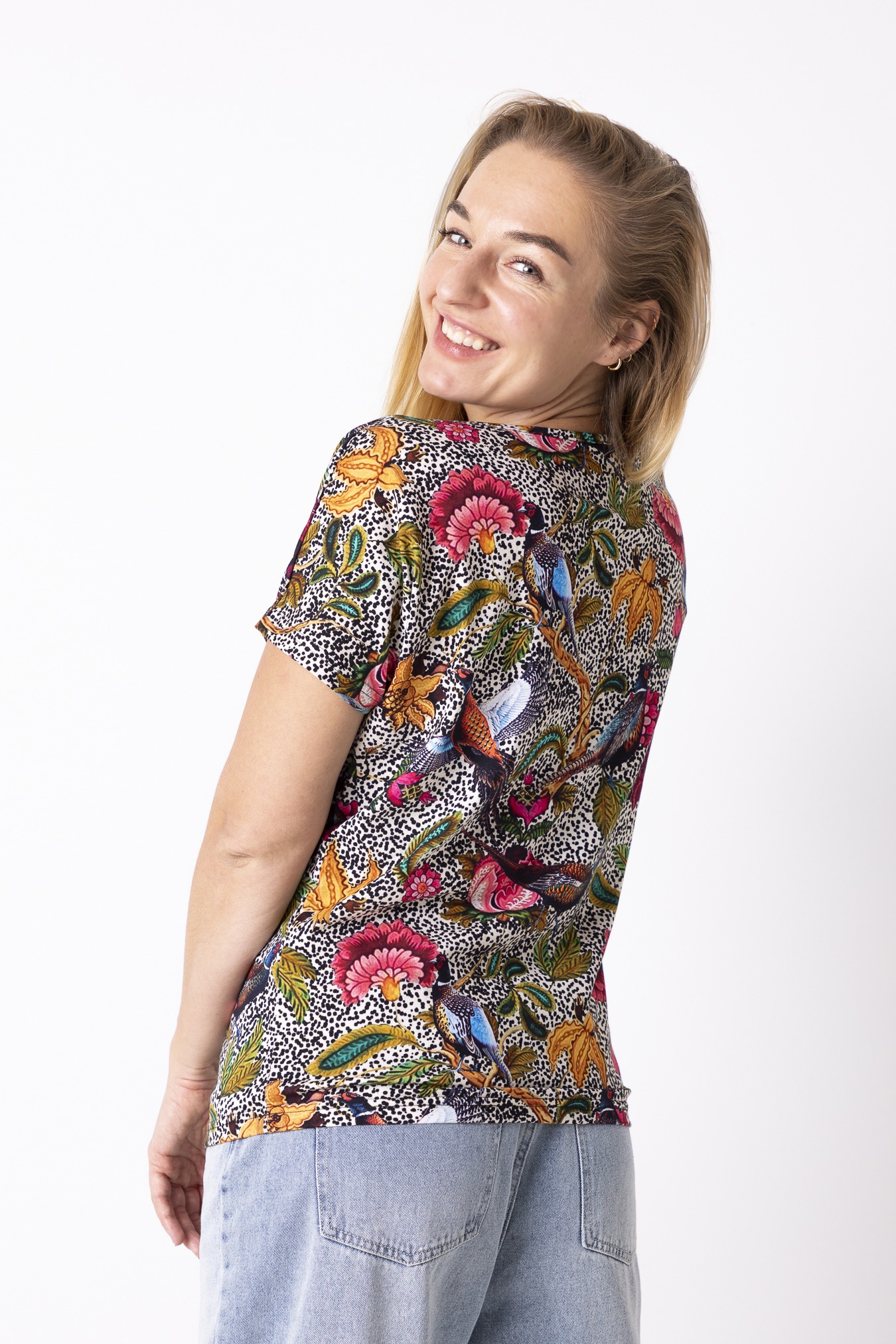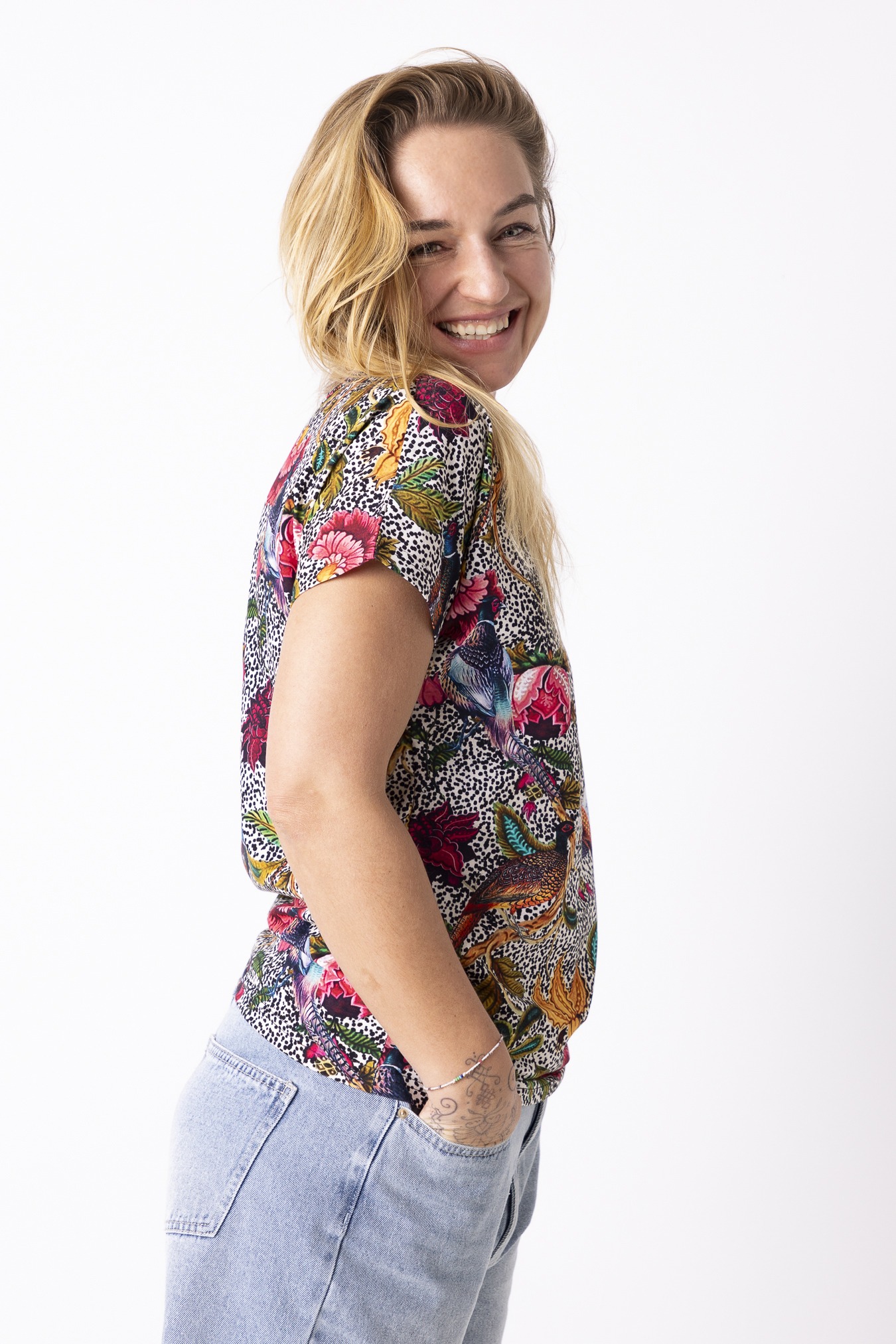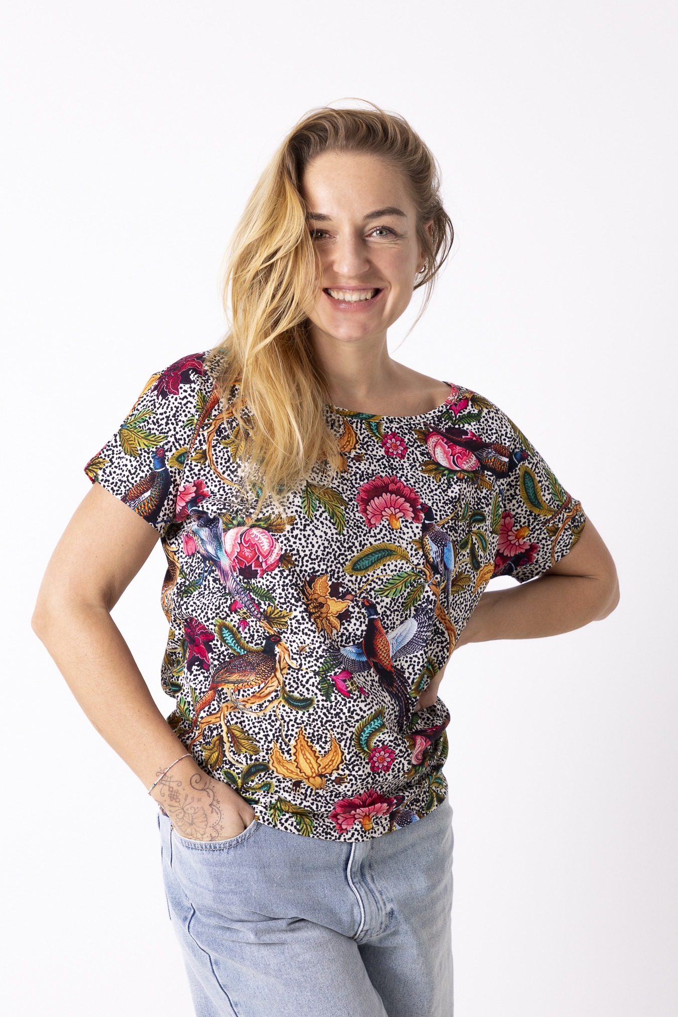 W tym wzorze zamknęliśmy uczucie wędrowania po kwitnących łąkach w idealny letni dzień. Koszulka, która dopasuje się do Ciebie – nie odwrotnie. Podwinięte rękawki? Nadają całości lekkości i nonszalanckiego, casualowego looku. A do tego ta miękka, 100% bawełna – otula ciało, pięknie się układa i sprawia, że chcesz ją nosić bez przerwy.