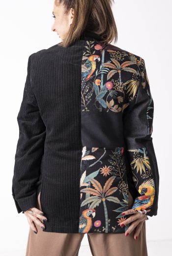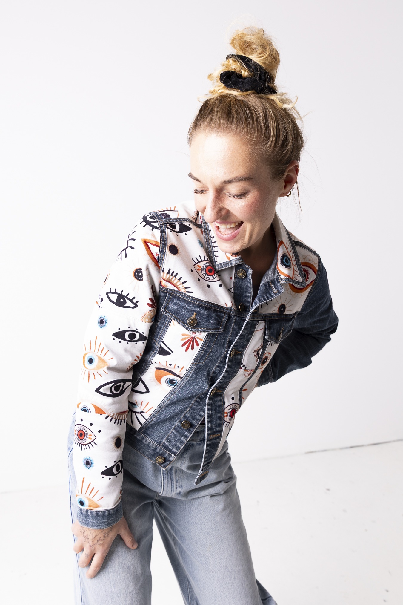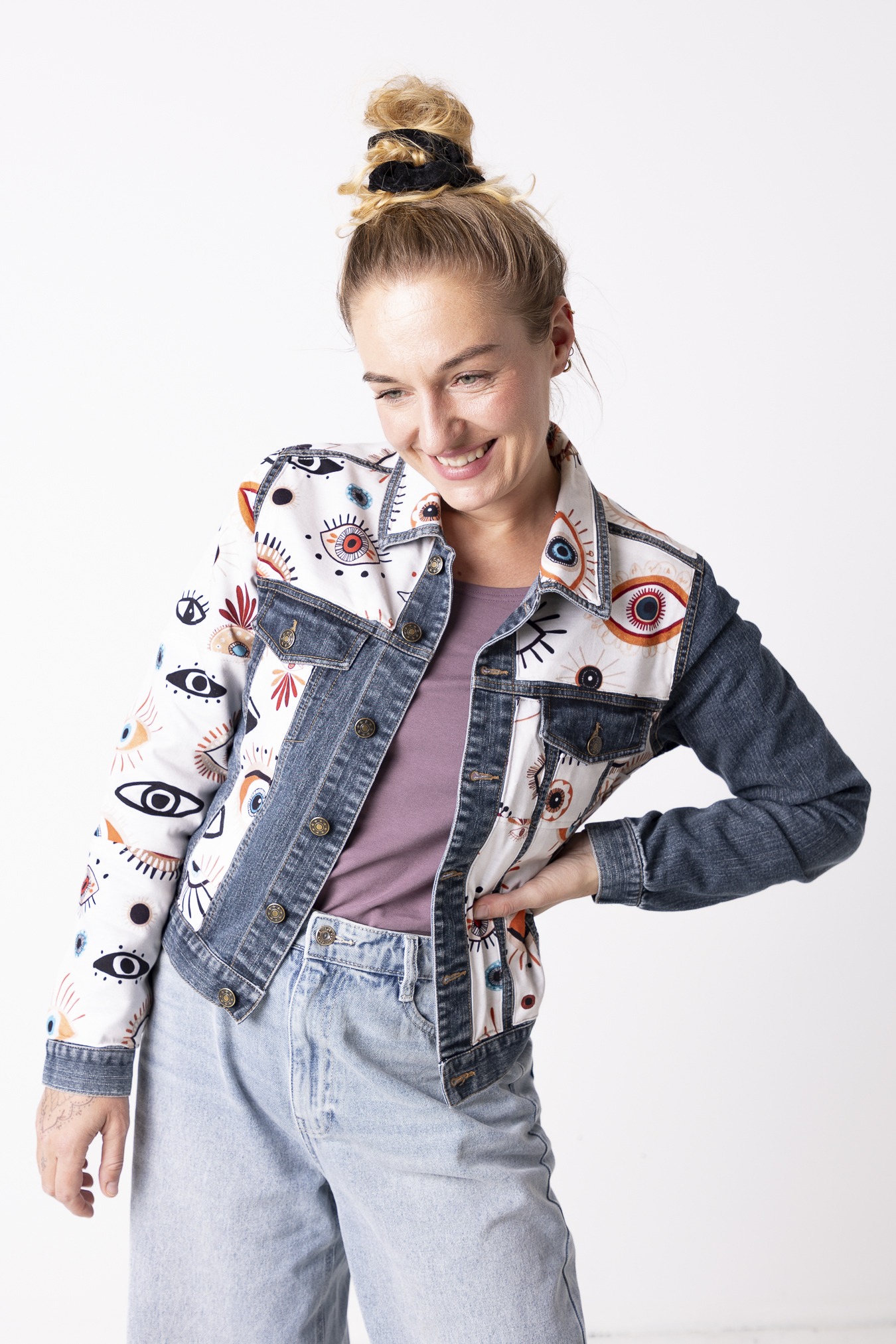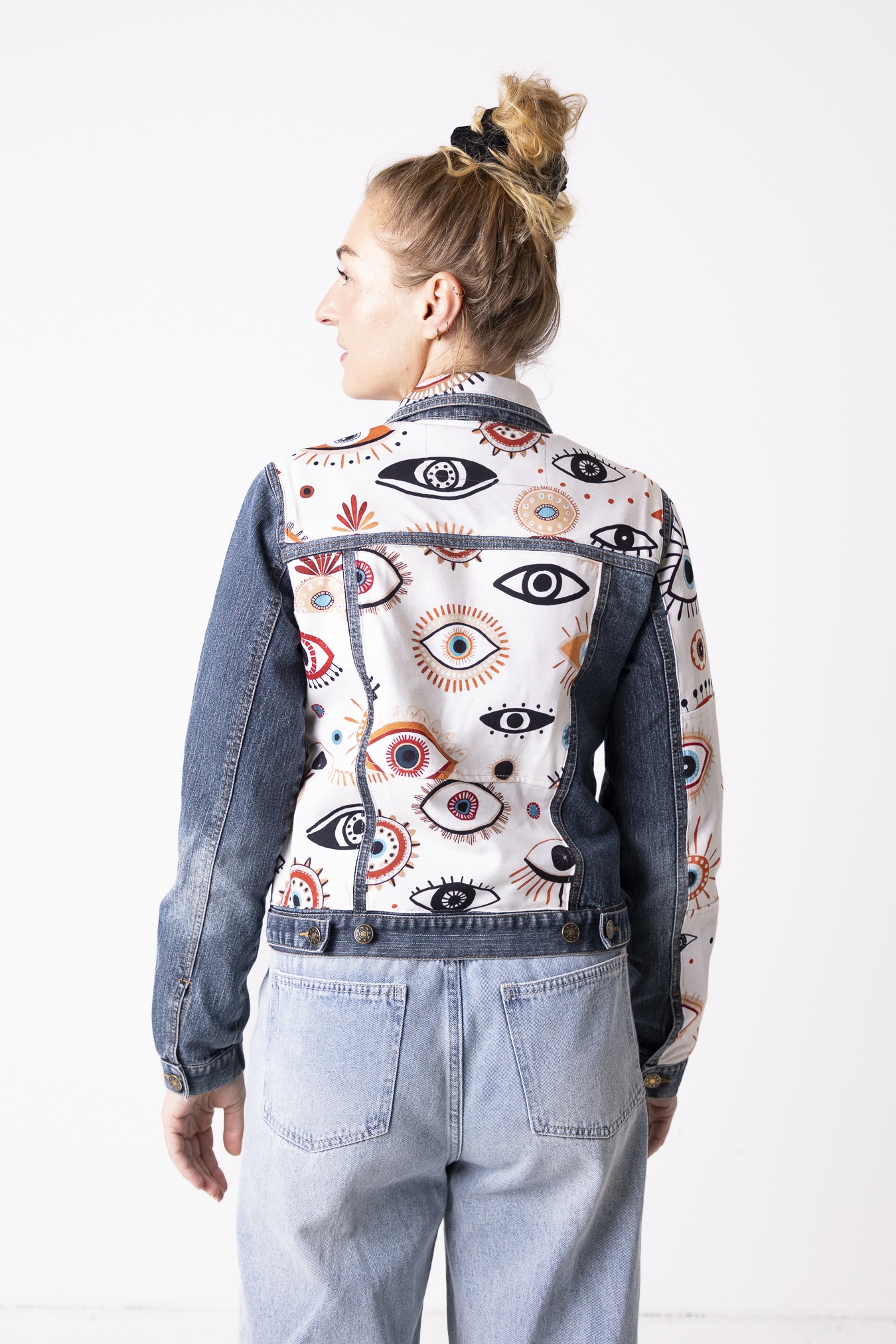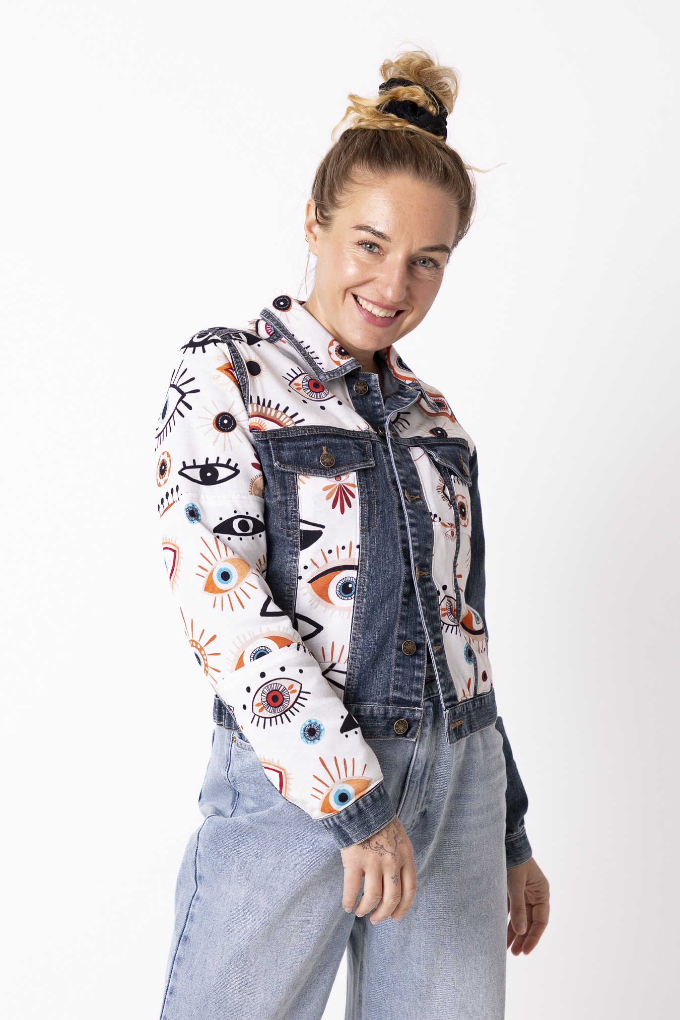 Każdy egzemplarz różni się detalami i układem wstawek — dlatego jest jedyna w swoim rodzaju. Forma denimowej kurtki przełamana wstawkami ze wzorem Ojo Blanco, uszyta z solidnego jeansu. Jest trwała, wygodna i dobrze układa się na sylwetce. Dzięki ponadczasowemu fasonowi można ją nosić przez wiele sezonów — zarówno w codziennych stylizacjach z t-shirtem i spodniami, jak i jako mocny akcent do prostych, minimalistycznych zestawów.
