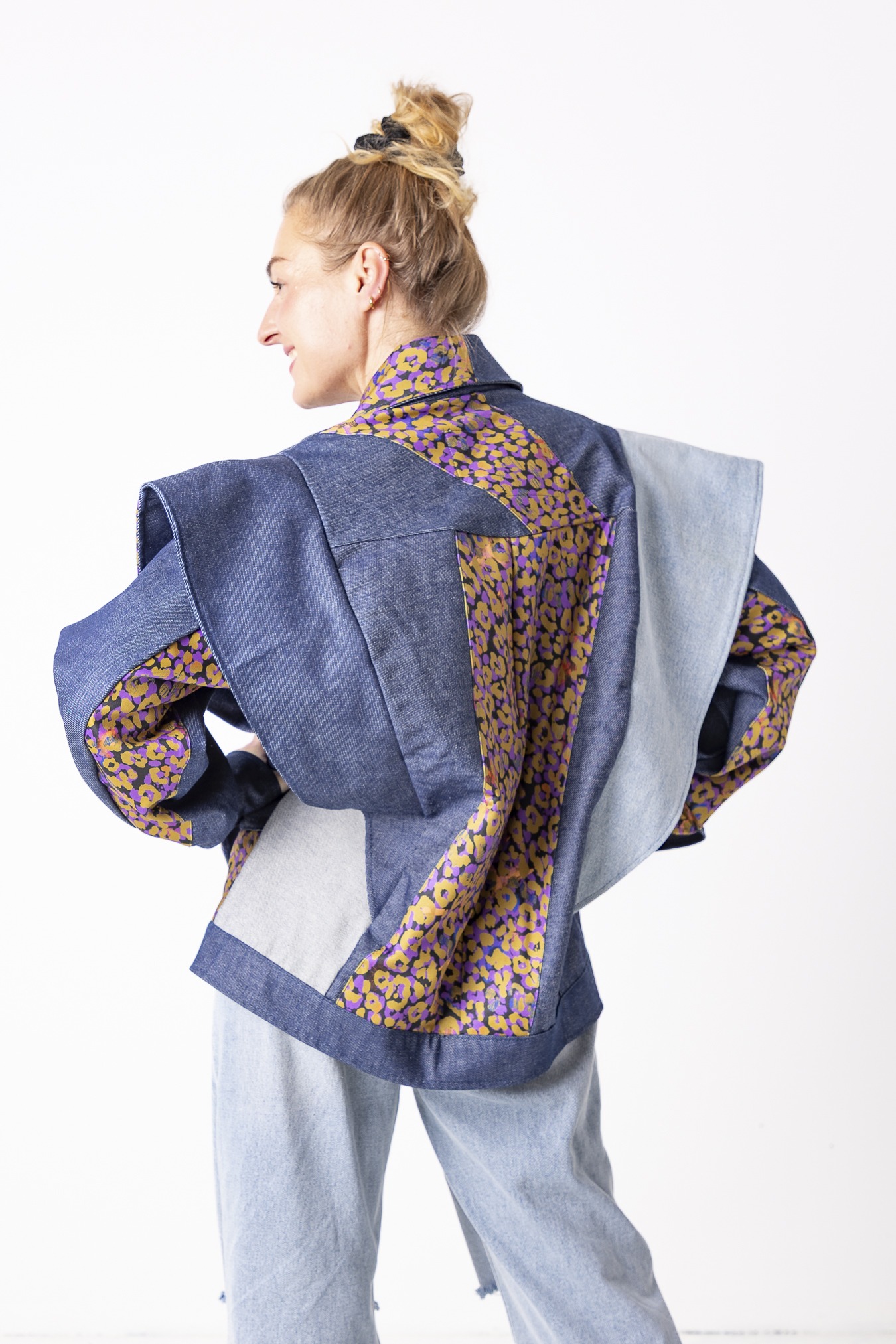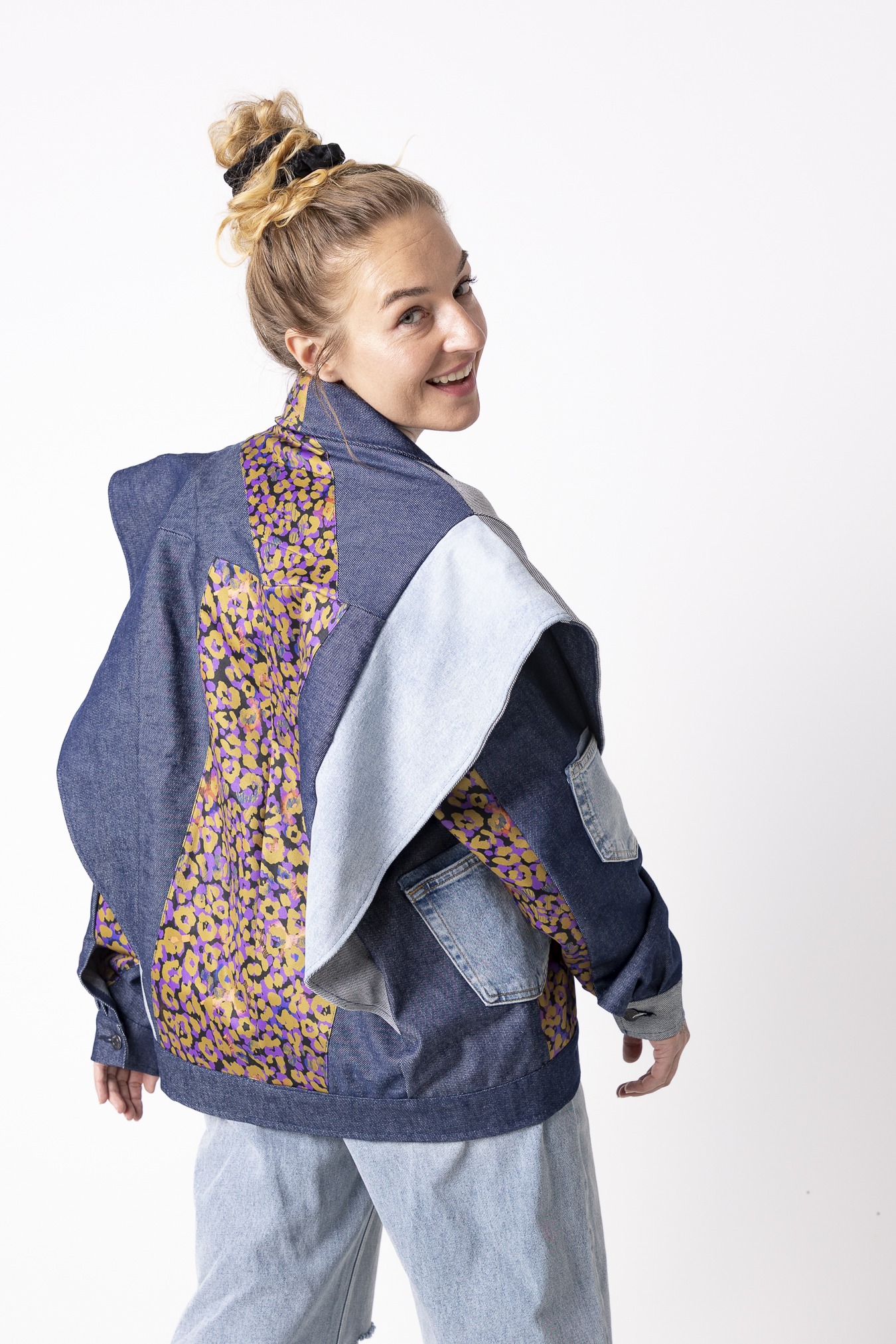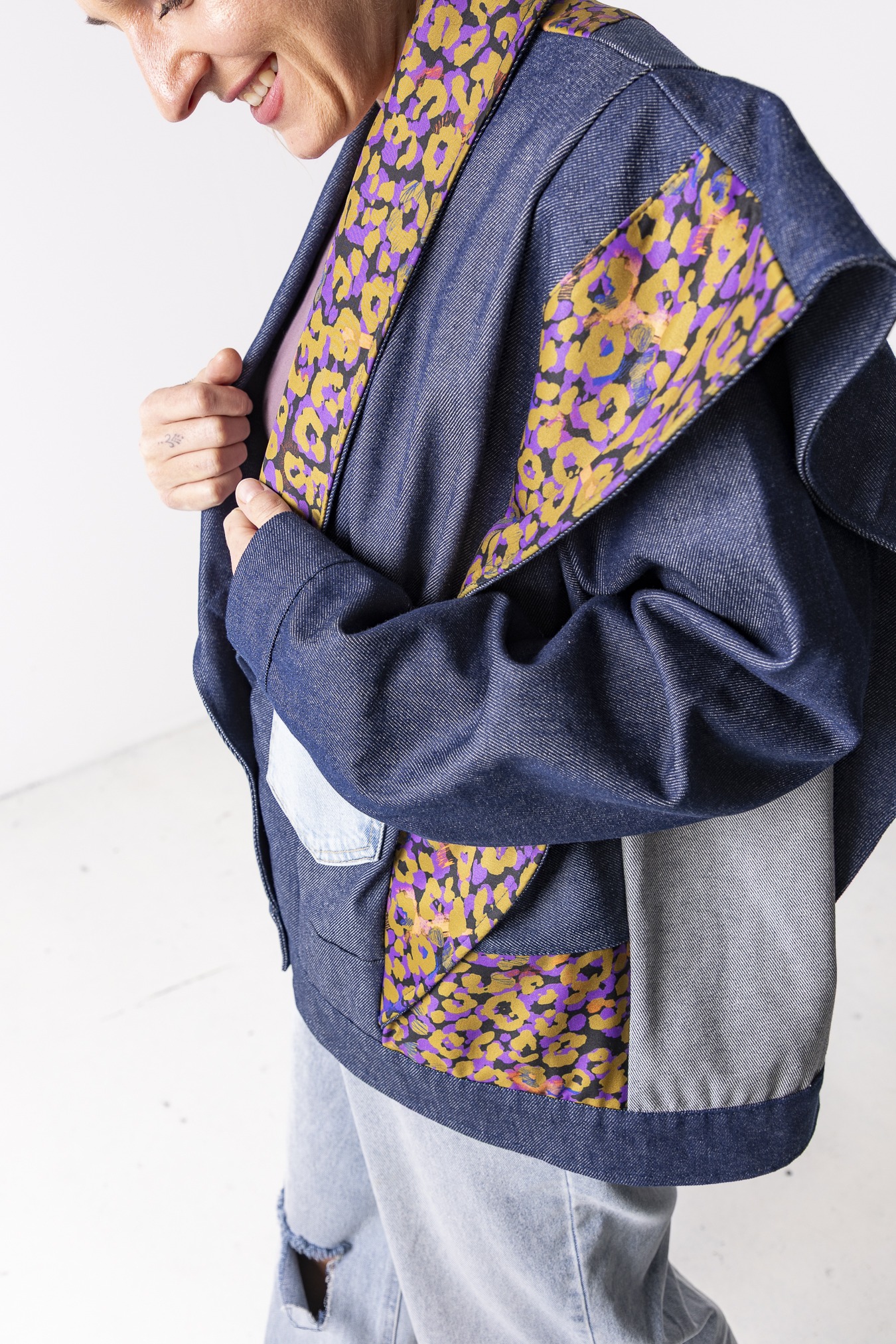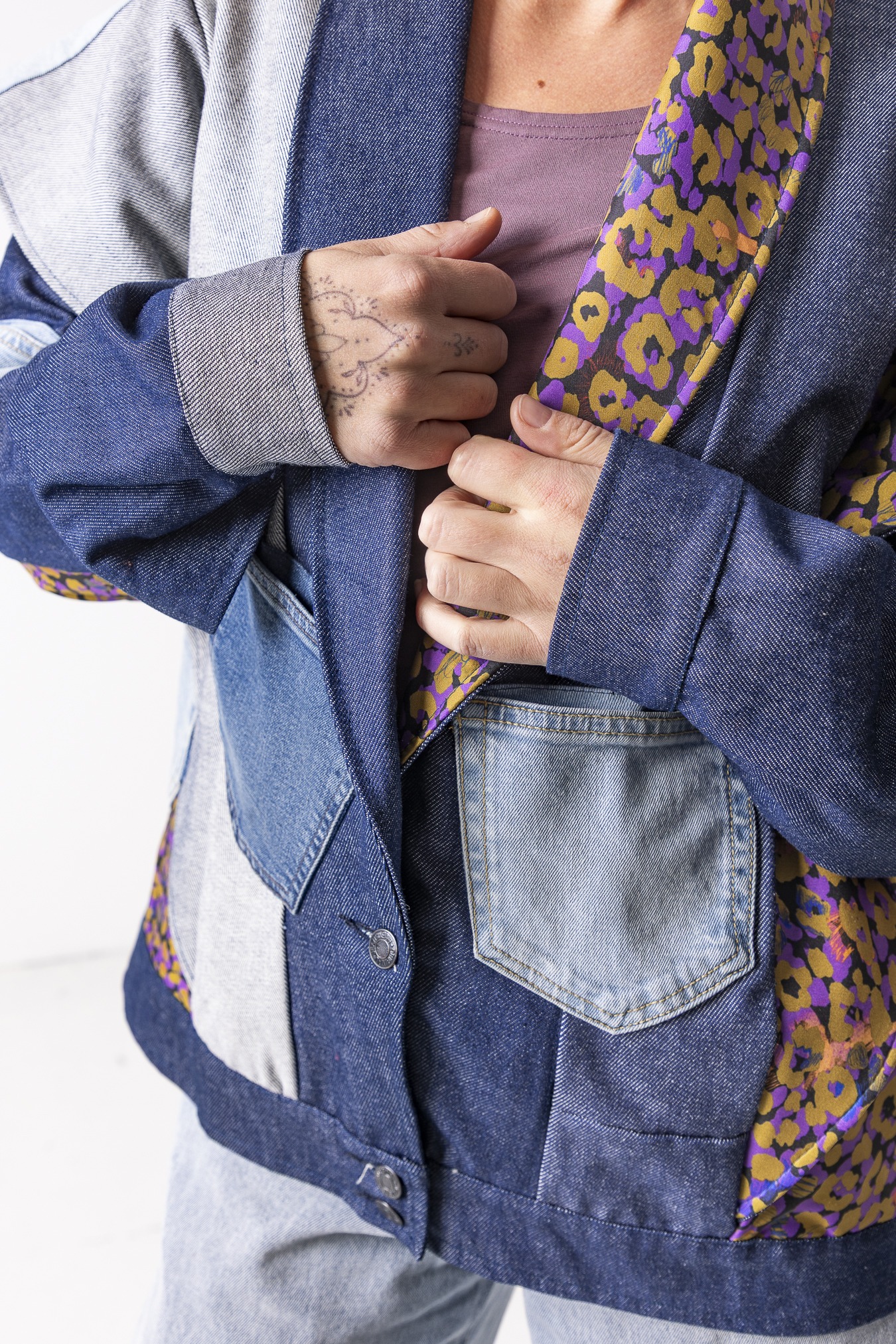 Kurtka Wachlarz powstała w naszej kolekcji upcyklingowej DDxUlka_ta_od_szycia — z materiałów, którym dajemy drugie życie. Łączymy w niej nasze tkaniny pozostałe po produkcji z wyselekcjonowanymi jeansami z drugiego obiegu, tworząc nową, wyrazistą formę. To projekt, w którym patchwork i różnorodność materiałów budują charakter kurtki.