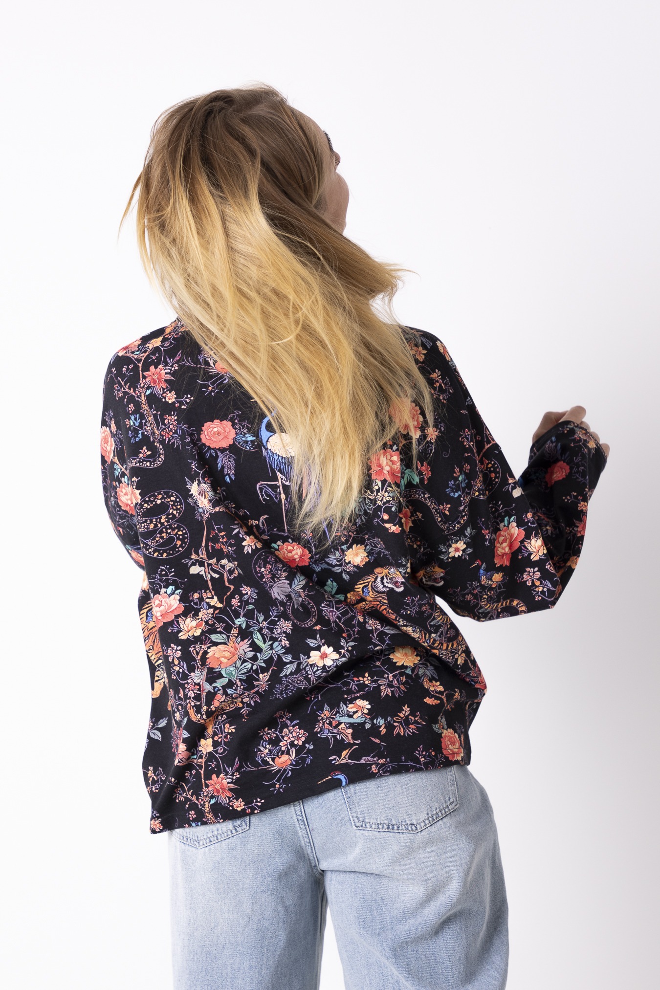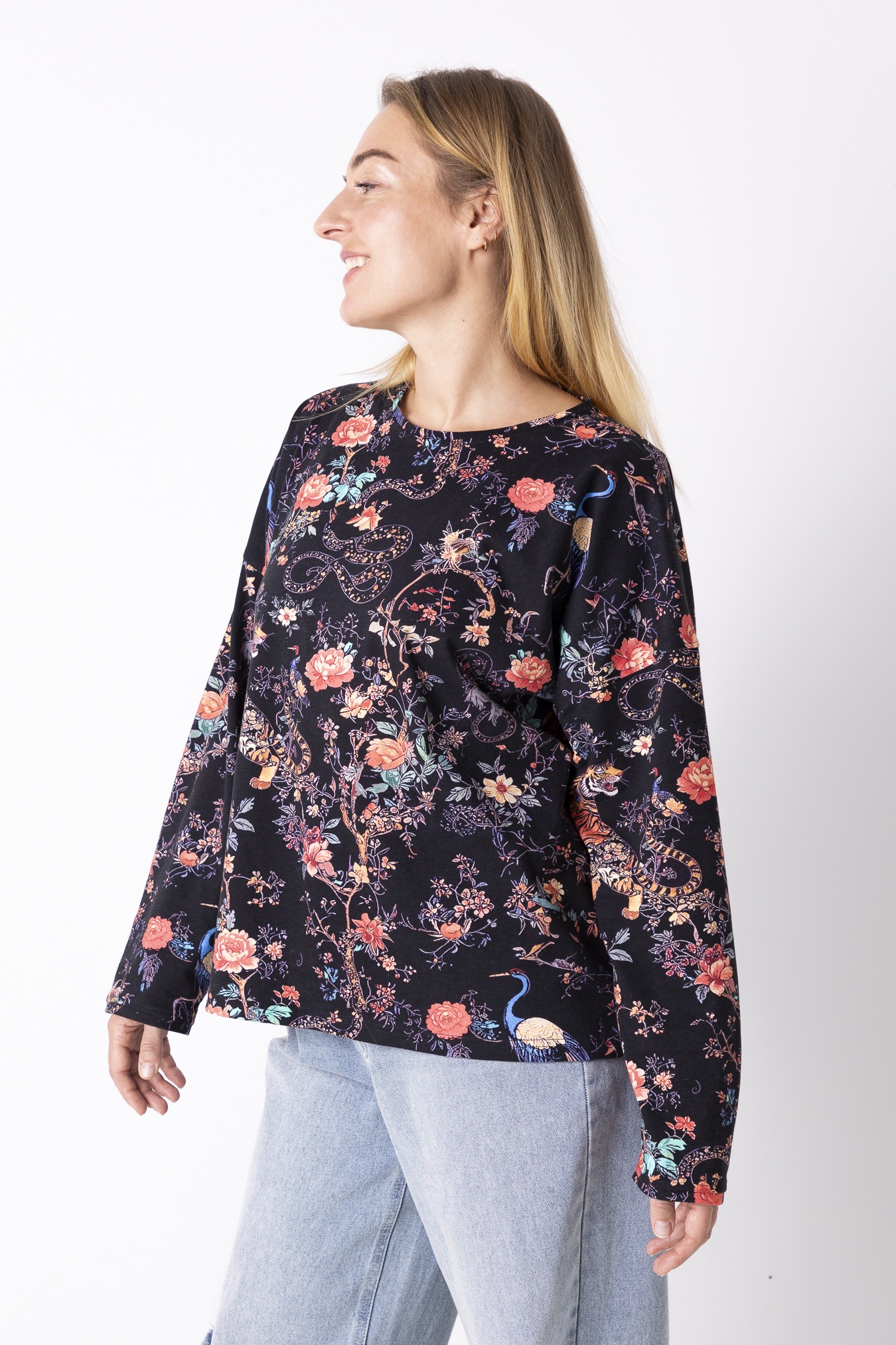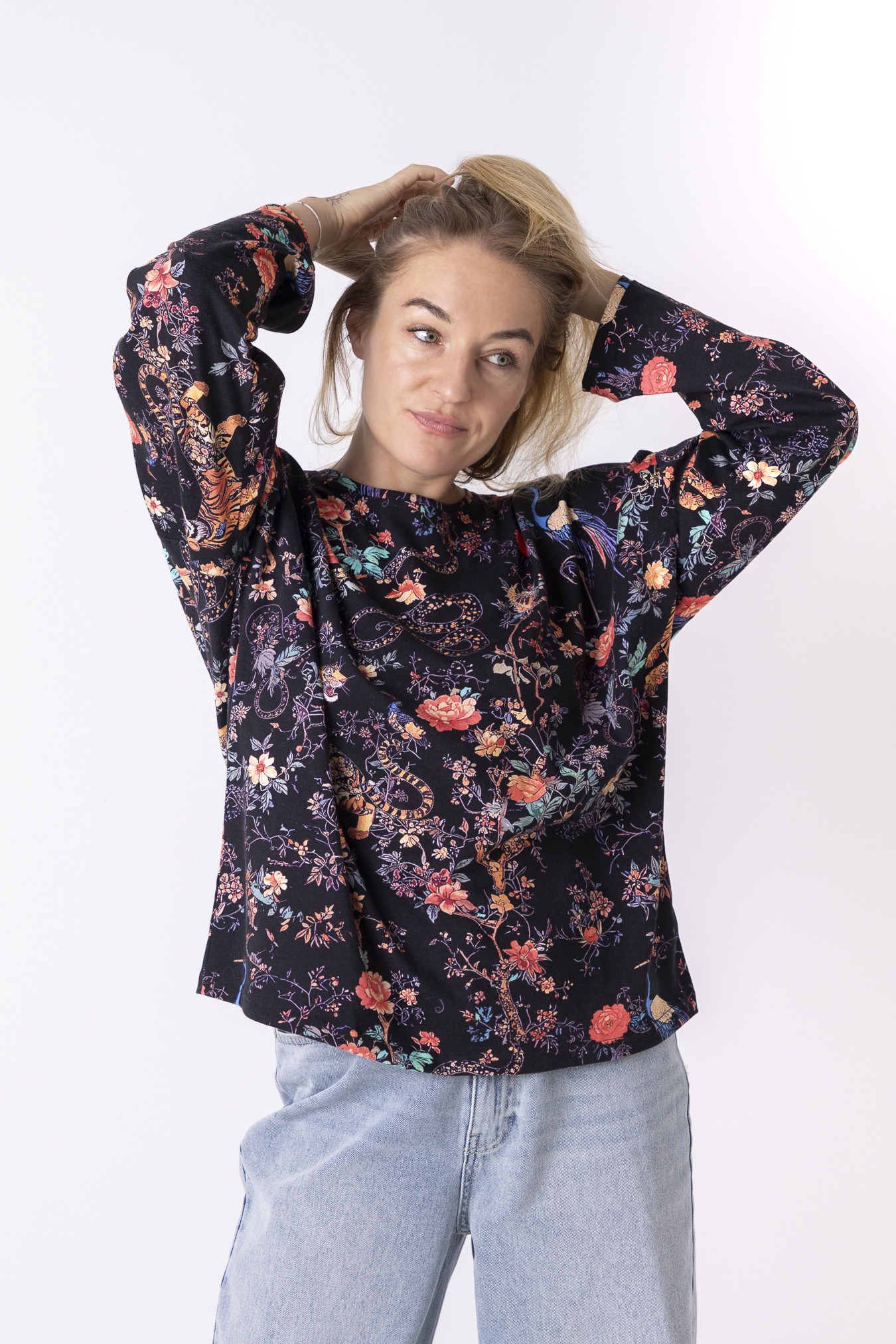 To spokój, który zakładasz na siebie. Luźny krój, długie rękawy i długość sięgająca linii bioder dają poczucie swobody i lekkości — takiej, w której ciało może oddychać, a Ty nie musisz nic poprawiać ani kontrolować. Okrągły dekolt miękko układa się przy szyi, dodając całości naturalnej prostoty. Wzór Japan jest trochę jak medytacja, która uspokaja myśli. Bawełna sprawia, że longsleeve jest oddychający i nierozciągliwy— idealny na cały dzień, od porannego wyjścia po wieczorne zwolnienie tempa.