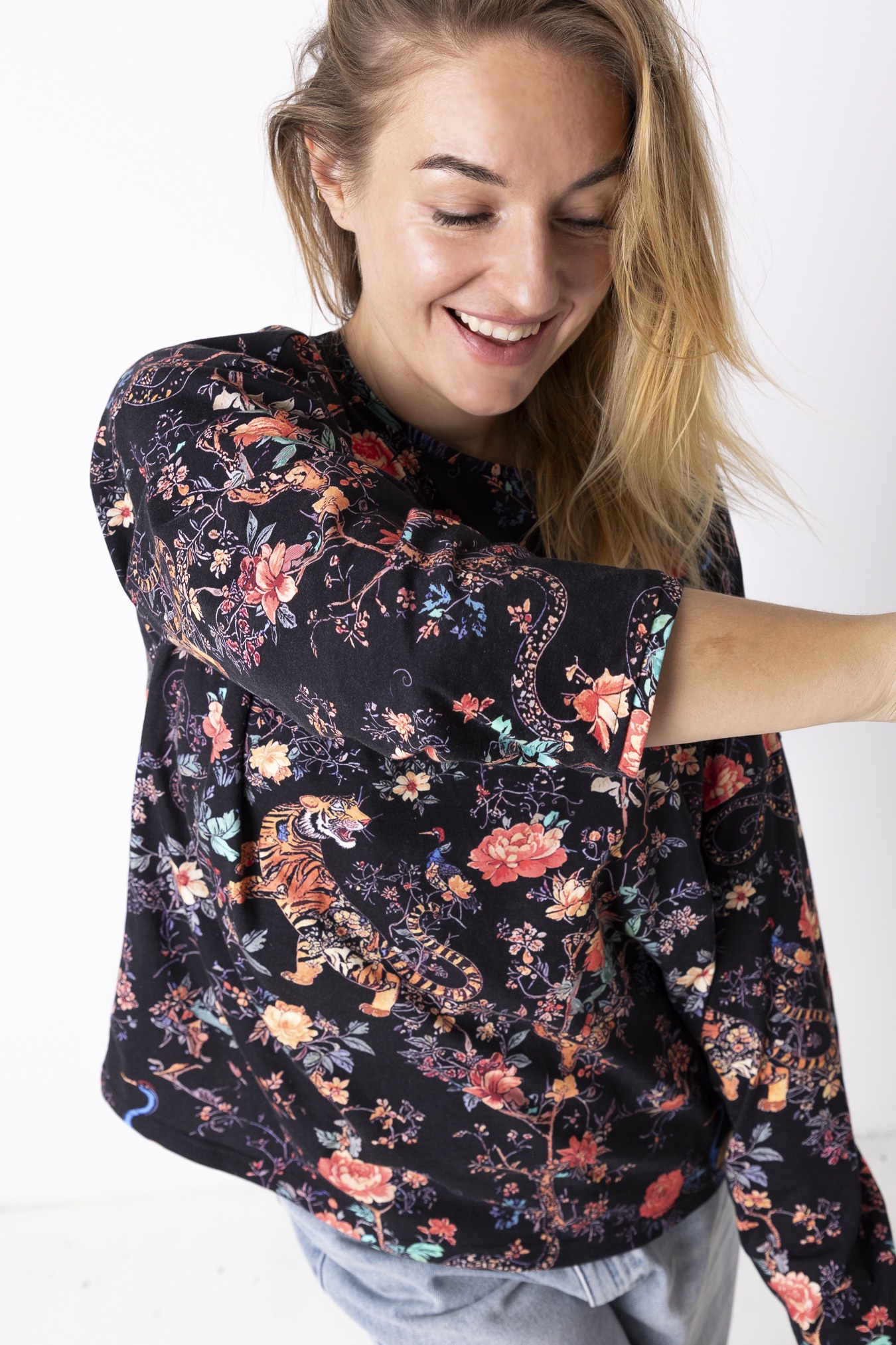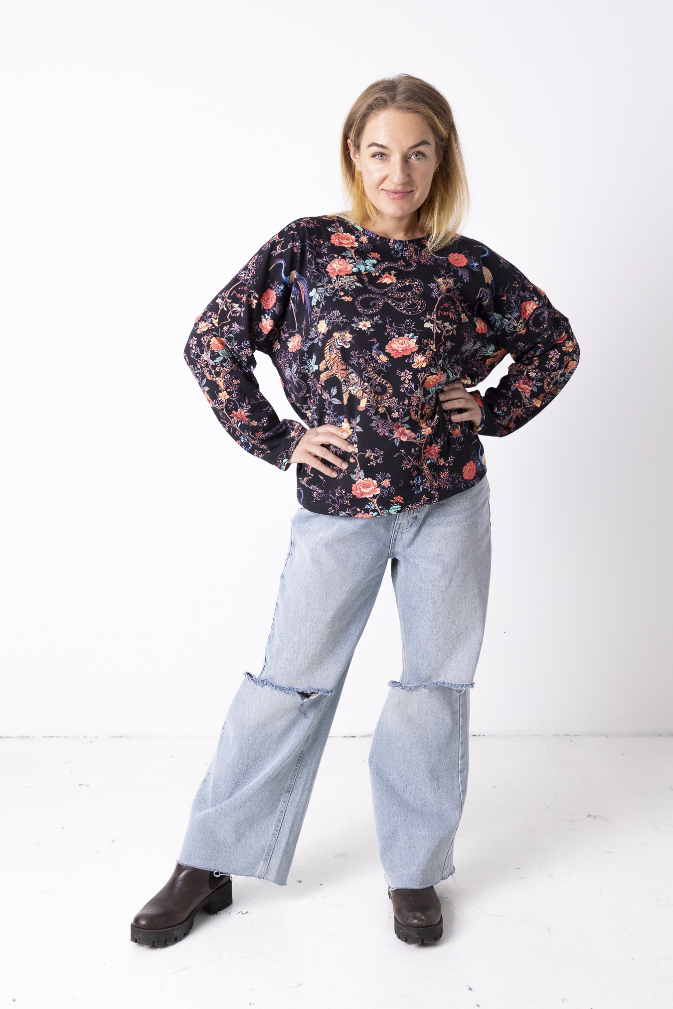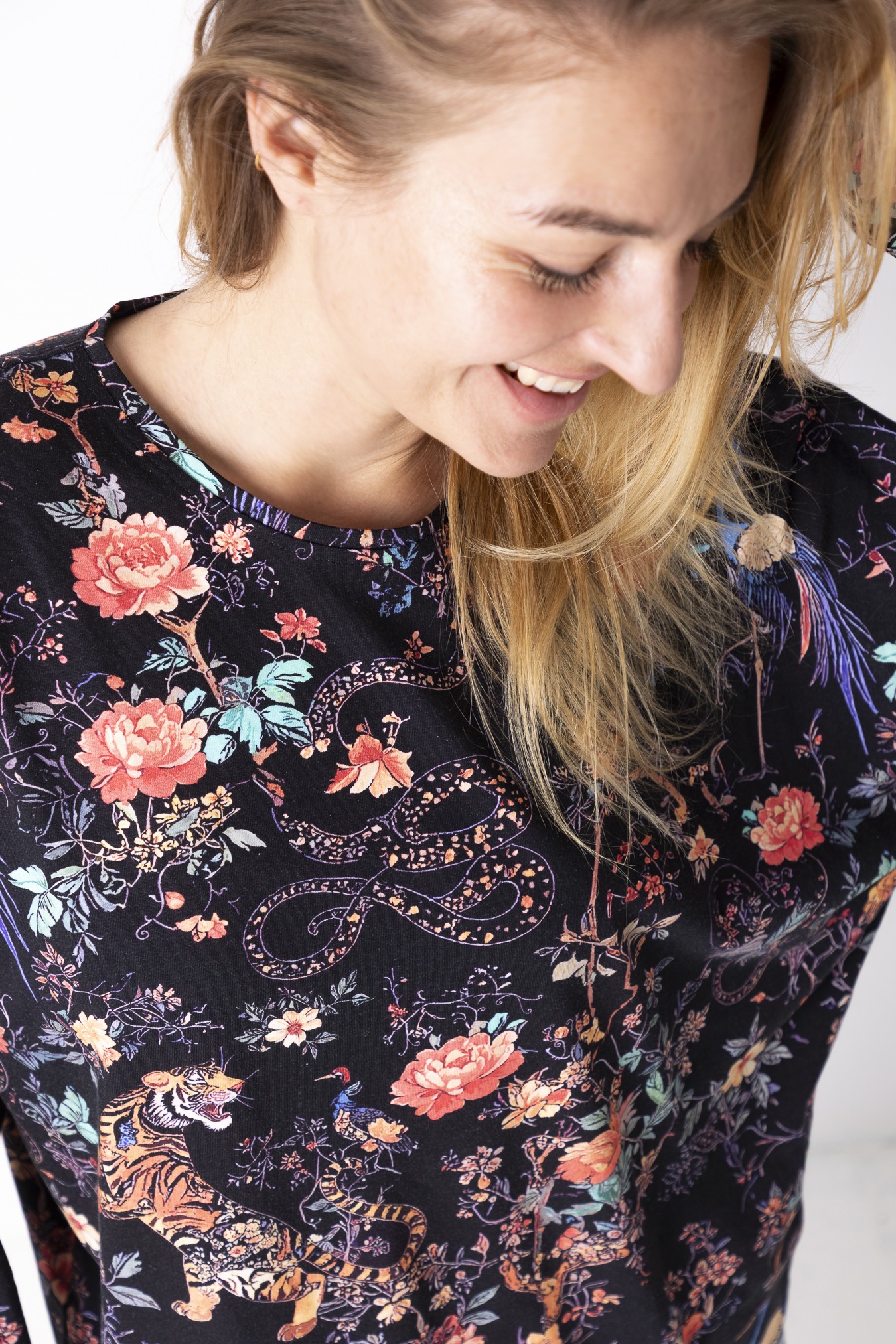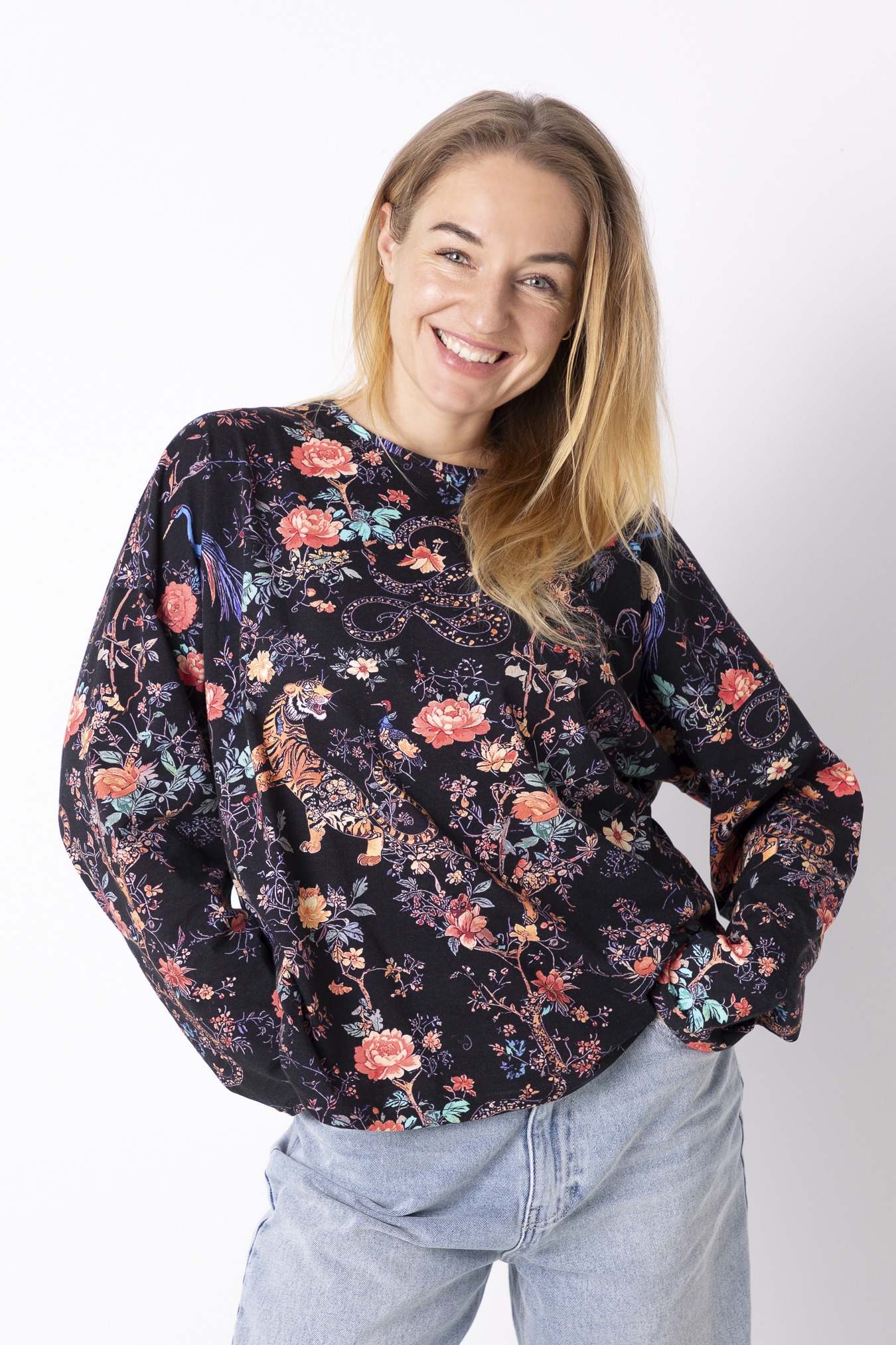 To spokój, który zakładasz na siebie. Luźny krój, długie rękawy i długość sięgająca linii bioder dają poczucie swobody i lekkości — takiej, w której ciało może oddychać, a Ty nie musisz nic poprawiać ani kontrolować. Okrągły dekolt miękko układa się przy szyi, dodając całości naturalnej prostoty. Wzór Japan jest trochę jak medytacja, która uspokaja myśli. Bawełna sprawia, że longsleeve jest oddychający i nierozciągliwy— idealny na cały dzień, od porannego wyjścia po wieczorne zwolnienie tempa.