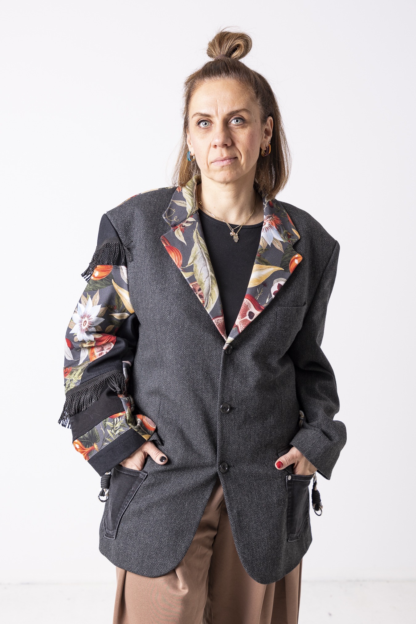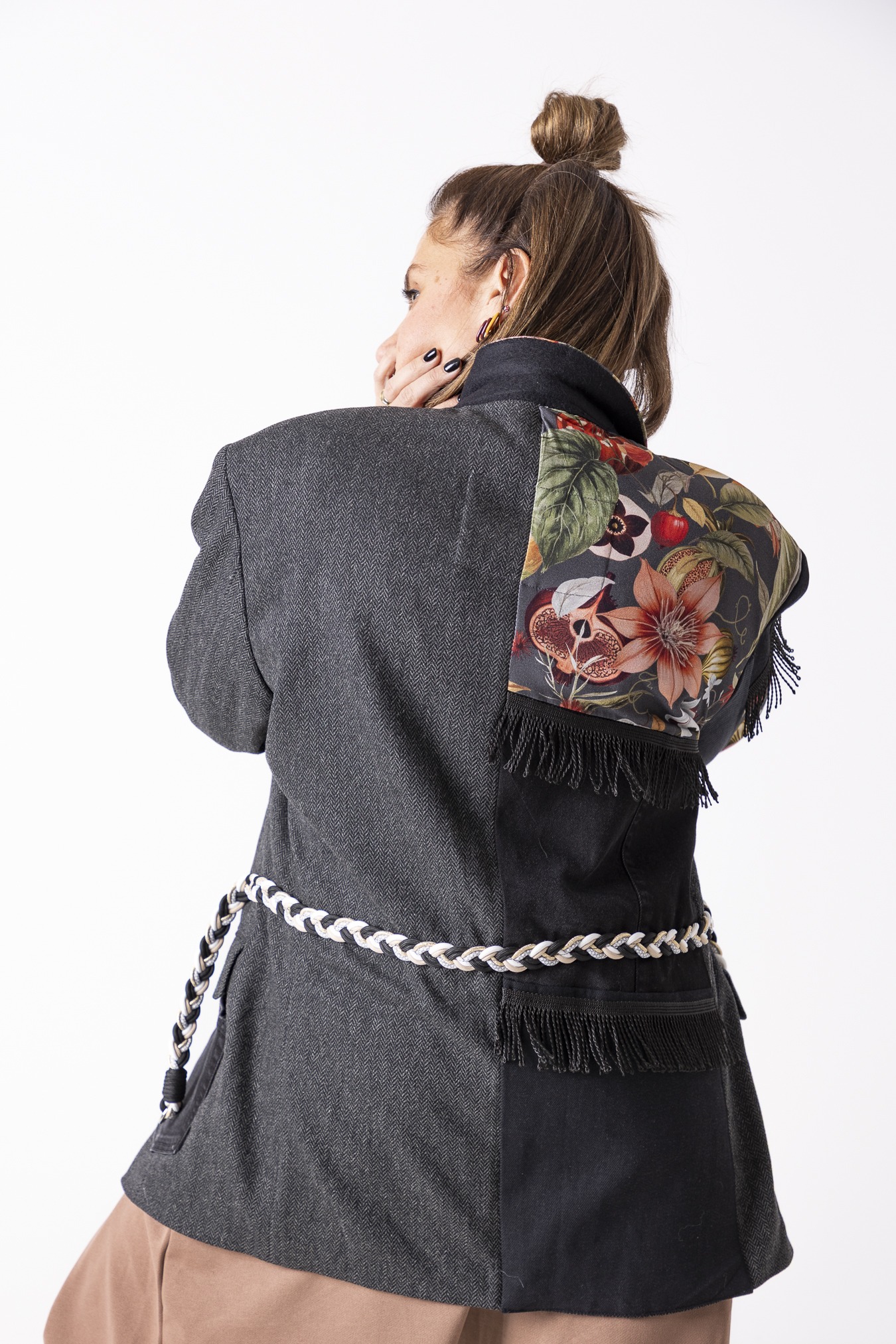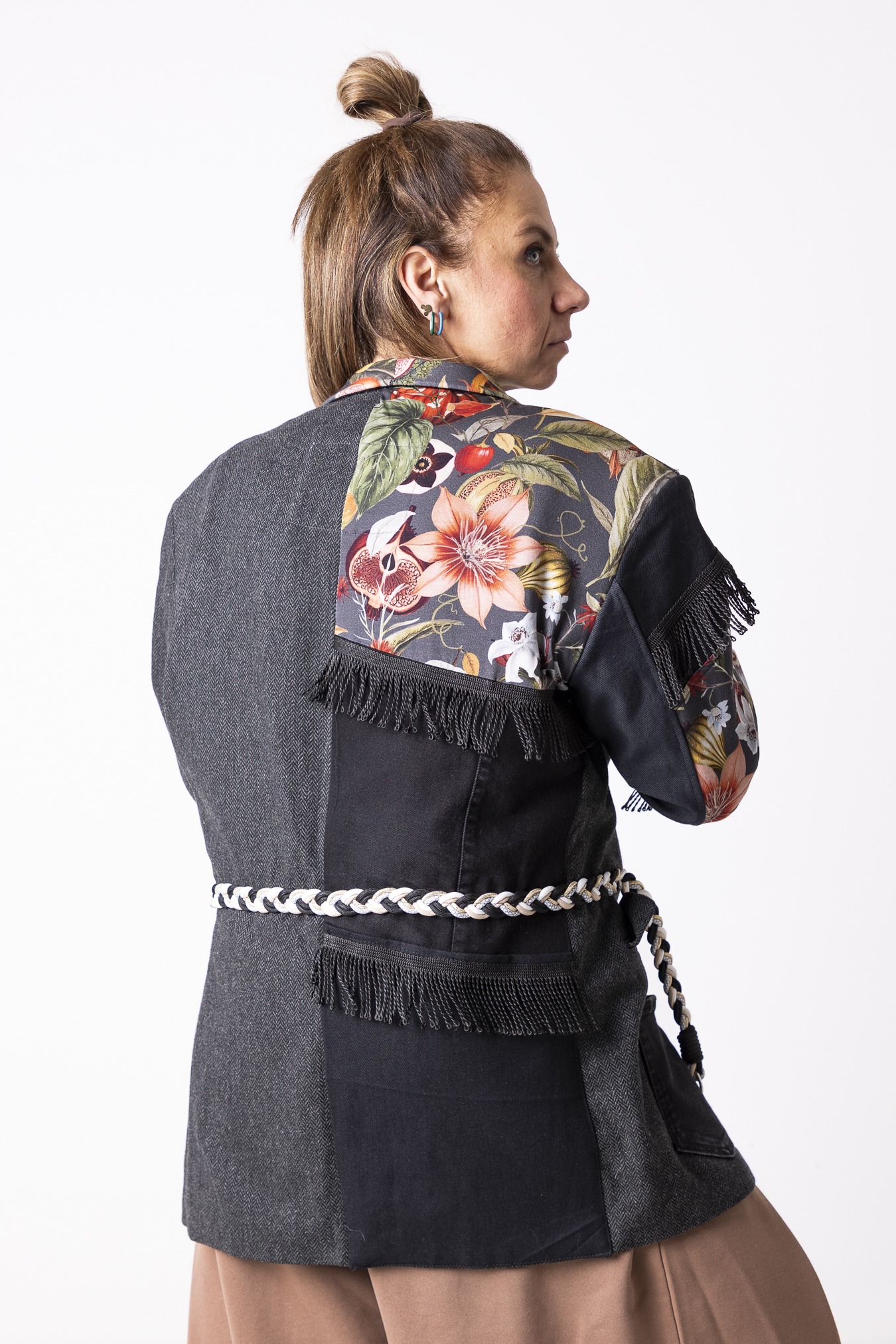 Każdy egzemplarz jest przerabiany ręcznie z uważnie dobranych fragmentów tkanin. Różni się detalami i układem wstawek — dlatego każda marynarka jest jedyna w swoim rodzaju.