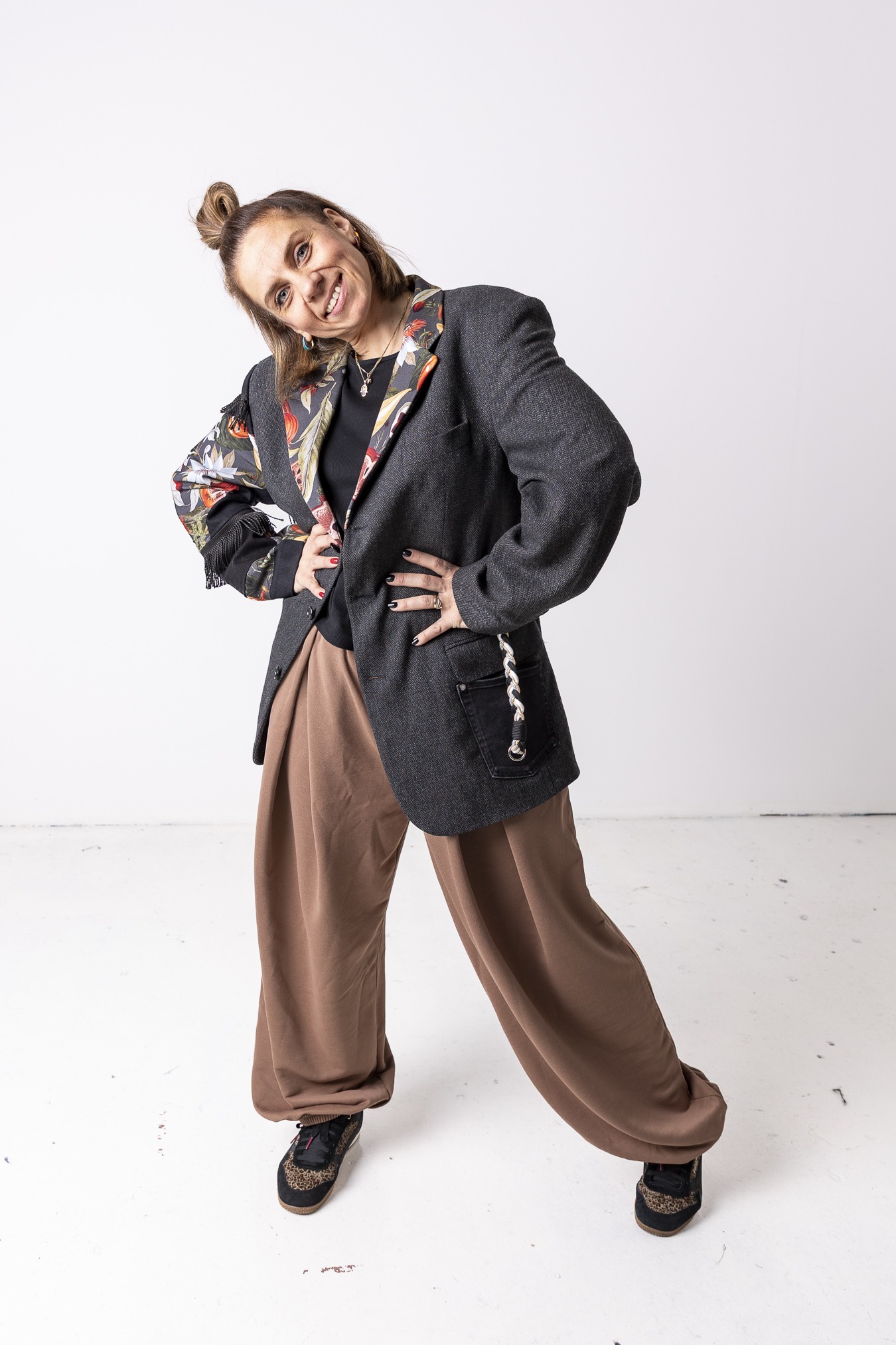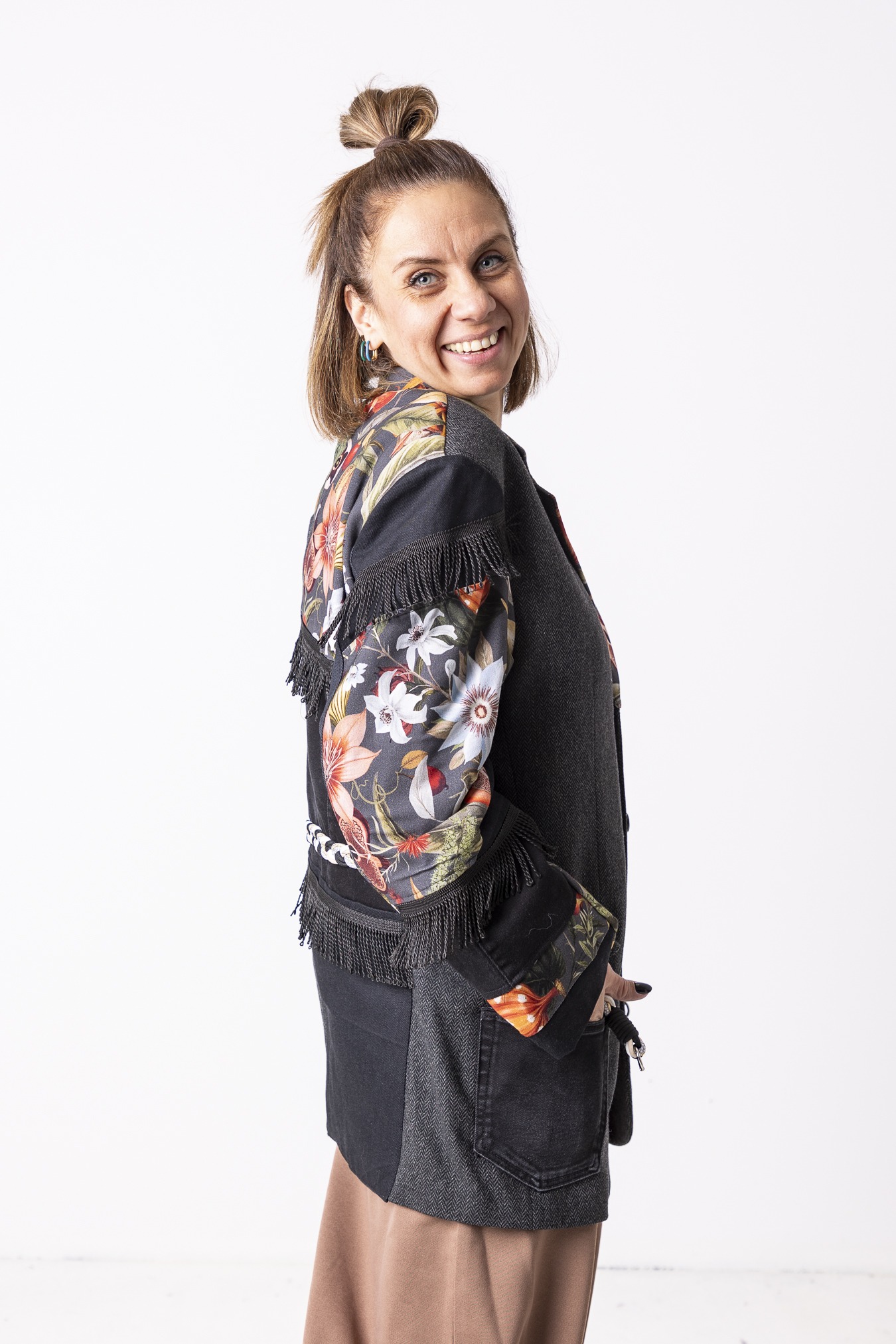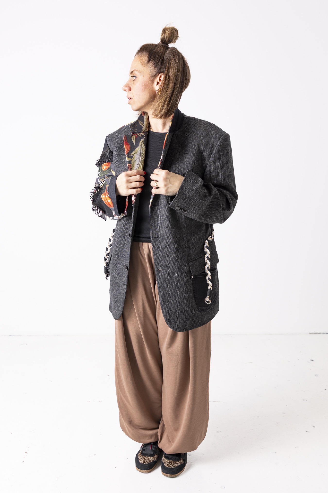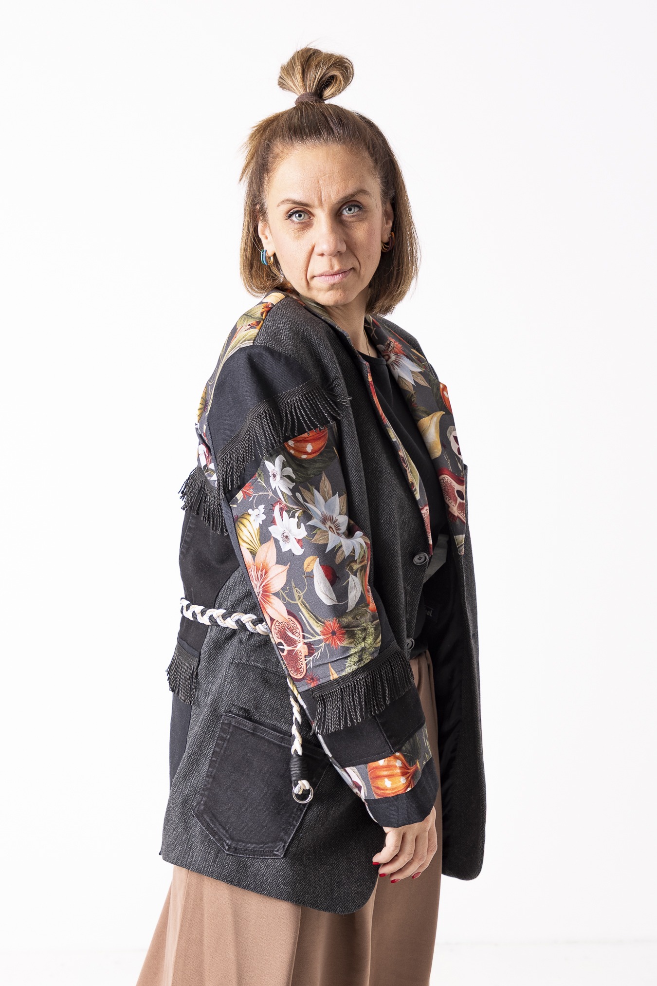 Każdy egzemplarz jest przerabiany ręcznie z uważnie dobranych fragmentów tkanin. Różni się detalami i układem wstawek — dlatego każda marynarka jest jedyna w swoim rodzaju.