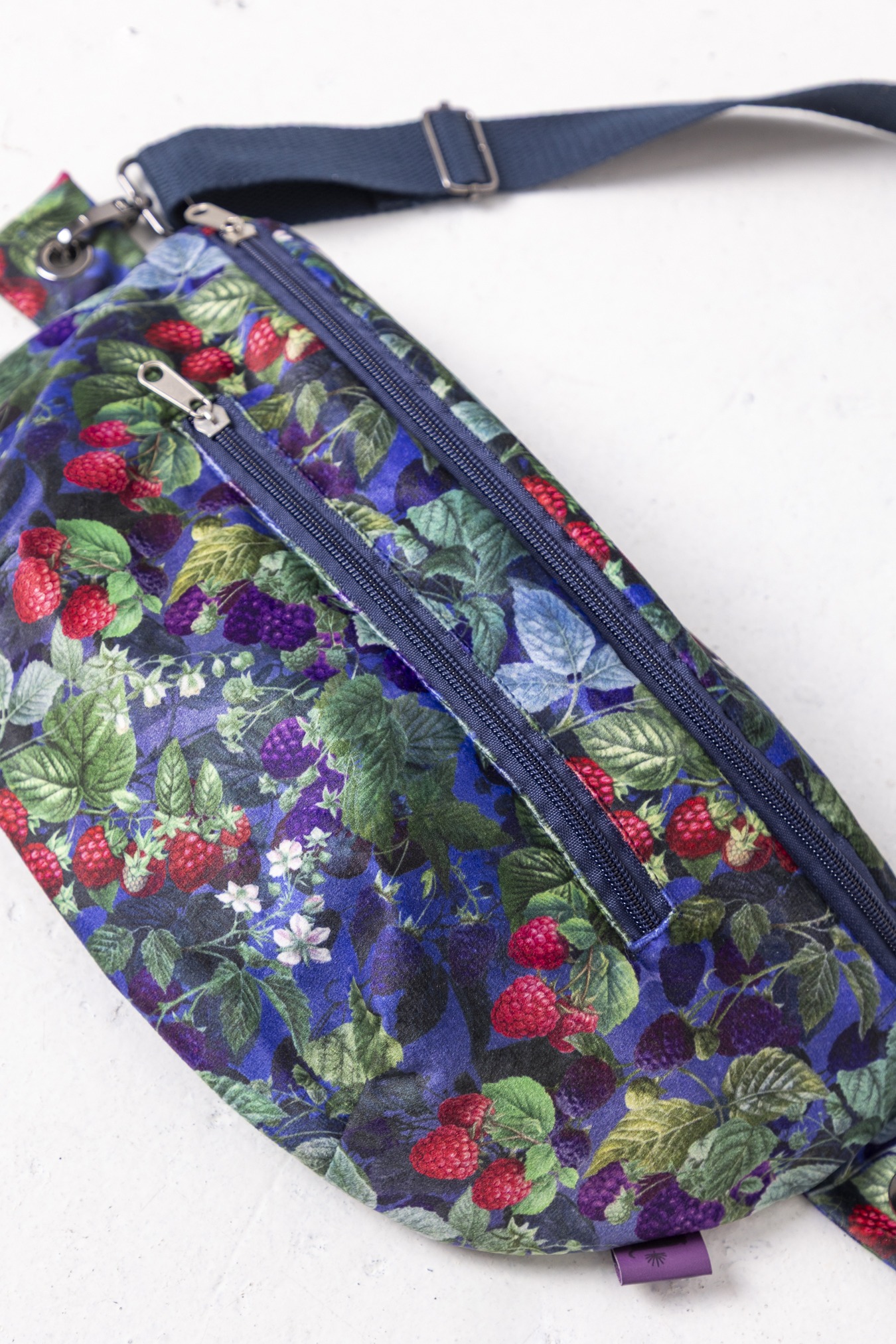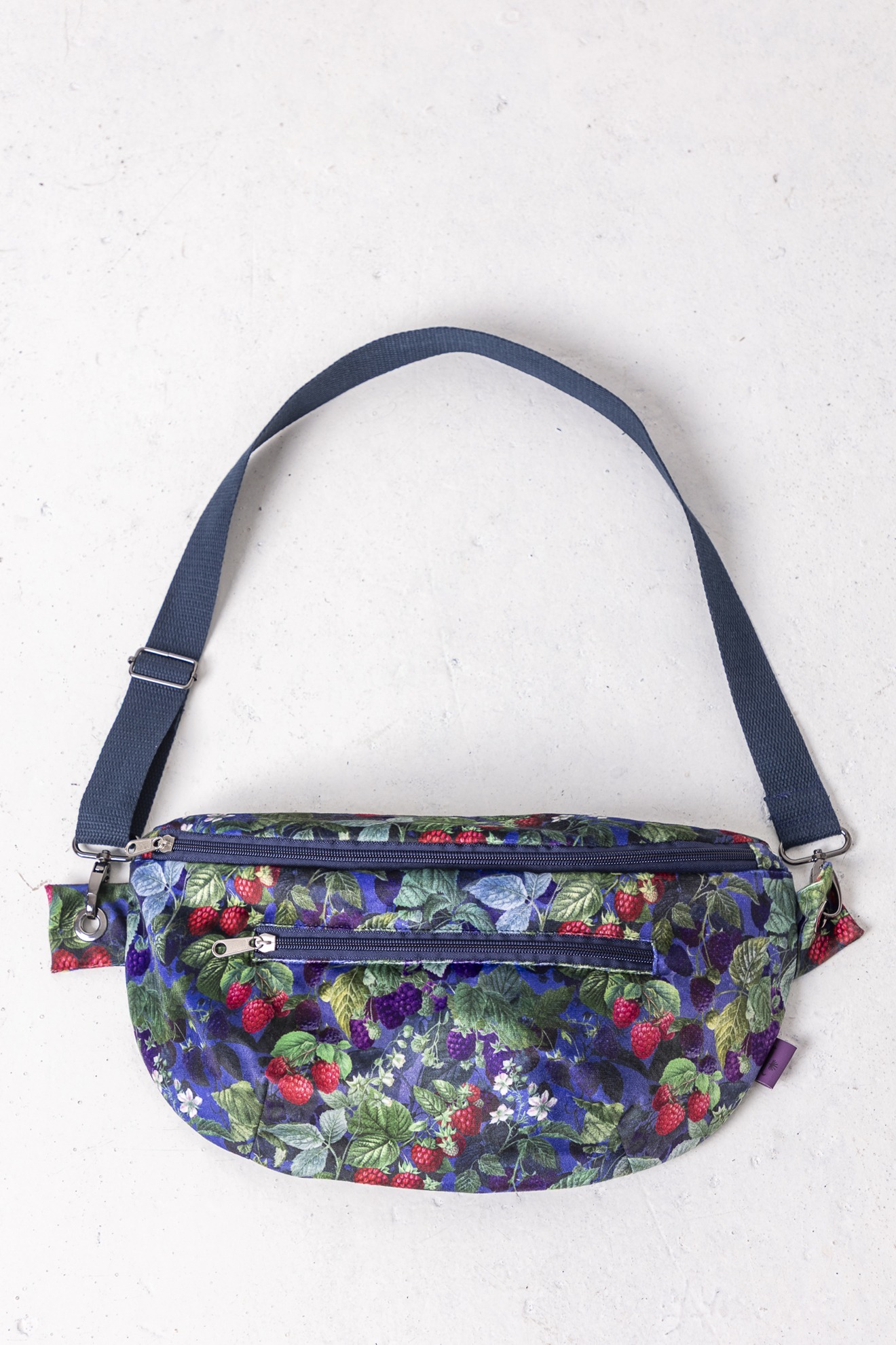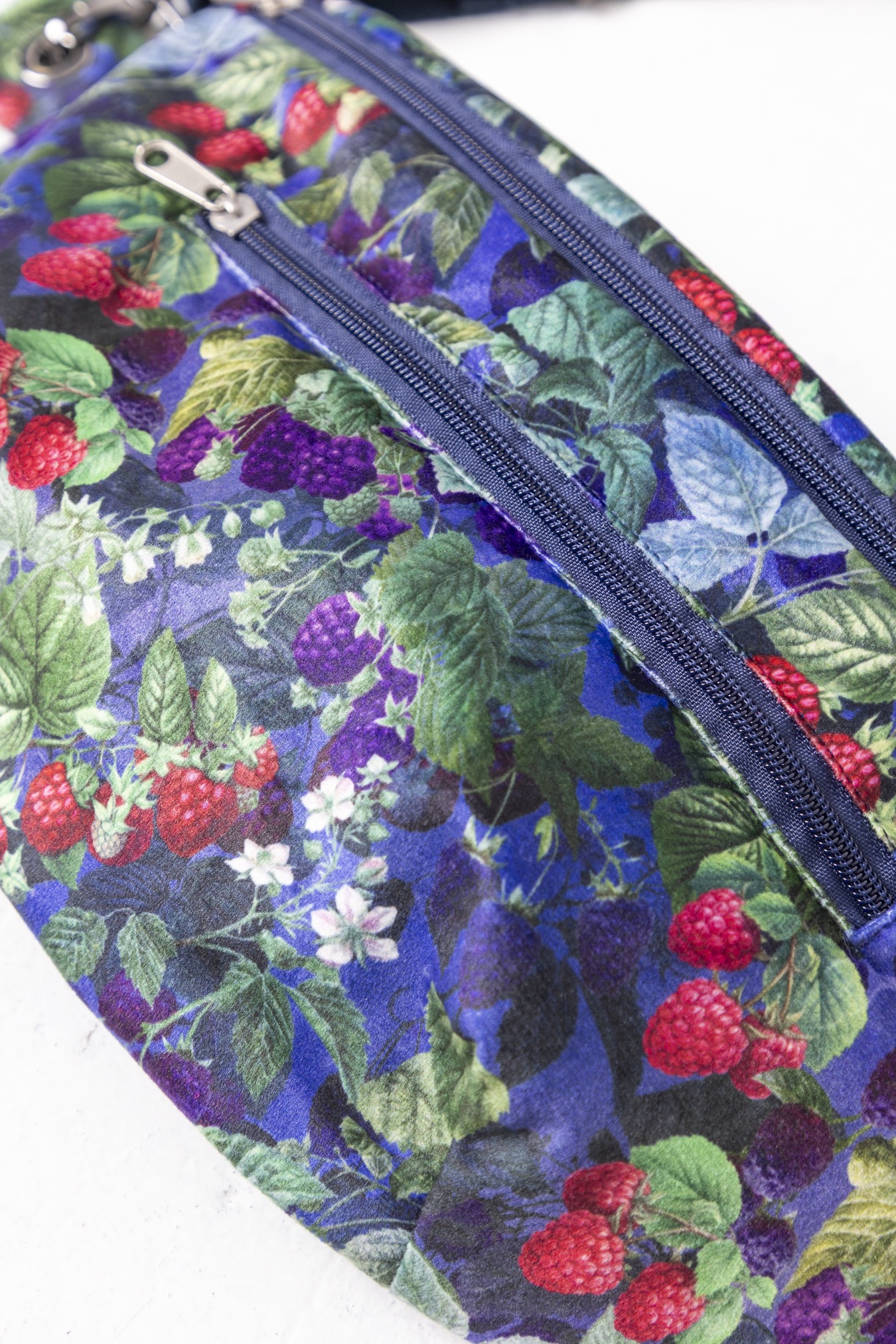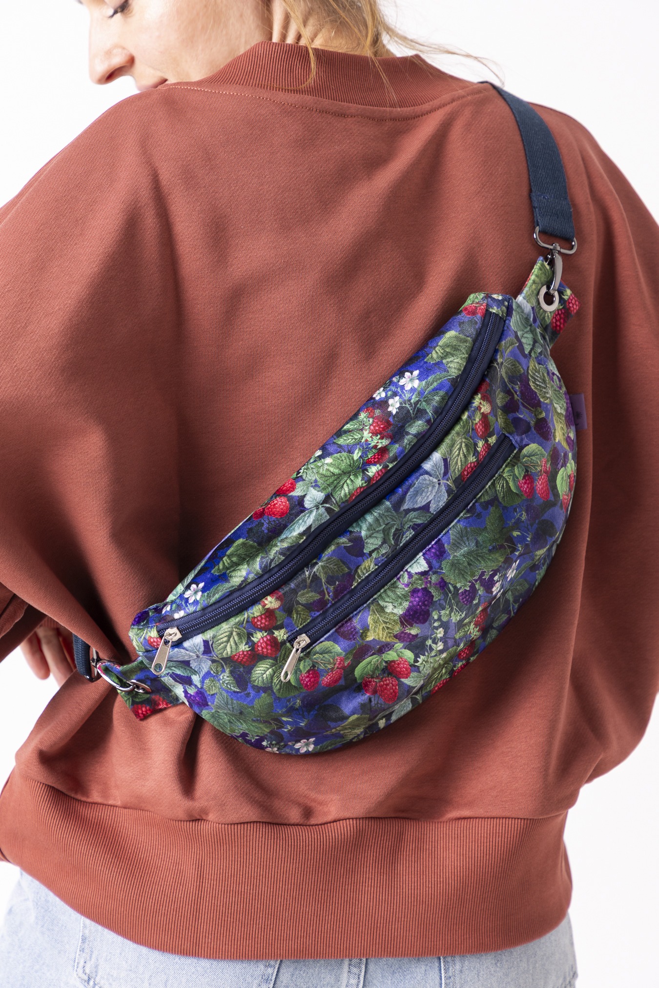 Wzór Jeżyny dodaję nutę głębokiego koloru i miękkiej, leśnej energii. Miękki w dotyku welur przyjemnie układa się na sylwetce, a podszewka z mikrofibry dba o to, by wszystko w środku było bezpieczne i dobrze zorganizowane. Pojemna forma pomieści nie tylko telefon i klucze, ale też portfel, notes czy małe codzienne „na wszelki wypadek”. Wygodna forma nerki zapewni wolne ręce, a regulowany pasek – pełen luz noszenia. Stworzona z myślą o wykorzystywaniu pozostałości po produkcji.