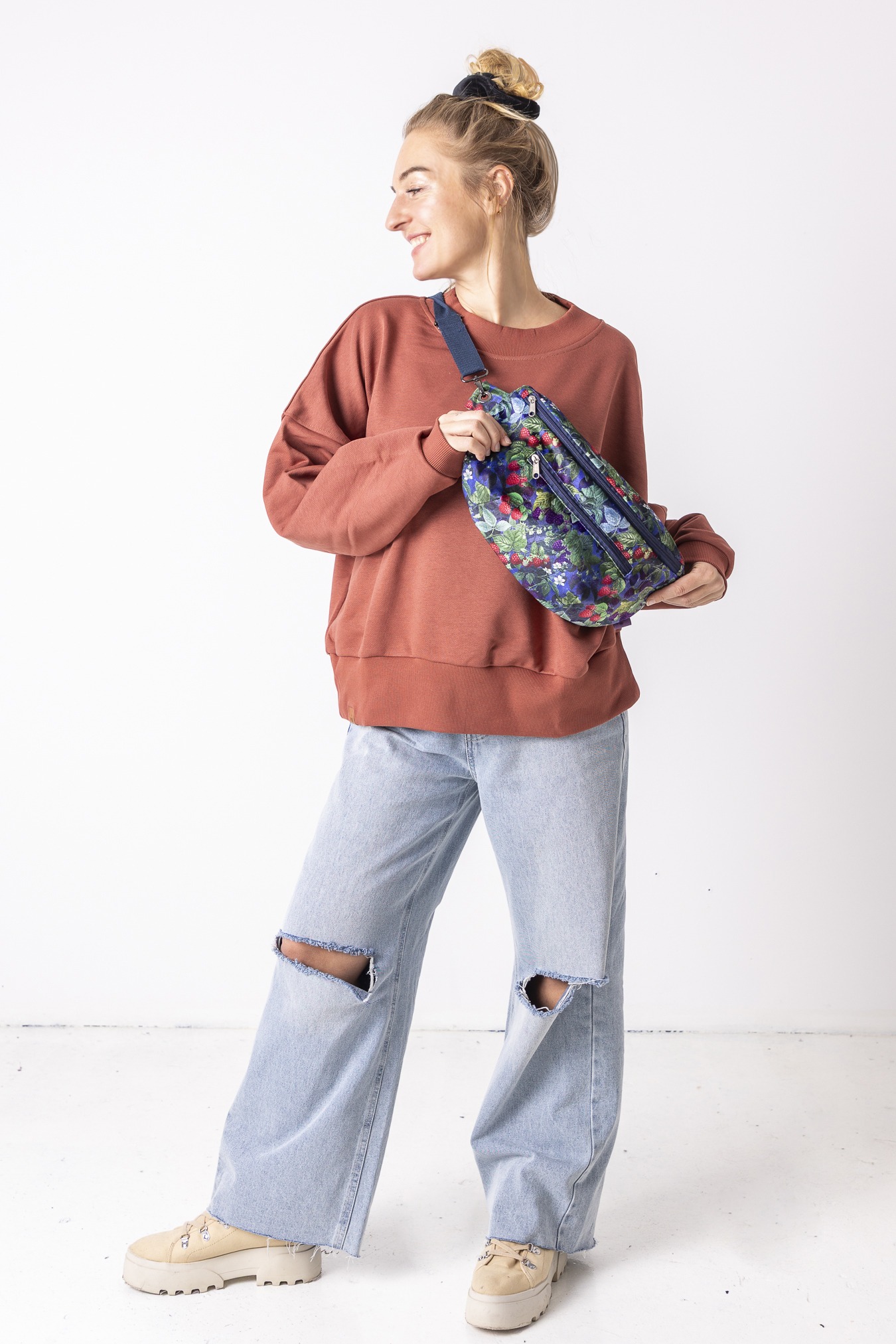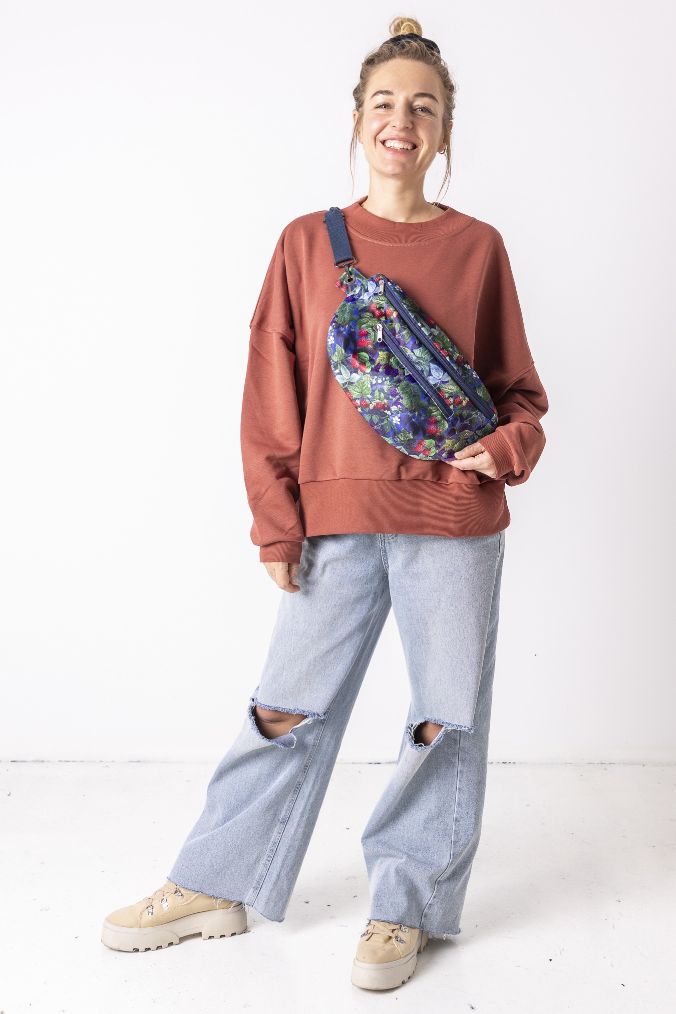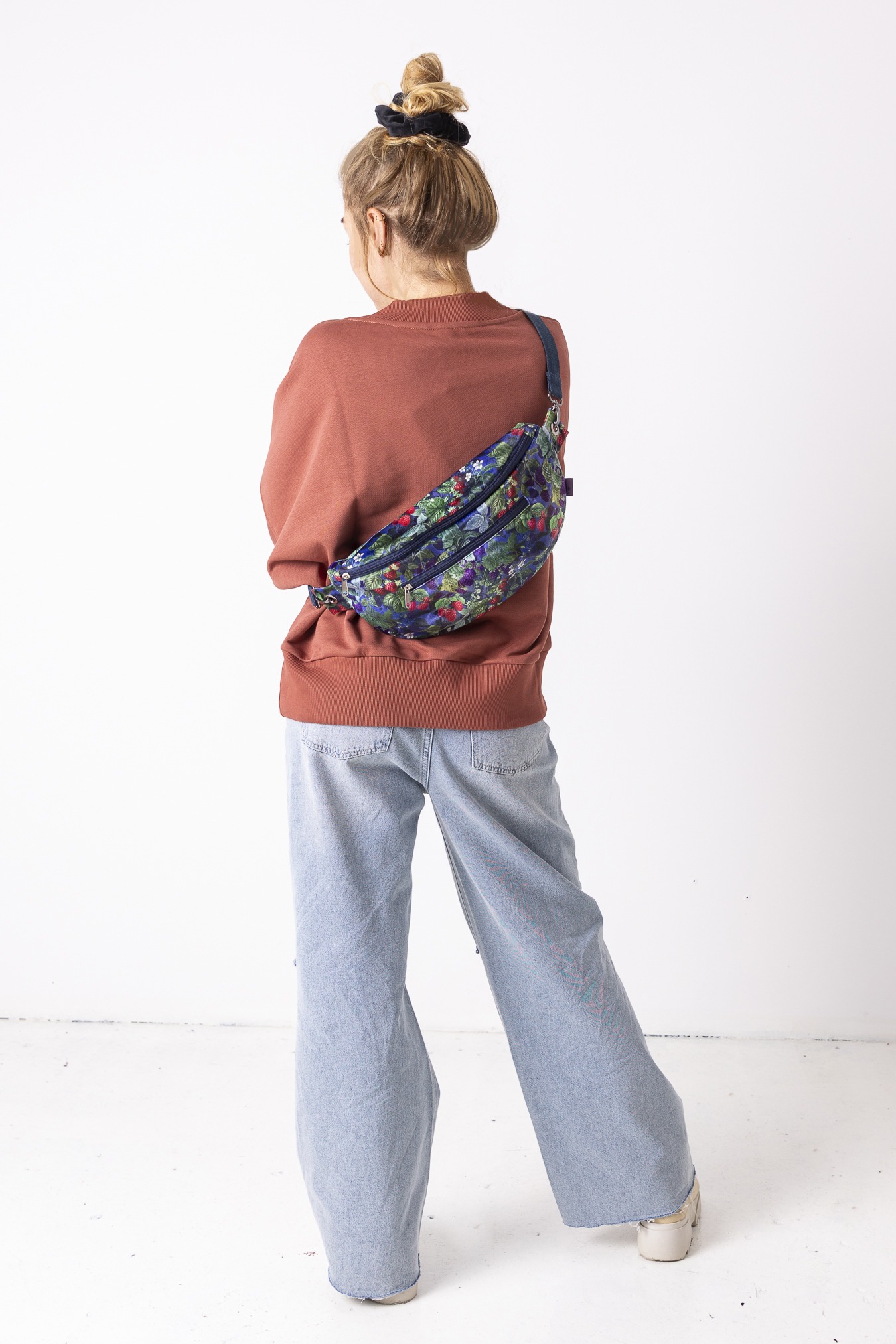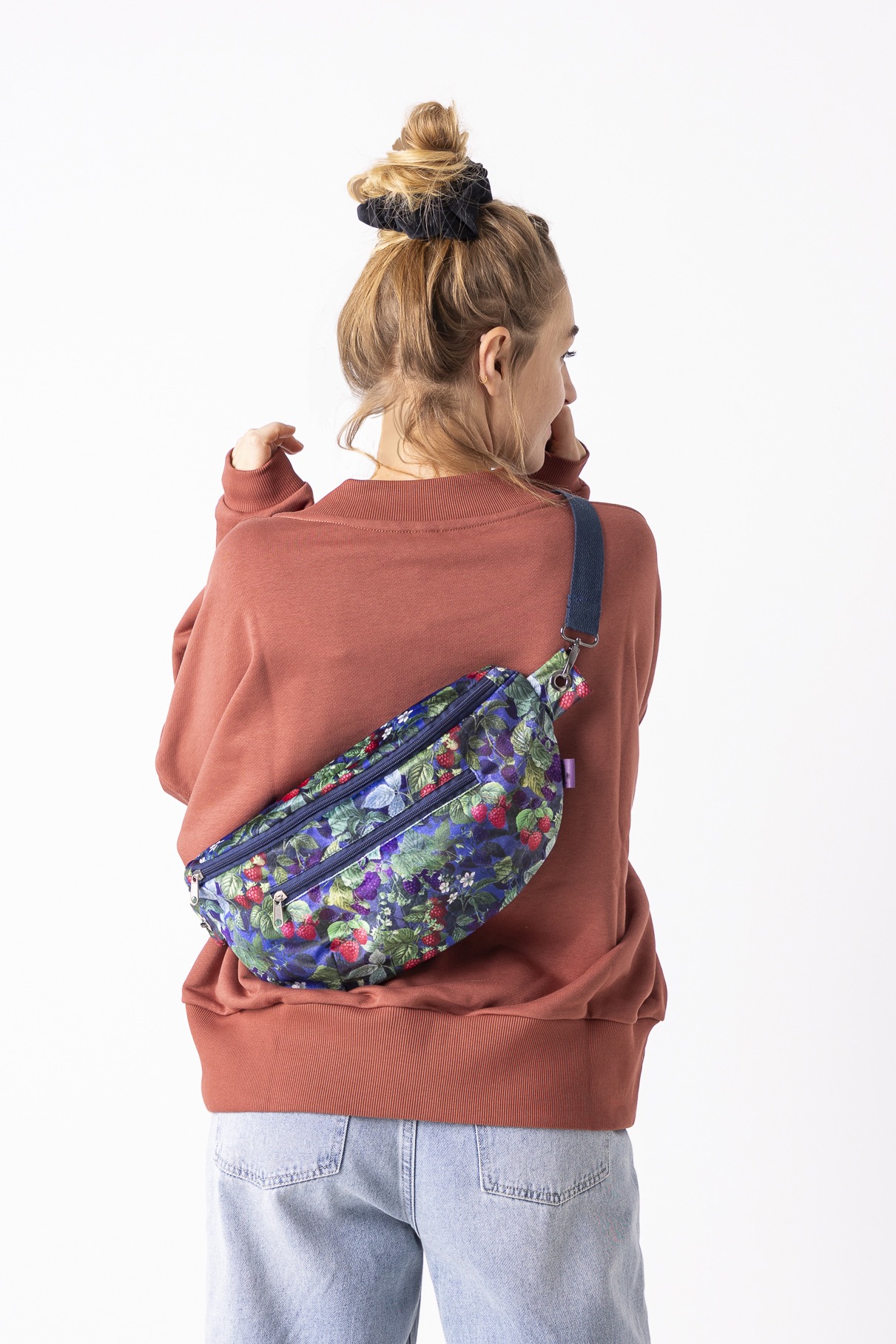 Wzór Jeżyny dodaję nutę głębokiego koloru i miękkiej, leśnej energii. Miękki w dotyku welur przyjemnie układa się na sylwetce, a podszewka z mikrofibry dba o to, by wszystko w środku było bezpieczne i dobrze zorganizowane. Pojemna forma pomieści nie tylko telefon i klucze, ale też portfel, notes czy małe codzienne „na wszelki wypadek”. Wygodna forma nerki zapewni wolne ręce, a regulowany pasek – pełen luz noszenia. Stworzona z myślą o wykorzystywaniu pozostałości po produkcji.