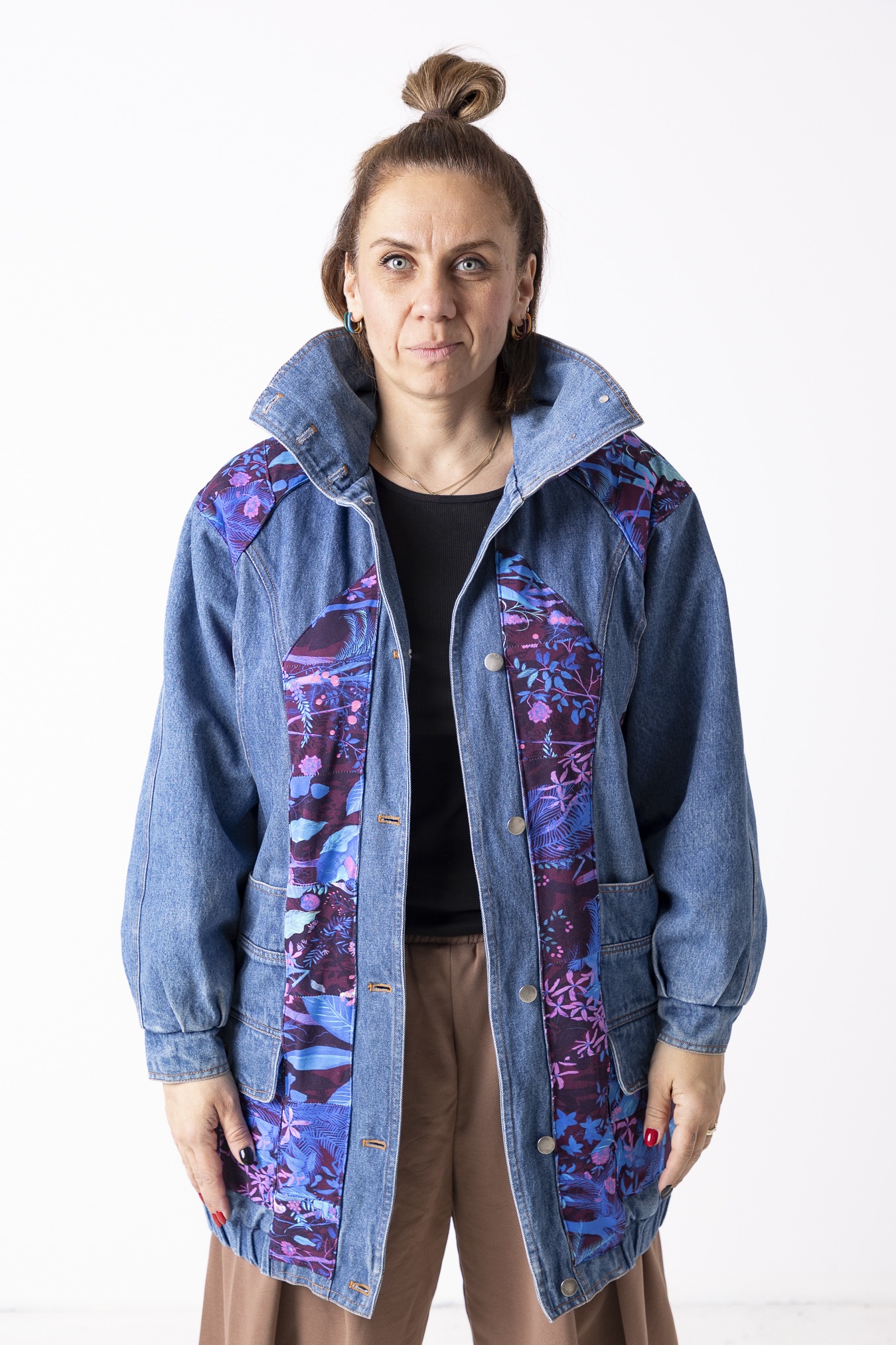 Każdy egzemplarz różni się detalami i układem wstawek — dlatego każdy model jest jedyny w swoim rodzaju. Właśnie w tej niepowtarzalności tkwi jej siła. Płaszcz -kurtka ma wygodny, swobodny krój, który dobrze układa się na sylwetce i pozwala nosić ją na wiele sposobów — narzucony na longsleeve czy sukienkę. To model, który sprawdzi się zarówno w codziennych stylizacjach, jak i wtedy, gdy chcesz dodać charakteru prostemu zestawowi.