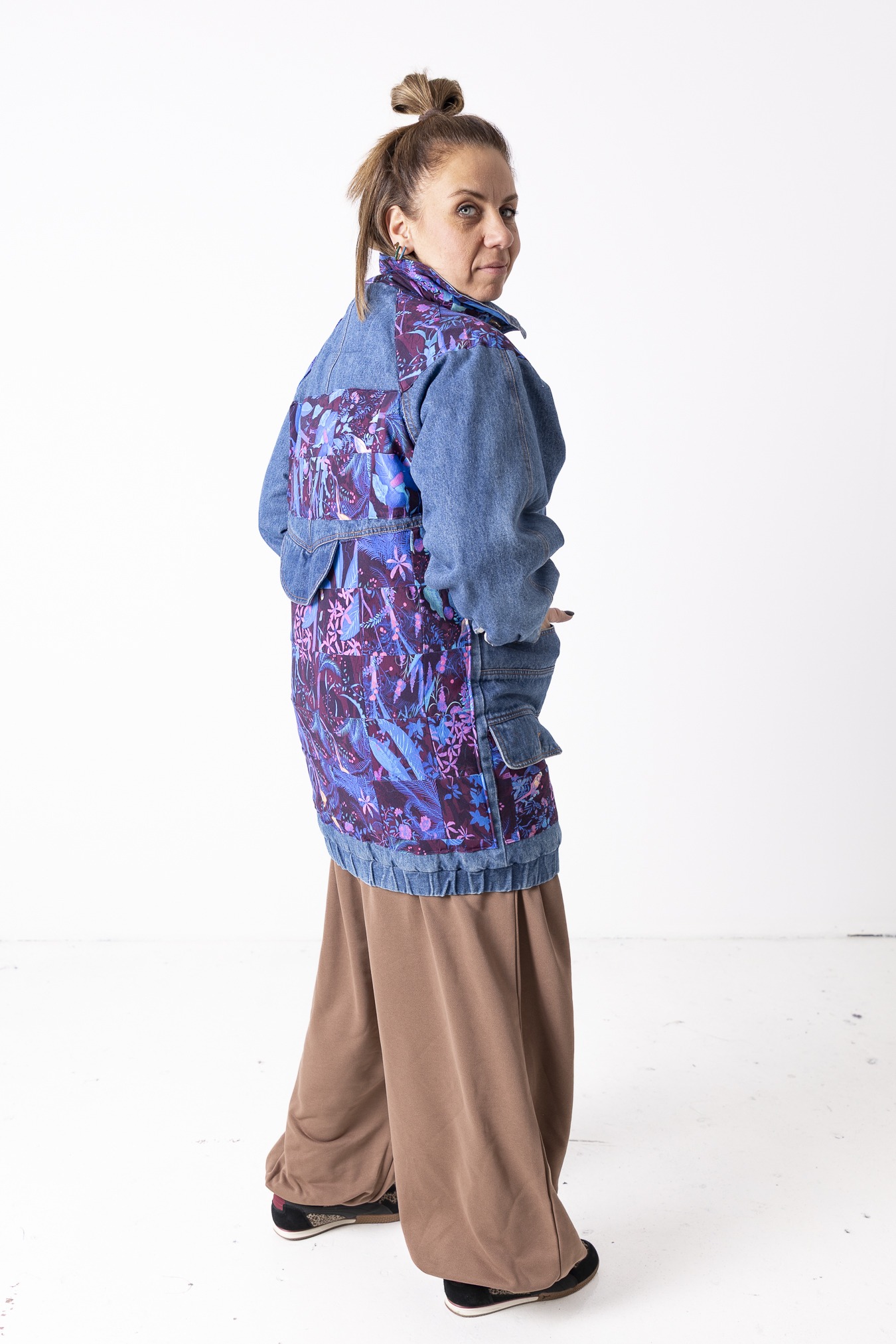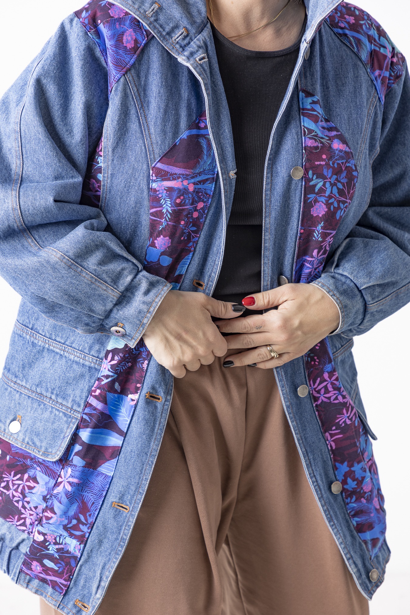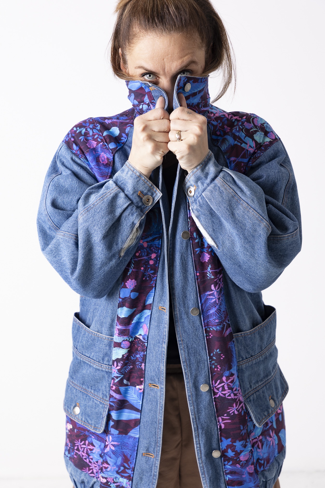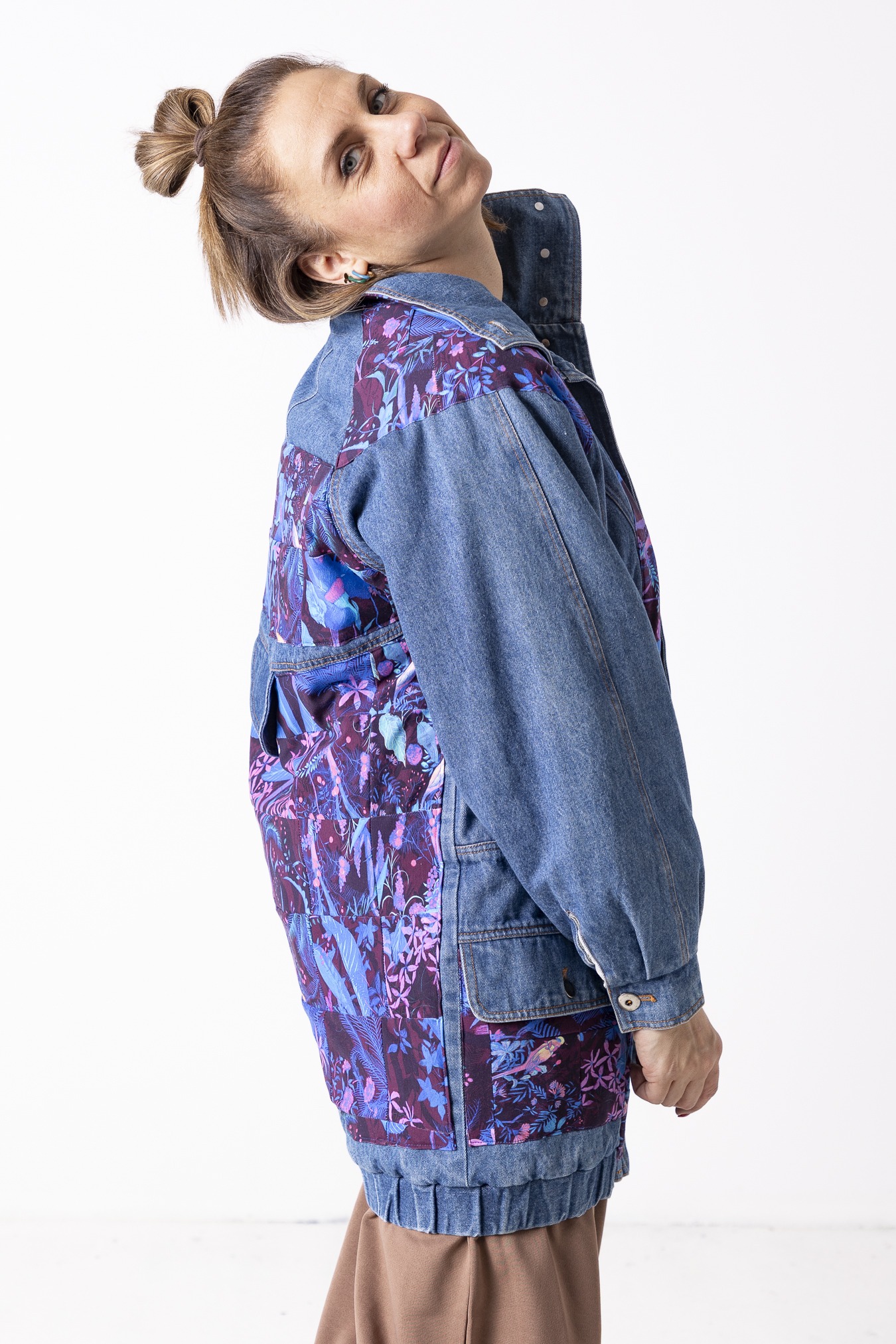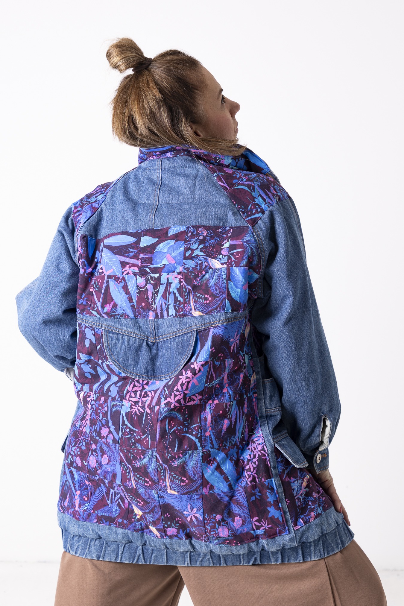Kurtka Wachlarz powstała w naszej kolekcji upcyklingowej DDxUlka_ta_od_szycia — z materiałów, którym dajemy drugie życie. Łączymy w niej nasze tkaniny pozostałe po produkcji z wyselekcjonowanymi jeansami z drugiego obiegu, tworząc nową, wyrazistą formę. To projekt, w którym patchwork i różnorodność materiałów budują charakter kurtki.