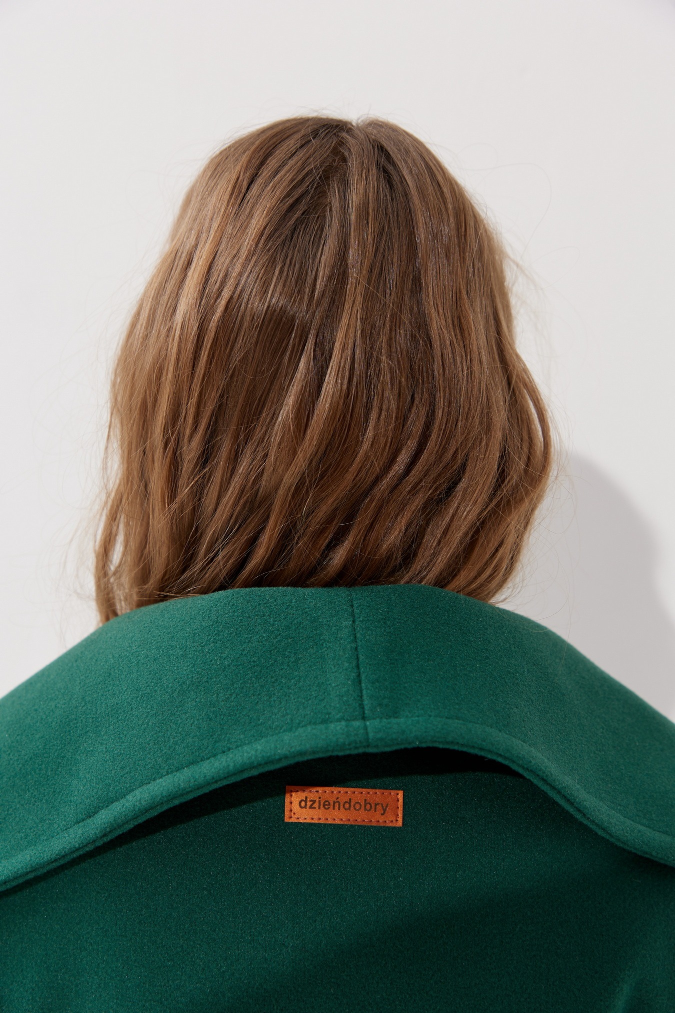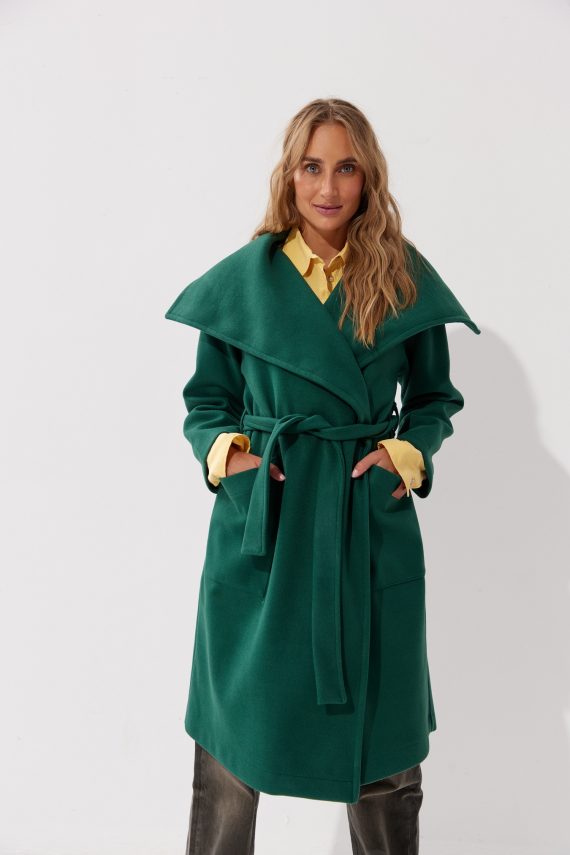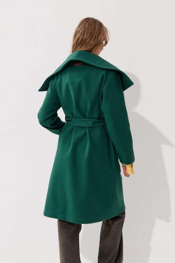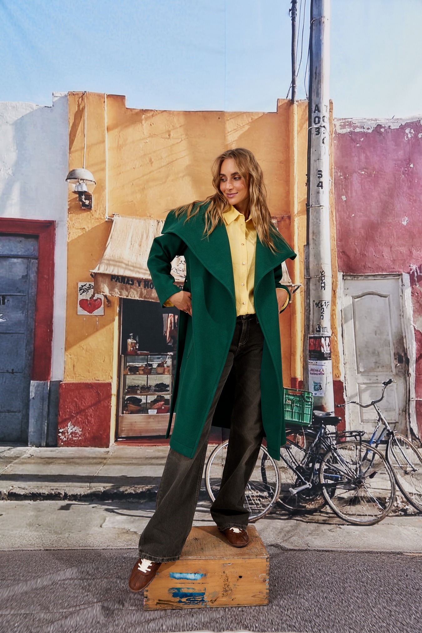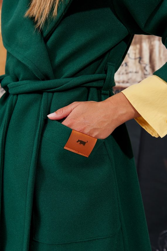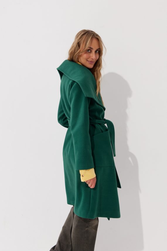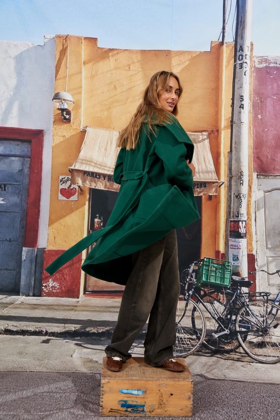 Hoja – odcień zieleni barwiony specjalnie dla Jaśminy. Niesie w sobie więcej niż tylko kolor – to symbol nadziei. Jego głęboka barwa przypomina o sile natury i spokoju. To okrycie, które nie tylko chroni przed chłodem, ale też otula dobrą energią i obietnicą nowych początków. Luźny krój daje swobodę i pozwala na warstwowe stylizacje (tak, możesz pod niego zmieścić ulubiony sweter!), a przyjemna w dotyku tkanina otula jak ciepła herbatka w dłoń. Dodatkowy pasek podkreśli talię