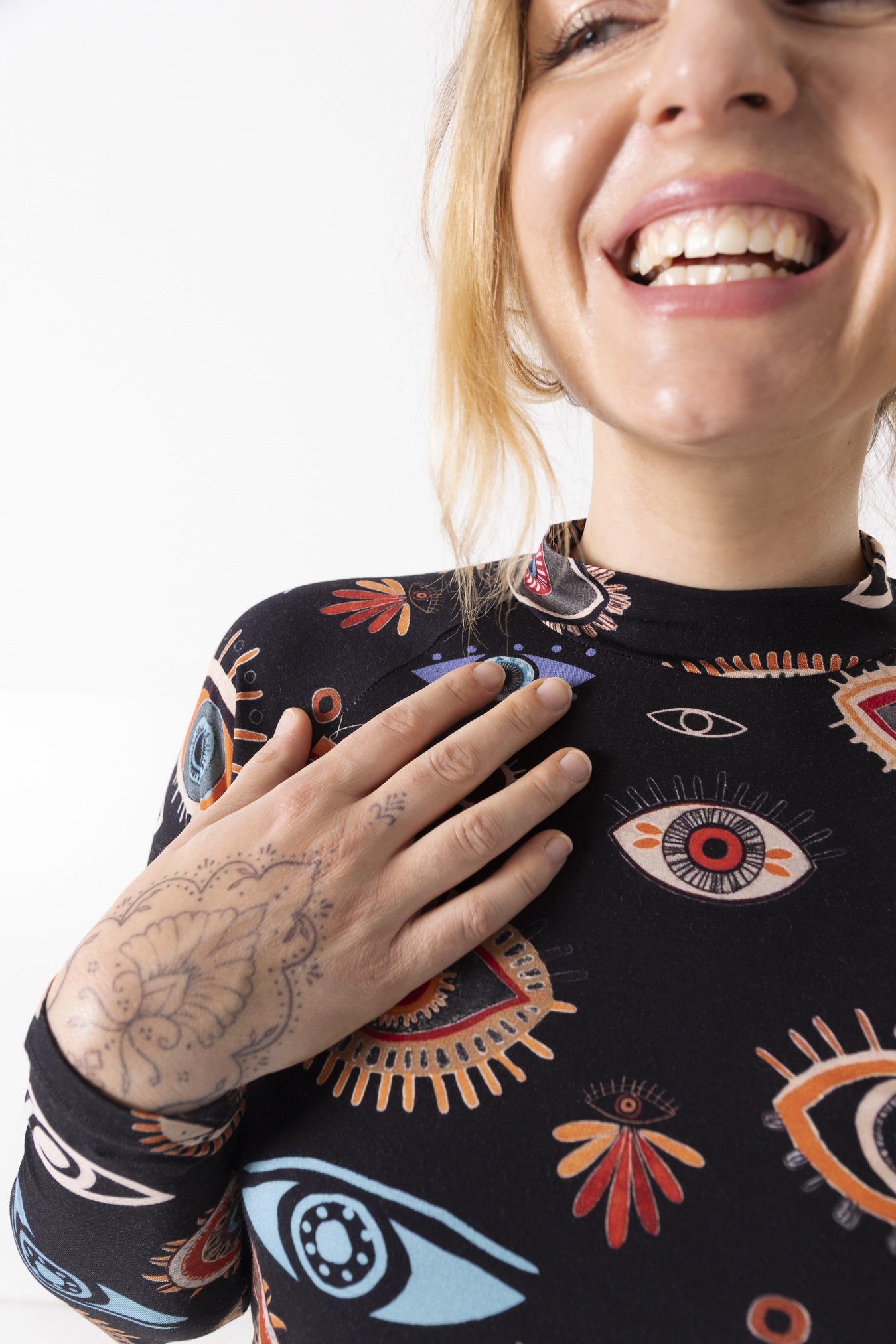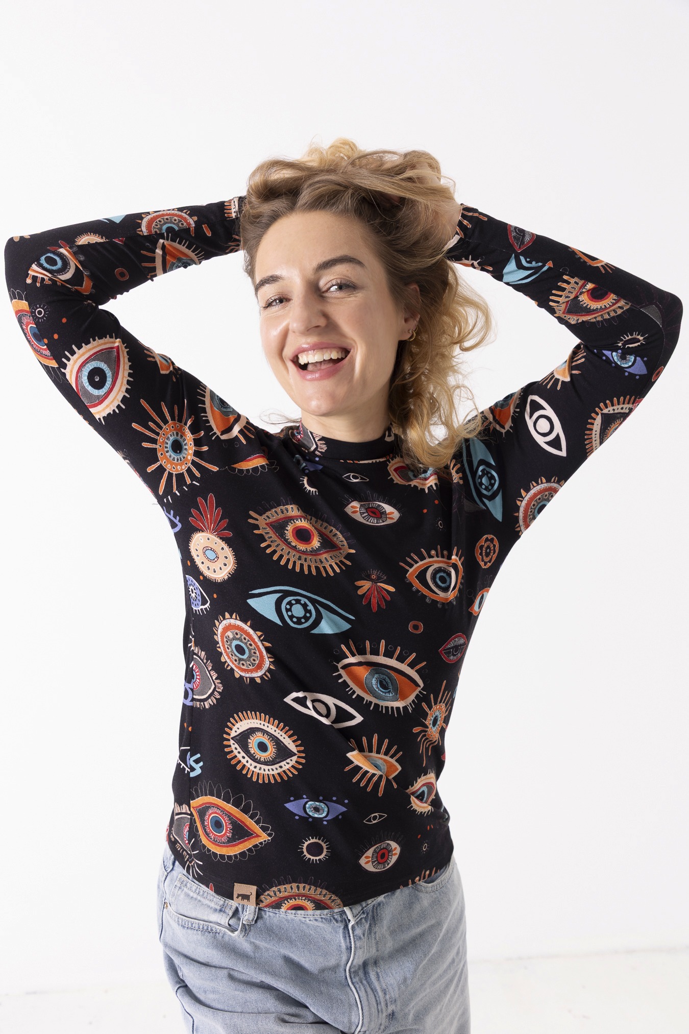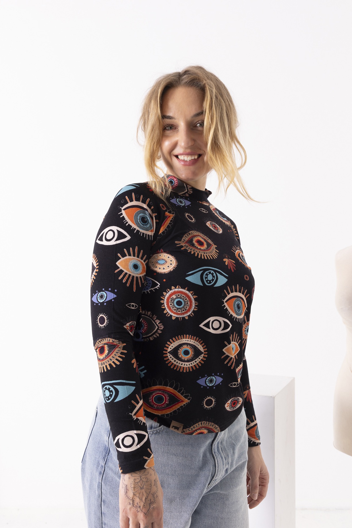 Uszyty z wiskozy bambusowej, która jest miękka i jedwabista, znacznie bardziej niż tradycyjna bawełna. Oddychająca, elastyczna i przyjemna w dotyku. Półgolf idealnie dopasowuje się do sylwetki, ale nie opina. Wzór w oczy dodaje mu charakteru i sprawia, że trudno od niego oderwać wzrok. Delikatny półgolf otula szyję, dodając ciepła i przytulności. Świetnie wygląda zarówno samodzielnie, jak i pod marynarką, kamizelką czy kurtką.