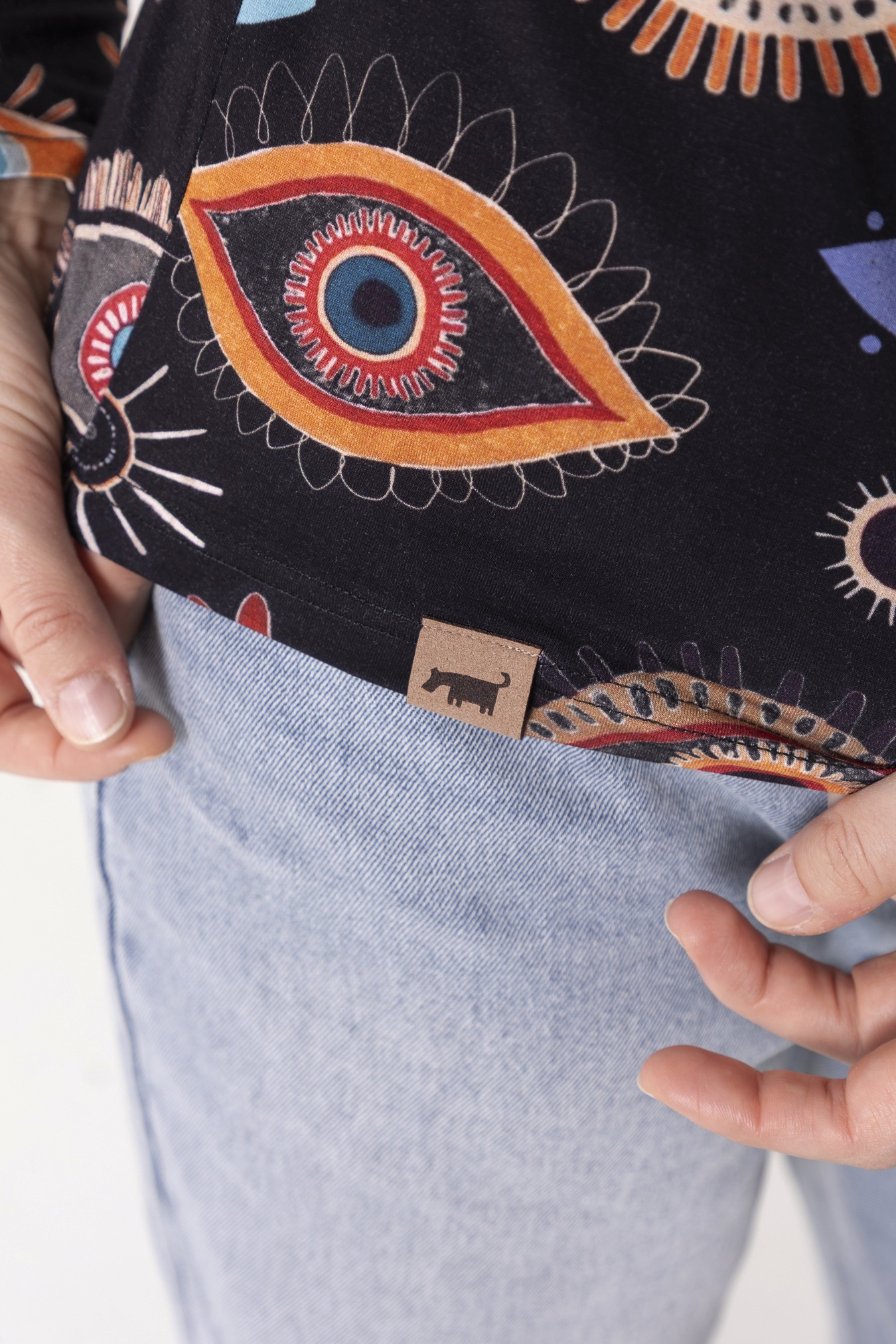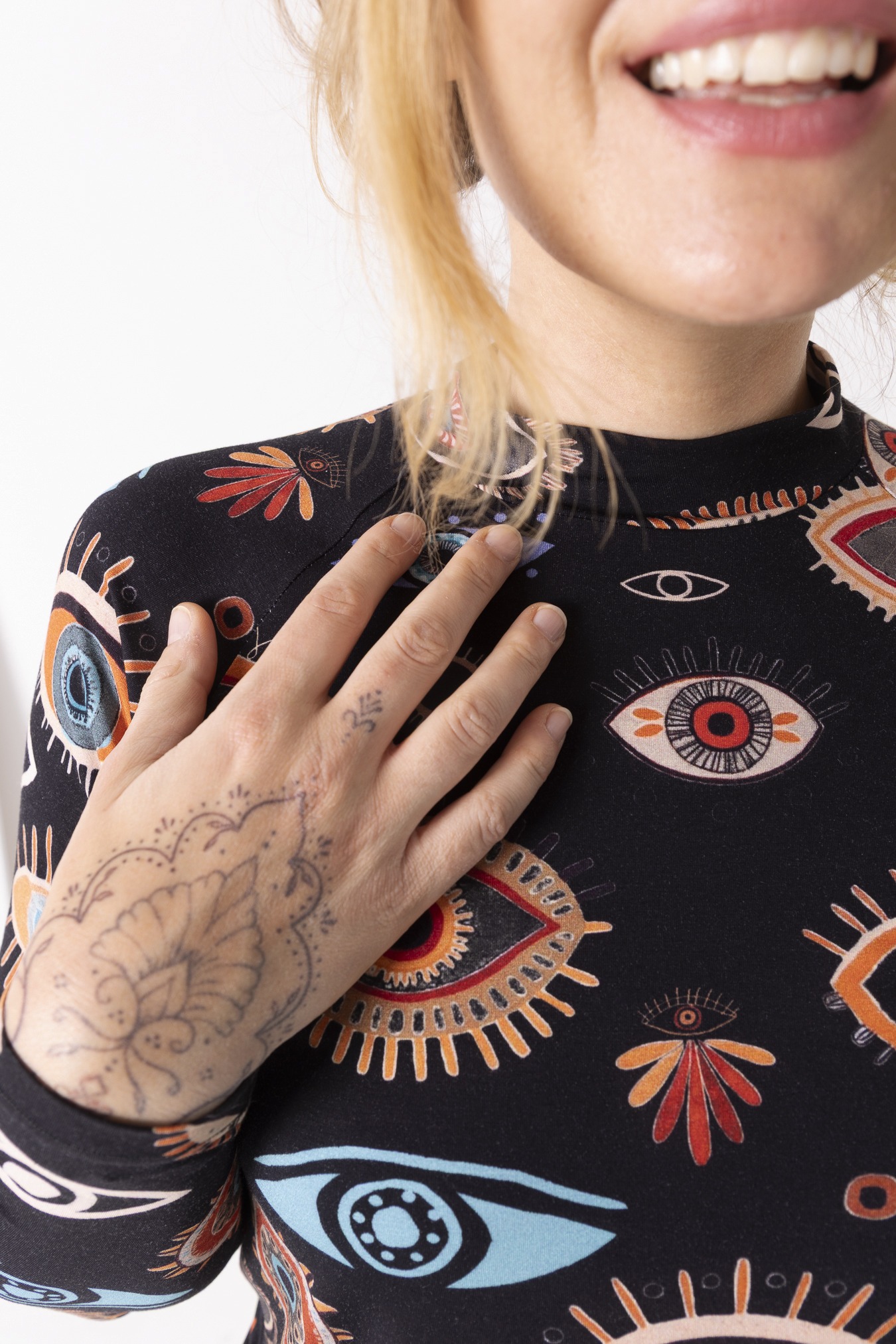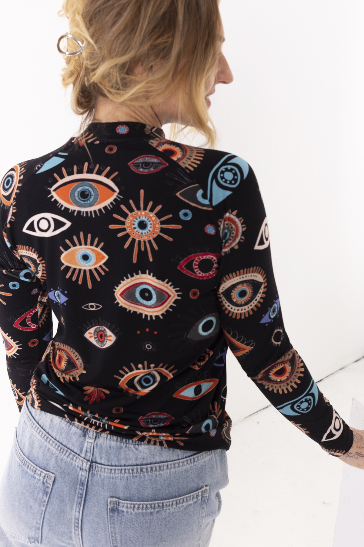 Uszyty z wiskozy bambusowej, która jest miękka i jedwabista, znacznie bardziej niż tradycyjna bawełna. Oddychająca, elastyczna i przyjemna w dotyku. Półgolf idealnie dopasowuje się do sylwetki, ale nie opina. Wzór w oczy dodaje mu charakteru i sprawia, że trudno od niego oderwać wzrok. Delikatny półgolf otula szyję, dodając ciepła i przytulności. Świetnie wygląda zarówno samodzielnie, jak i pod marynarką, kamizelką czy kurtką.