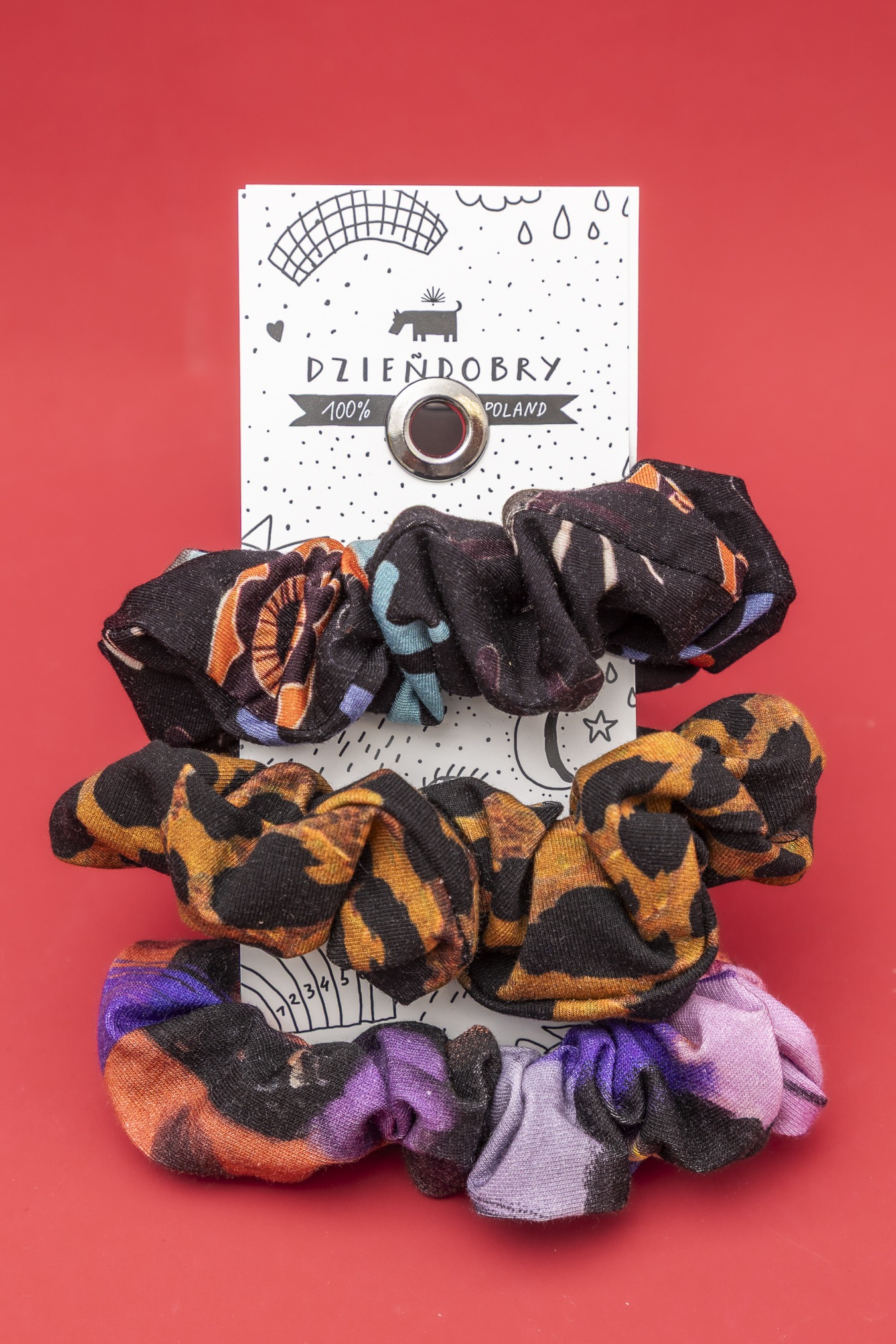 Trzy odważne wzory w jednym zestawie: efektowny Ojo Negro, klasyczny Leopard Print i żywy Mazunte. Te uniwersalne gumki do włosów są delikatne dla włosów i idealne na każdą okazję.