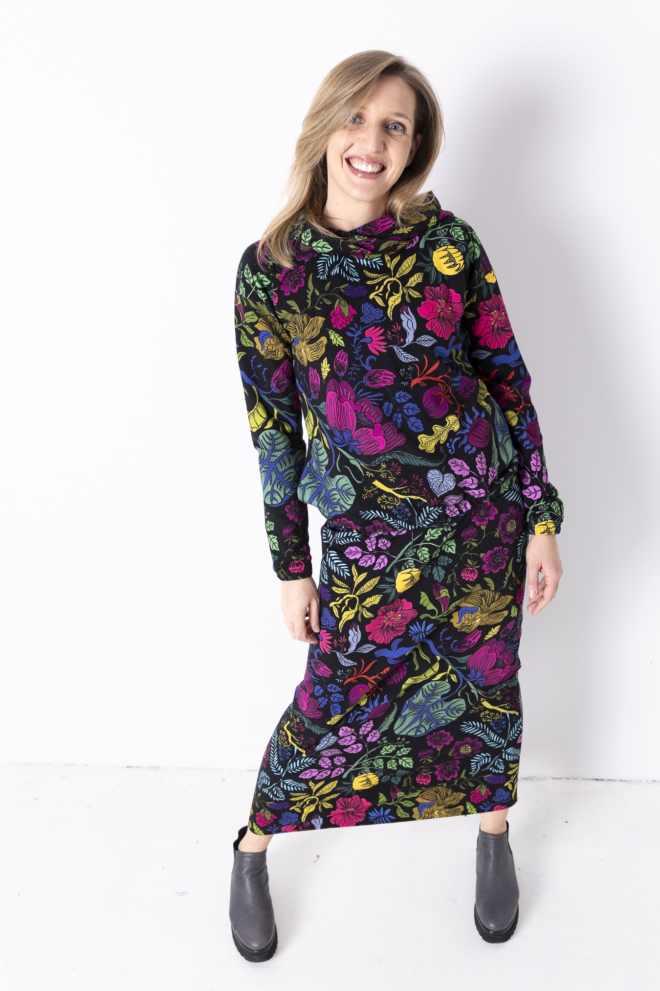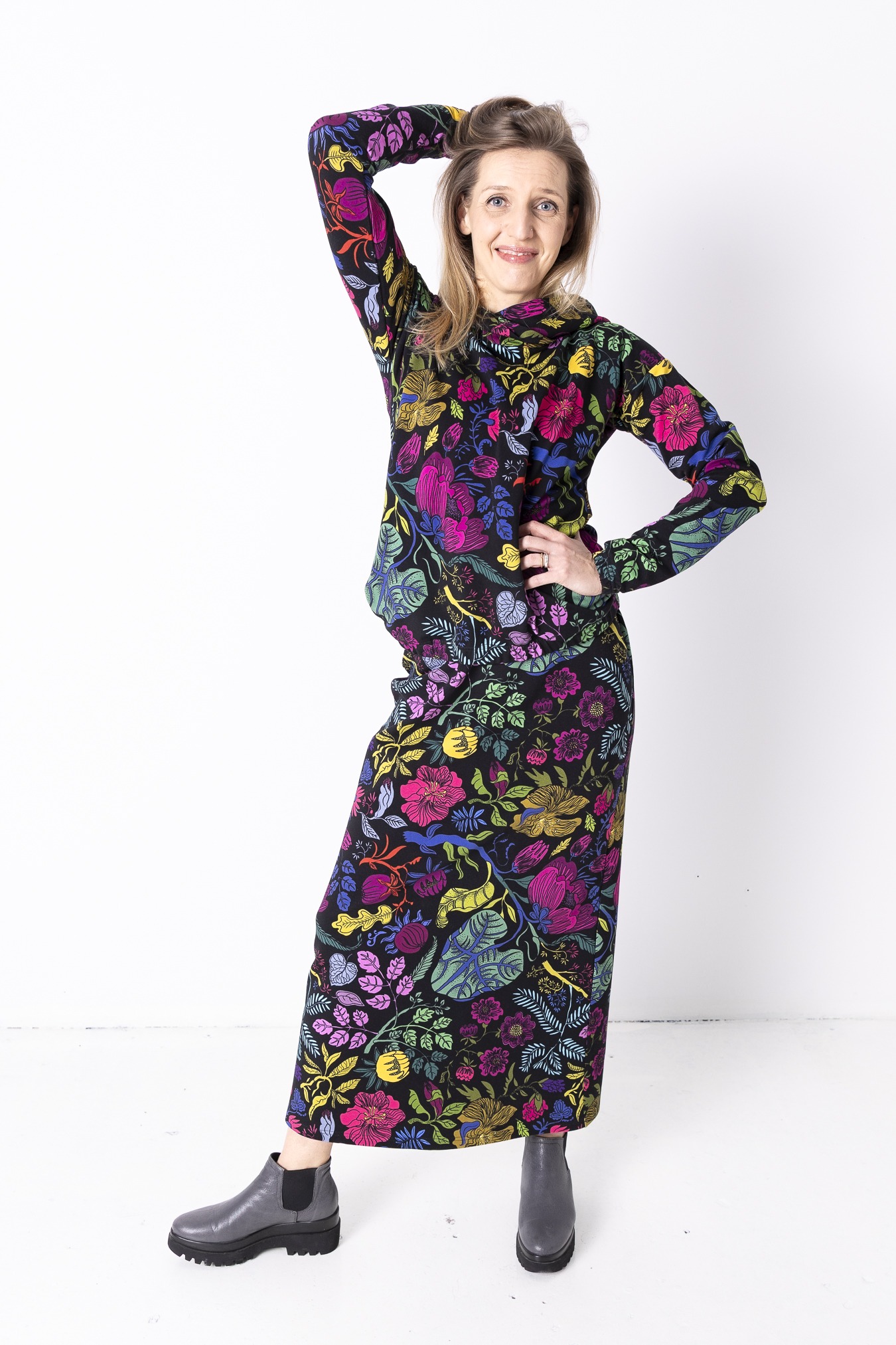 Czarny Ogród przywodzi na myśl wieczorny spacer po ogrodzie, gdy kolory stają się głębsze, a wszystko zwalnia. Czerń przełamana roślinnym motywem nadaje spódnicy charakteru, pozwala Ci być w zgodzie ze sobą, niezależnie od tempa dnia. To spódnica, która daje balans — jest blisko ciała, ale nie odbiera swobody. Miękka dzianina pracuje razem z Tobą, dopasowuje się do ruchu i sprawia, że noszenie jej przez cały dzień to czysta przyjemność. Brak kieszeni podkreśla czystą linię tuby i pozwala wzorowi grać pierwsze skrzypce. Uniwersalny krój – noś ją z gładką bluzą, T-shirtem albo koszulą.