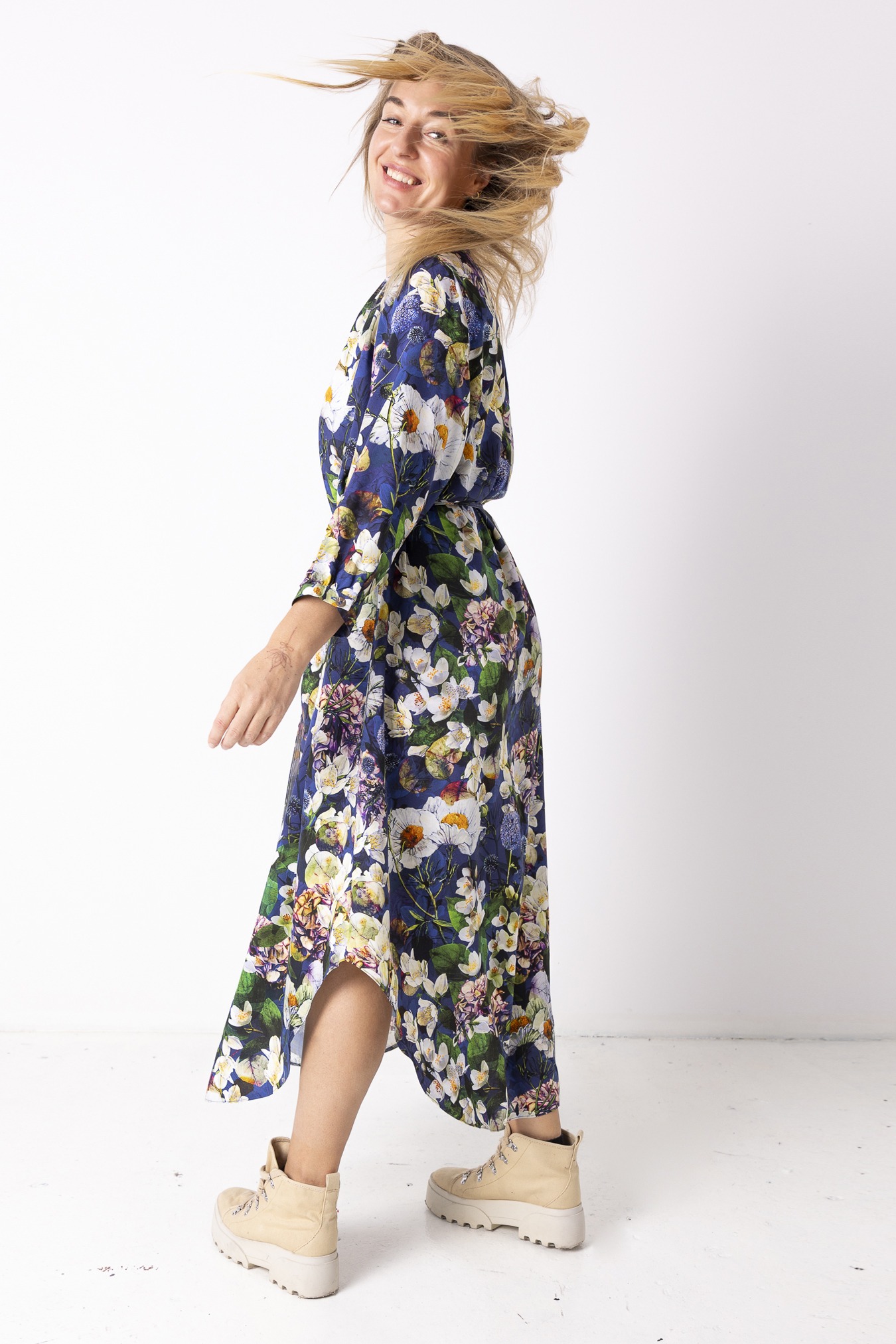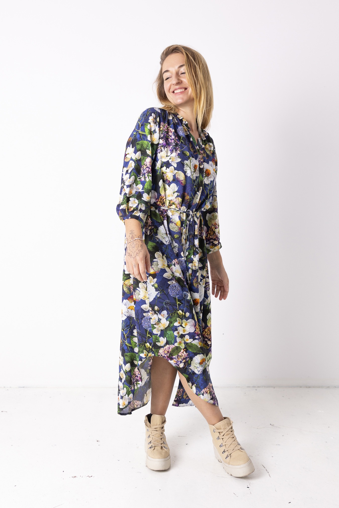 Sukienka koszulowa boho Hortensja to zaproszenie do zwolnienia tempa — lekka, miękko płynąca i stworzona do ruchu. Uszyta z przewiewnej wiskozy, delikatnie otula ciało i porusza się razem z Tobą, jakby znała Twój rytm. Szerokie rękawy dodają jej swobody i tego charakterystycznego boho luzu, który najlepiej czuć w ciepłe dni, gdy nie chcesz niczego „na sztywno”. Odcinana pod linią biustu, z subtelnym marszczeniem, pozwala sylwetce oddychać, a dekolt w serek lekko wydłuża szyję i wprowadza w całość nutę lekkości i kobiecej miękkości.
