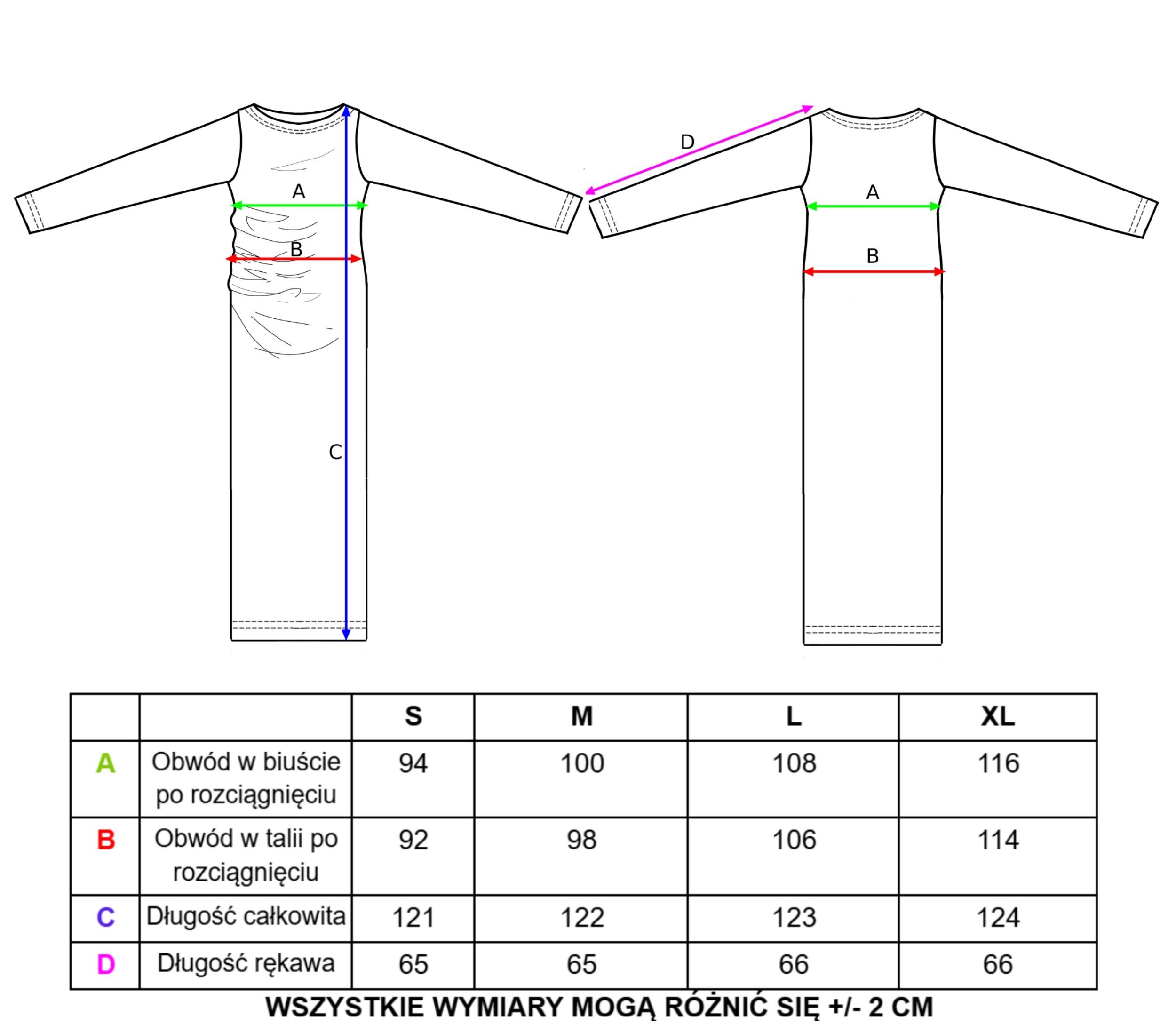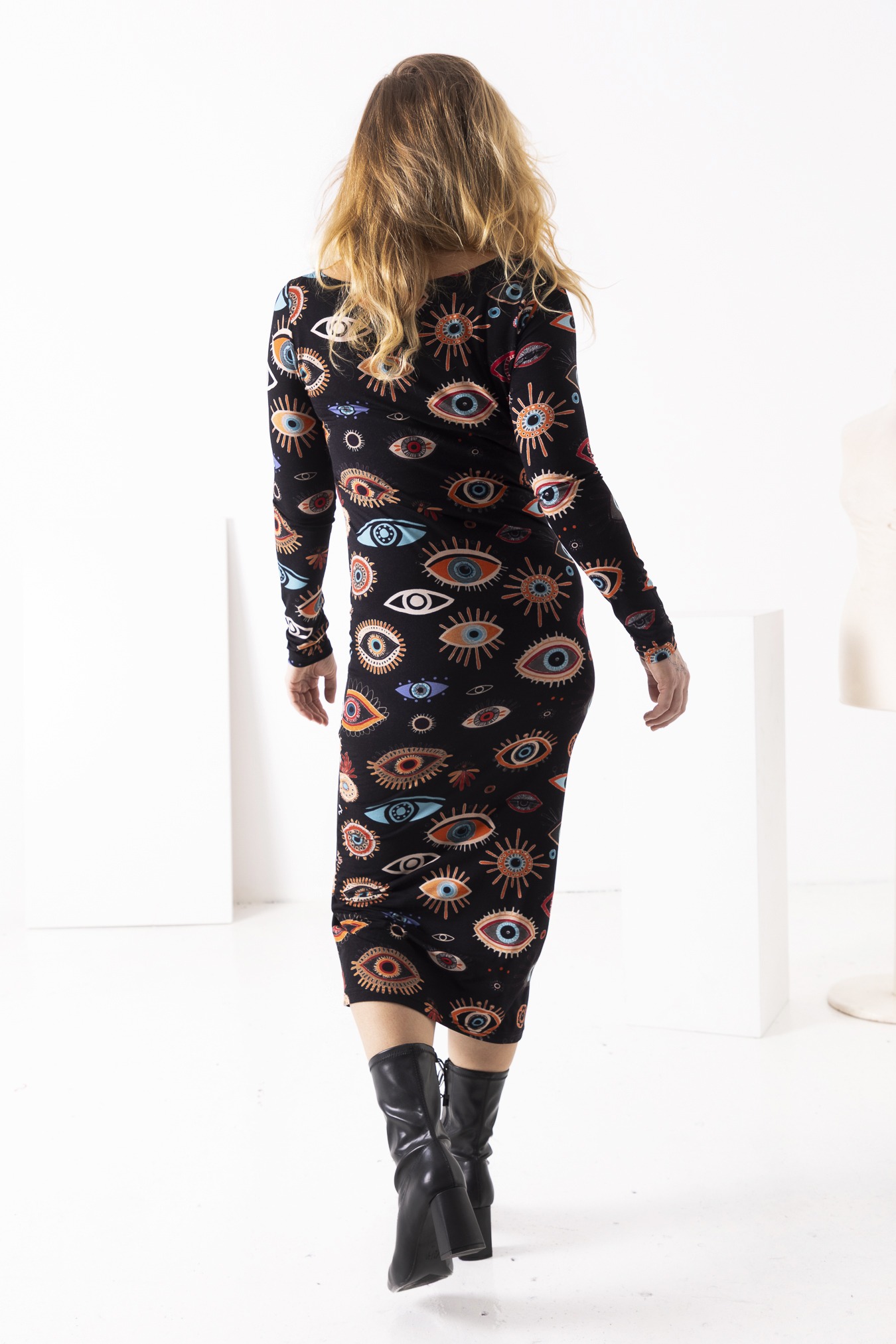 Czy to sukienka „na dzień, który chcesz zapamiętać”. Zmysłowa i wygodna – dokładnie taka, jakiej potrzebujesz, gdy chcesz czuć się kobieco, ale bez rezygnowania z komfortu. Uszyta z delikatnej, elastycznej wiskozy bambusowej, która miękko otula ciało i dopasowuje się do sylwetki, pozwalając skórze oddychać. Drapowanie z boku subtelnie modeluje figurę, podkreślając to, co warto, i ukrywając to, co chcesz zostawić dla siebie. Długi rękaw dodaje elegancji, a wzór Ojo Negro – z tajemniczymi oczami i głęboką czernią – przyciąga uwagę i intryguje.