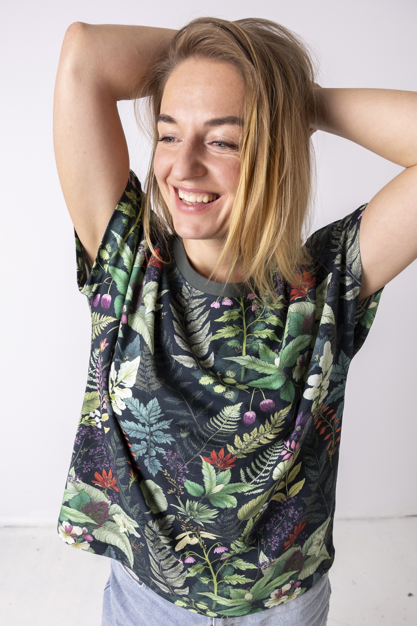 To ten moment, kiedy zakładasz coś „zwykłego”… a czujesz, że wszystko gra. Nowa forma z obniżoną linią ramion i krótkie, szerokie rękawy tworzą swobodną formę, która nie narzuca się sylwetce. Długość i proporcje sprawiają, że koszulka układa się miękko i daje ten przyjemny efekt luzu — bez wysiłku, bez udawania Wzór Kwiat Paproci tajemniczy i zapadający w pamięć. Otula naturalnością — miękka, 100% bawełna daje skórze oddech i lekkość, którą czuć od pierwszej chwili.