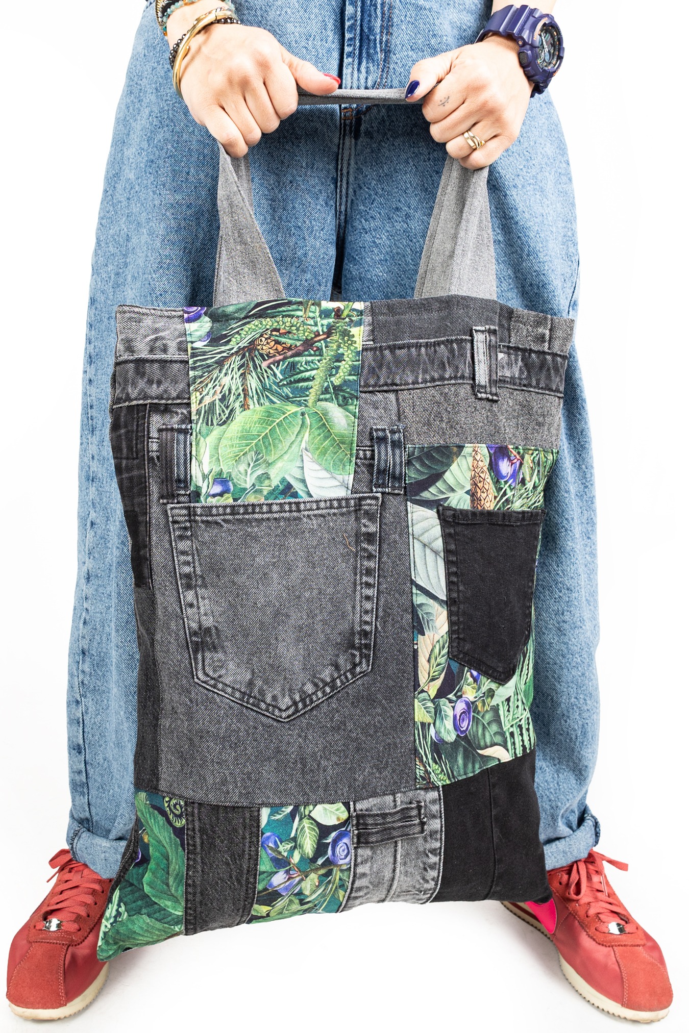Oto torba z naszej kolekcji upcyklingowej. Powstała z materiałów, którym dajemy drugie życie — łączymy nasze produkcyjne tkaniny z wyselekcjonowanymi jeansami z drugiego obiegu.