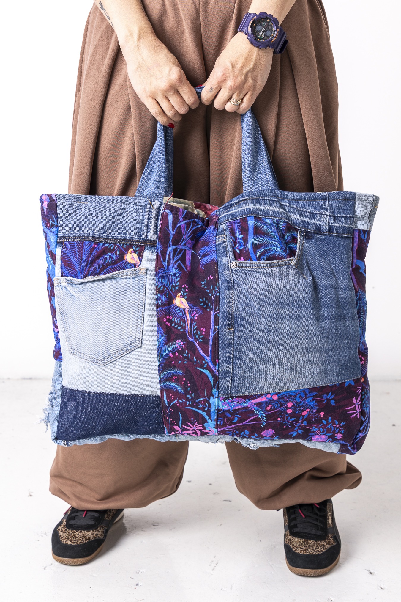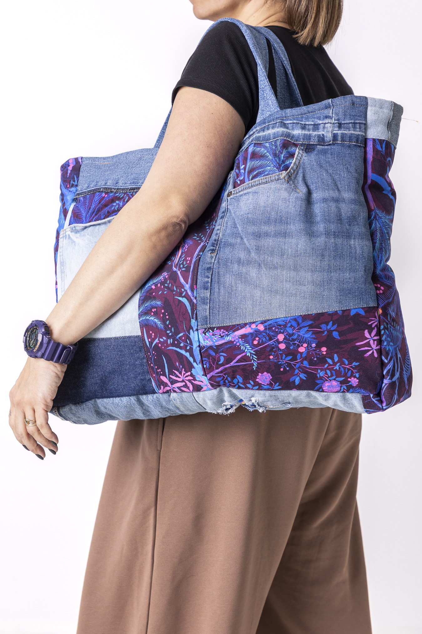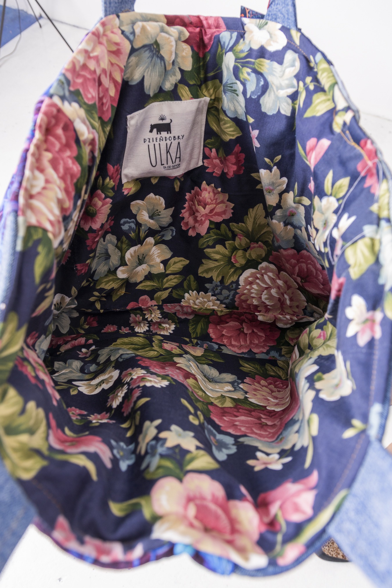 Uszyta z wytrzymałych materiałów, gotowa na zakupy, siłownię, jogę, pilates, czy szybki wypad po pracy. Lekka, poręczna i po prostu… uroczo praktyczna. Ma wygodne uchwyty – łatwa do noszenia w ręce lub na ramieniu. Torba szyta z wyselekcjonowanych jeansów z drugiego obiegu i kolorowych materiałów— każdy egzemplarz jest unikatowy.
