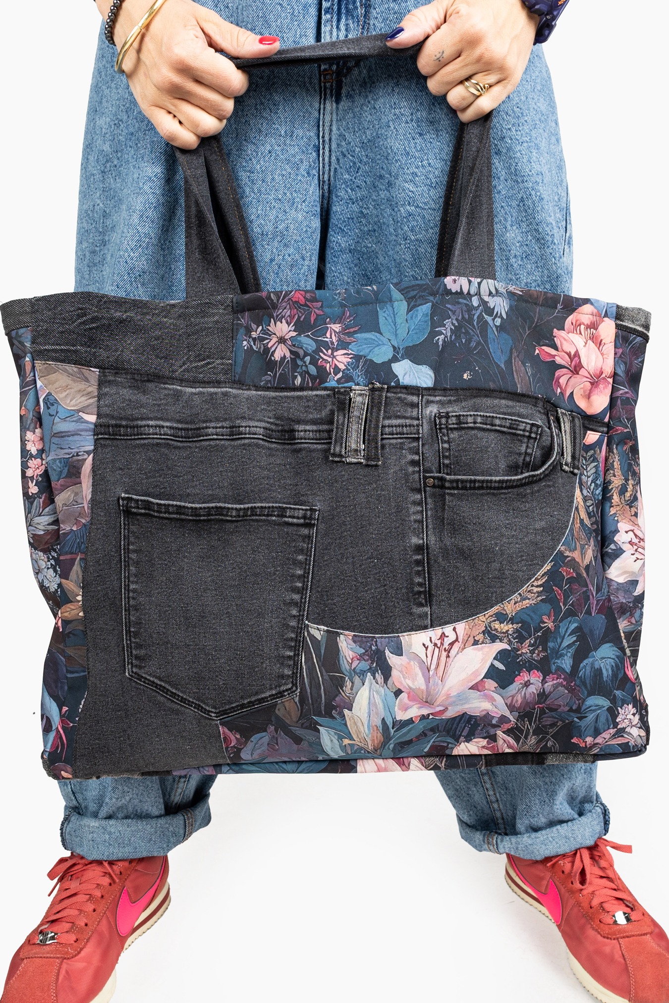 Uszyta z wytrzymałych materiałów, gotowa na zakupy, siłownię, jogę, pilates, czy szybki wypad po pracy. Lekka, poręczna i po prostu… uroczo praktyczna. Ma wygodne uchwyty – łatwa do noszenia w ręce lub na ramieniu. Torba szyta z wyselekcjonowanych jeansów z drugiego obiegu i kolorowych materiałów— każdy egzemplarz jest unikatowy.