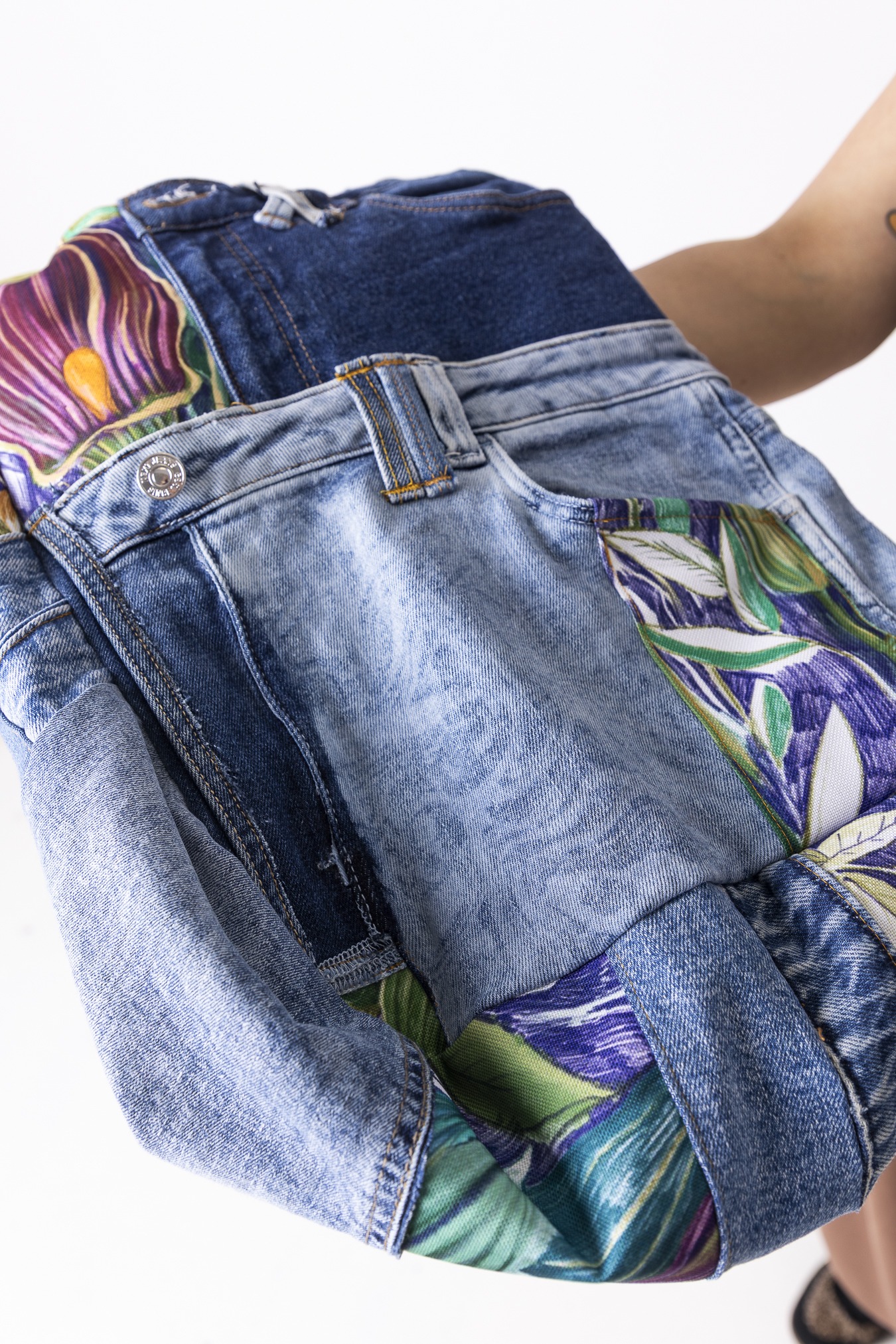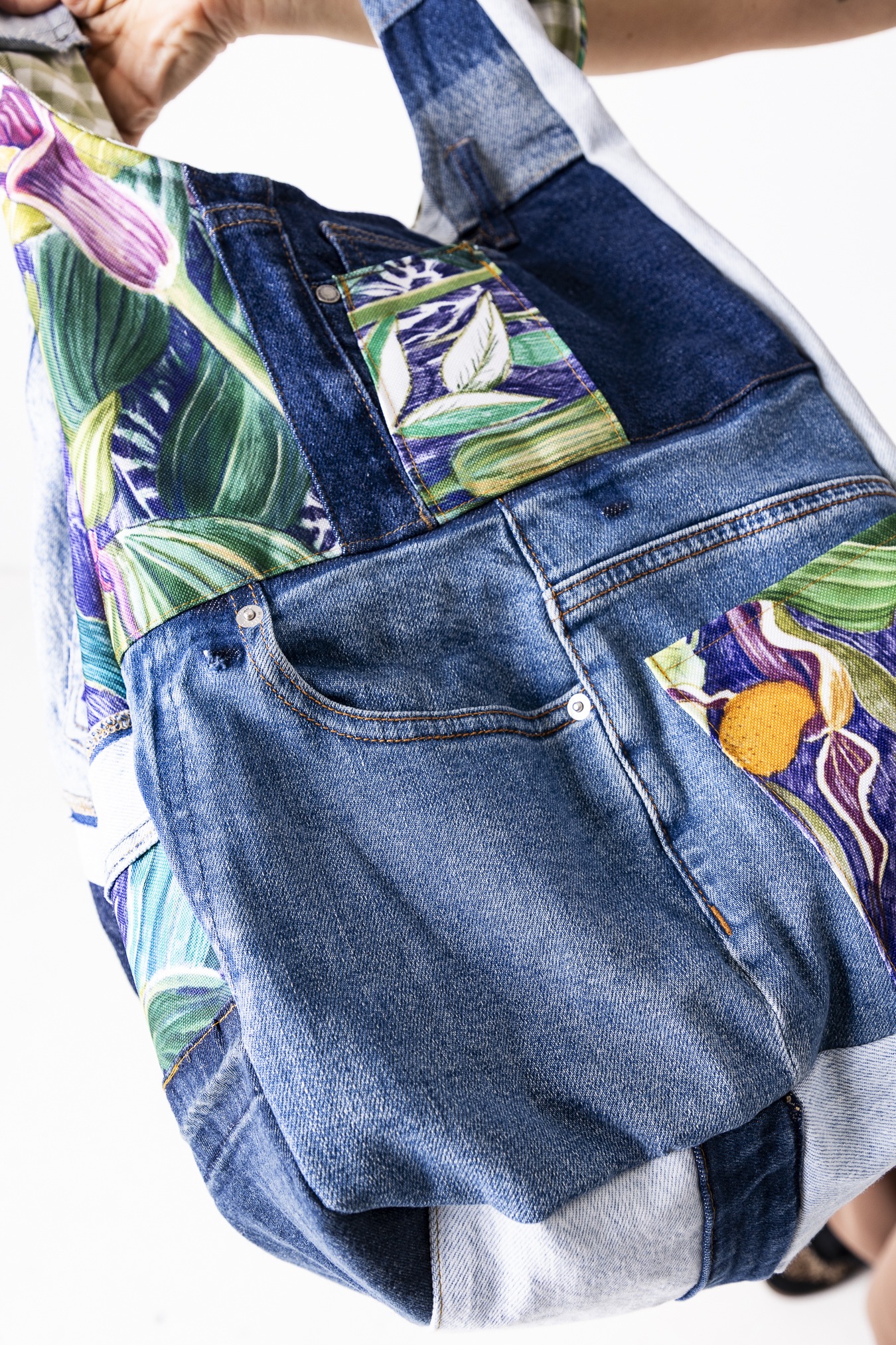 Oto torba z naszej kolekcji upcyklingowej. Powstał z materiałów, którym dajemy drugie życie — łączymy nasze produkcyjne tkaniny z wyselekcjonowanymi jeansami z drugiego obiegu. Każdy egzemplarz różni się detalami i układem wstawek — dlatego każda torba jest jedyna w swoim rodzaju.