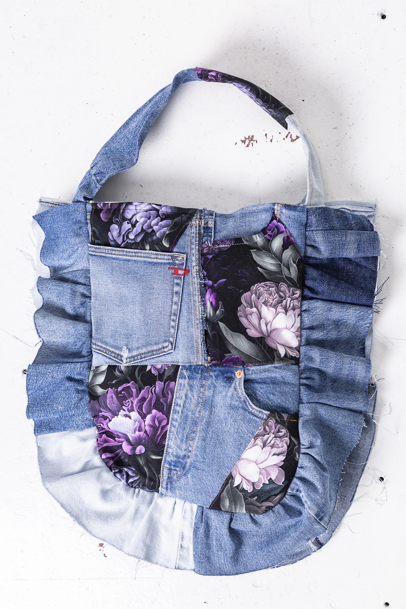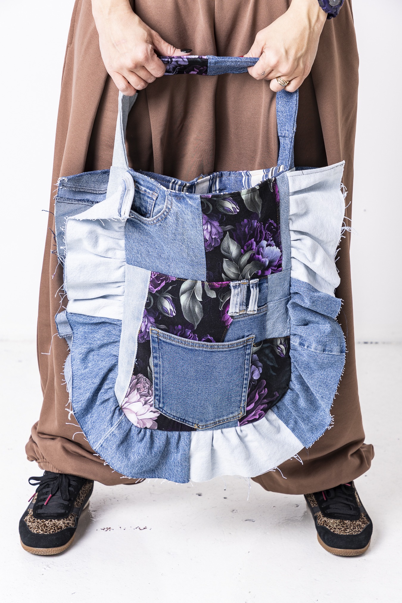 Oto torba z kolekcji upcyklingowej. Powstał z materiałów, którym dajemy drugie życie — łączymy nasze produkcyjne tkaniny z wyselekcjonowanymi jeansami z drugiego obiegu. Każdy egzemplarz różni się detalami i układem wstawek — dlatego każda torba jest unikatowa.