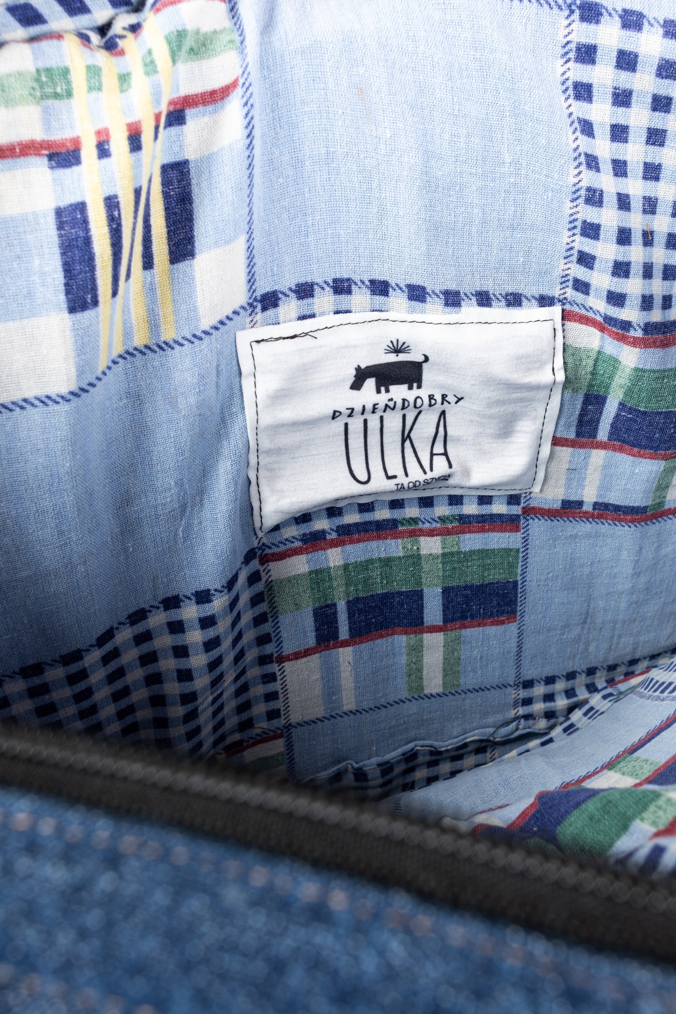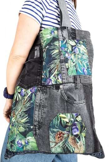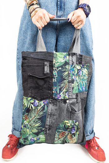 Oto torba z naszej kolekcji upcyklingowej. Powstała z materiałów, którym dajemy drugie życie — łączymy nasze produkcyjne tkaniny z wyselekcjonowanymi jeansami z drugiego obiegu.
