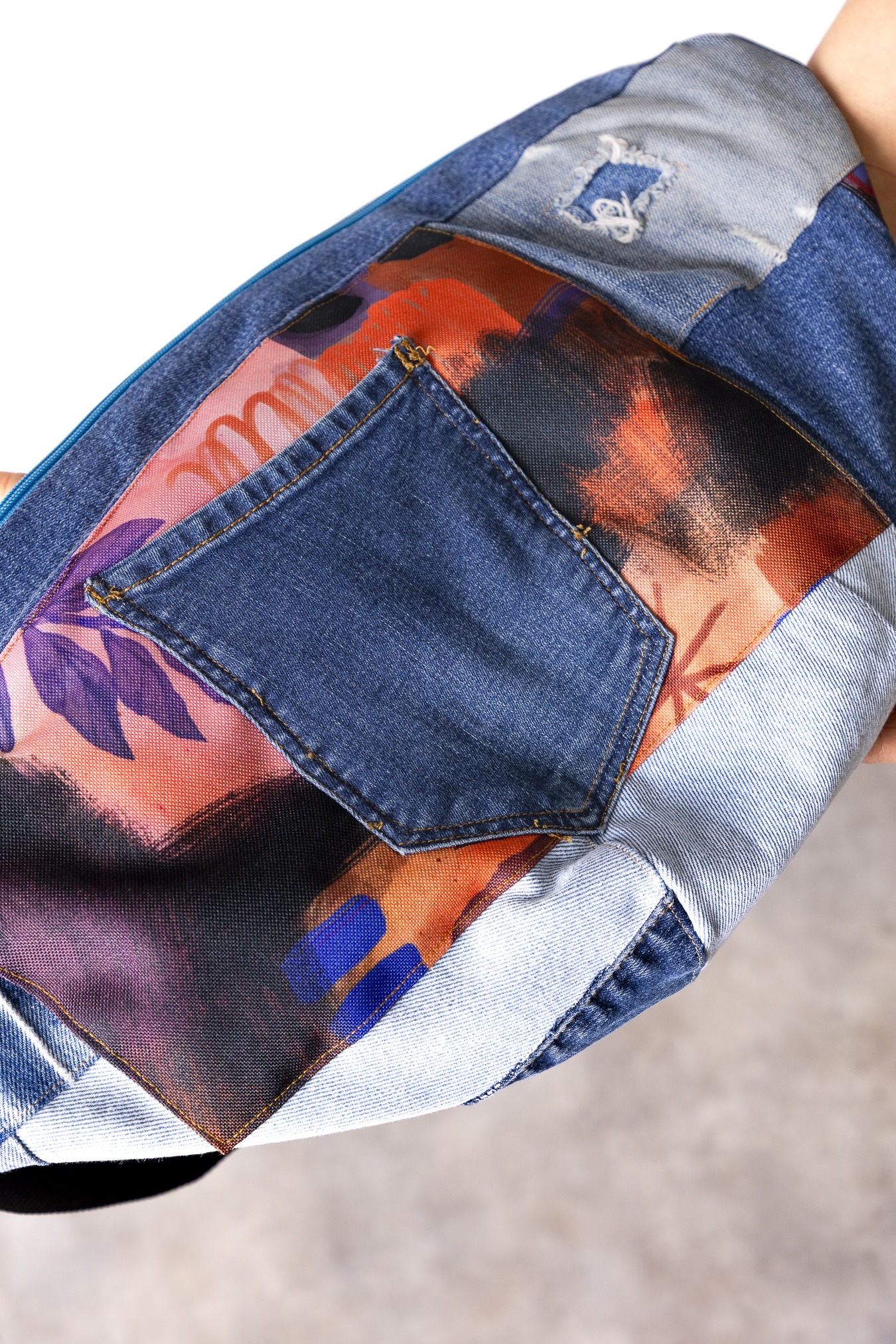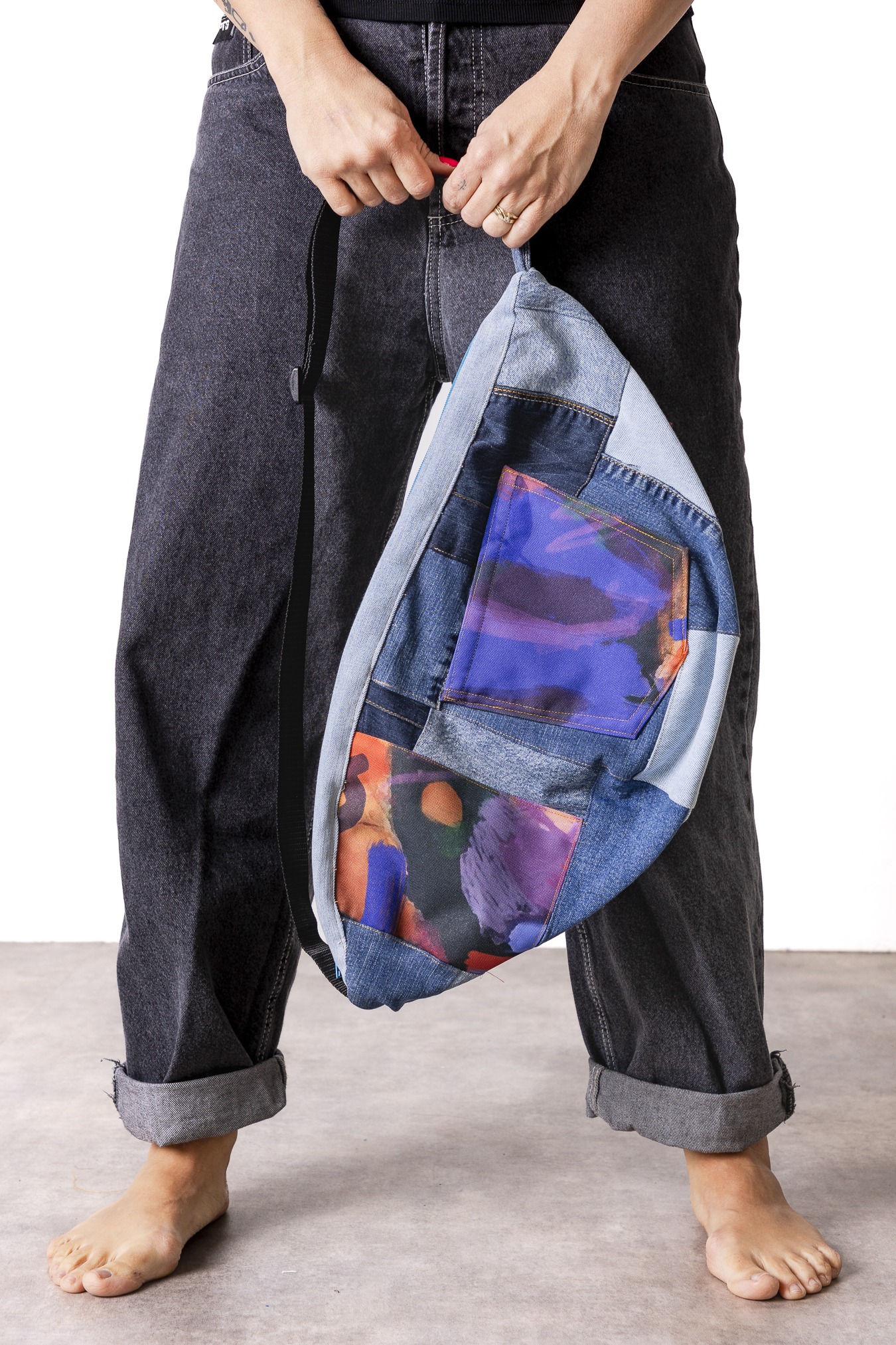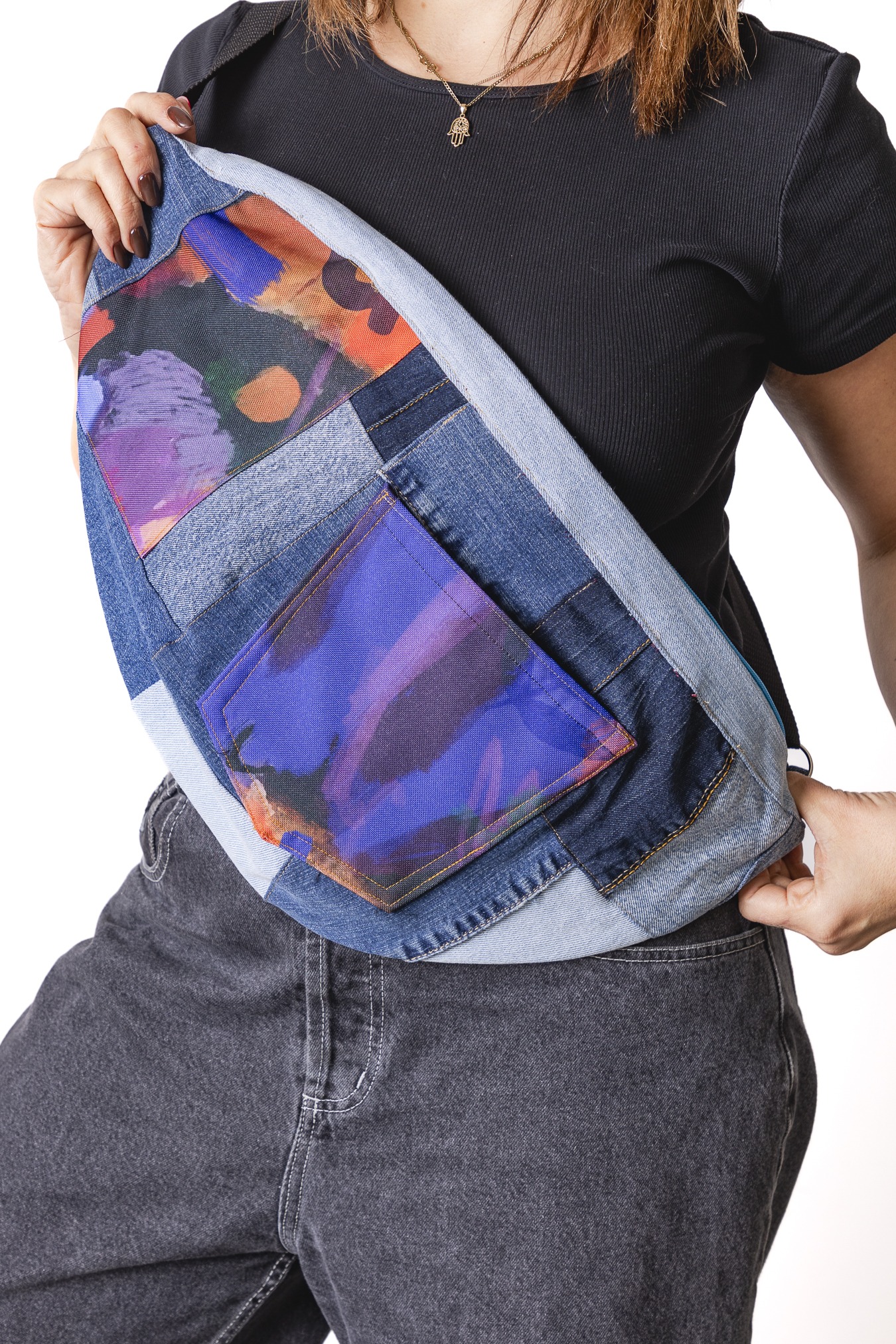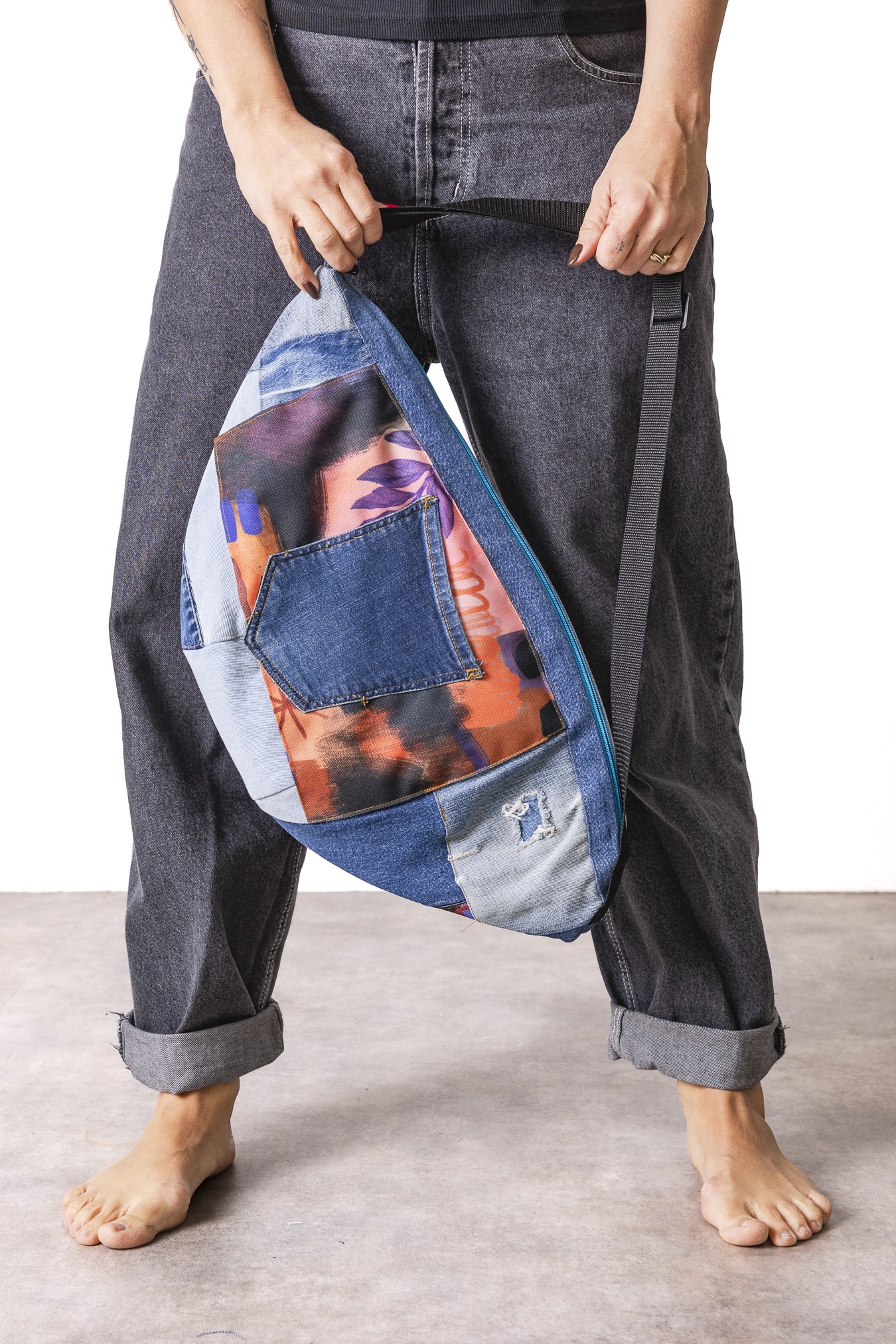 Torbo-nerka szyta z wyselekcjonowanych jeansów z drugiego obiegu i kolorowych materiałów — każdy egzemplarz jest unikatowy. Nosisz ją tak, jak lubisz: na biodrze, przewieszoną przez ramię albo wysoko na klatce. Jest lekka, wygodna i zaskakująco pojemna — zmieści telefon, portfel, klucze i te drobiazgi, bez których nie wychodzisz z domu.