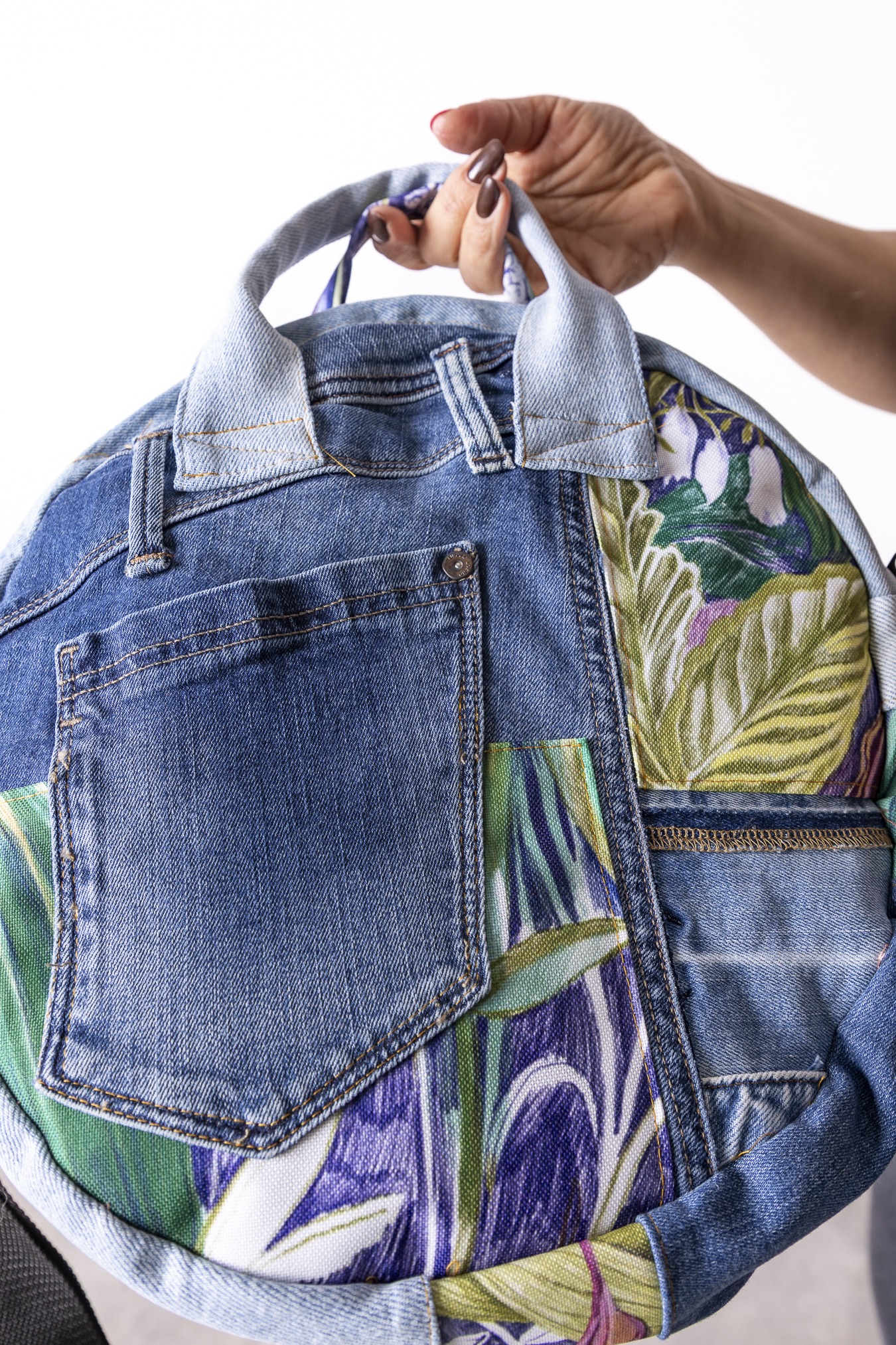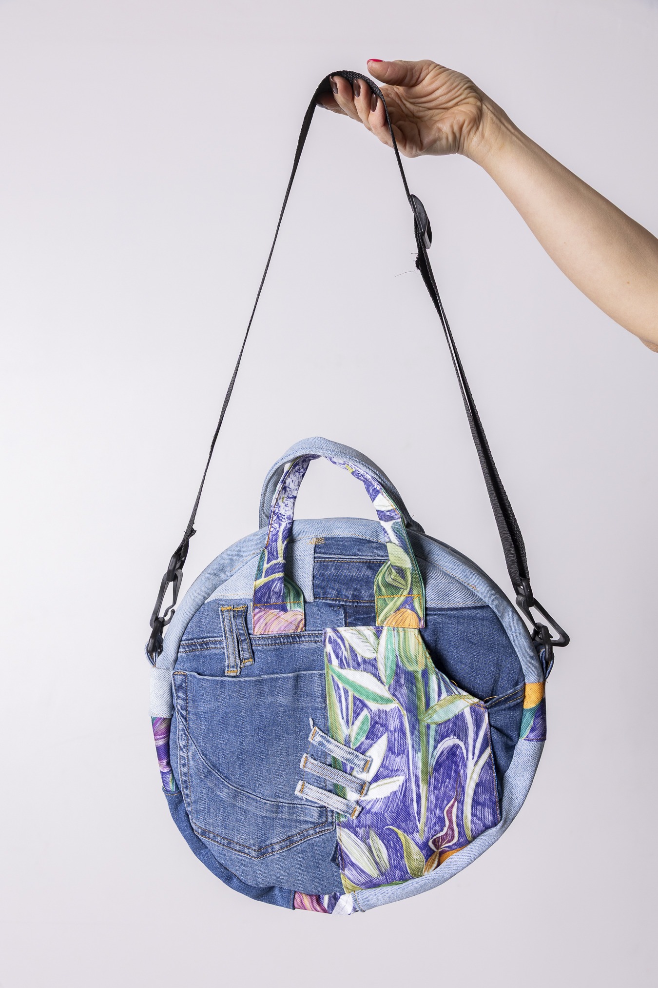 Pojemna i praktyczna – idealna na podróże i codzienne wyjazdy. Upcyklingowe materiały – jeans z drugiego obiegu i nasze materiały poprodukcyjne, sprawiają, że ta okrągła torba jest solidna, a przy tym pełna koloru i dobrego nastroju. Zaprojektowana i uszyta z myślą o dawaniu rzeczom drugiego życia. Każdy egzemplarz jest unikatowy. Solidna, pojemna i wygodna, idealna na co dzień i w podróży torba na drobiazgi. W dwóch wariantach Grzybki i Lila.
