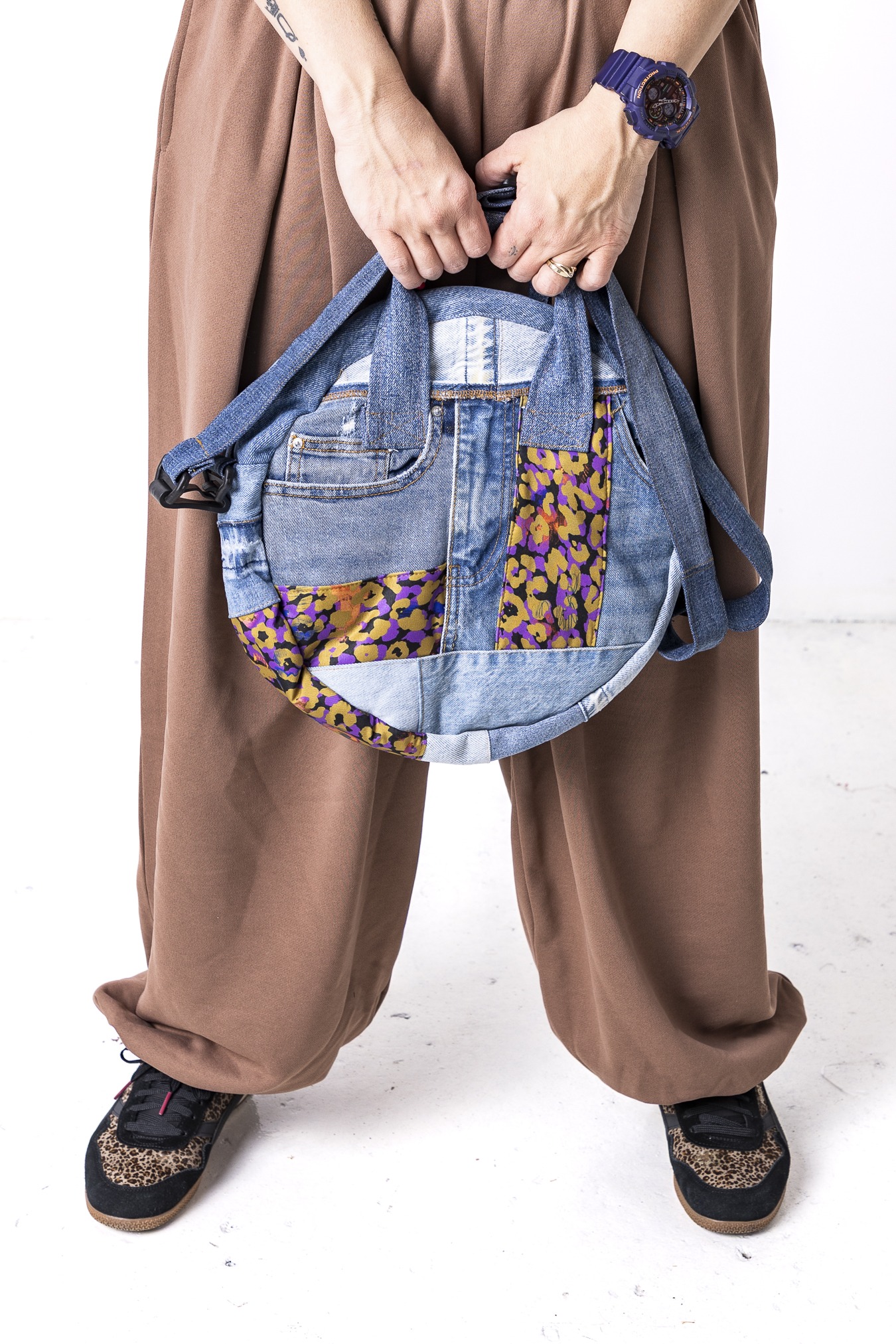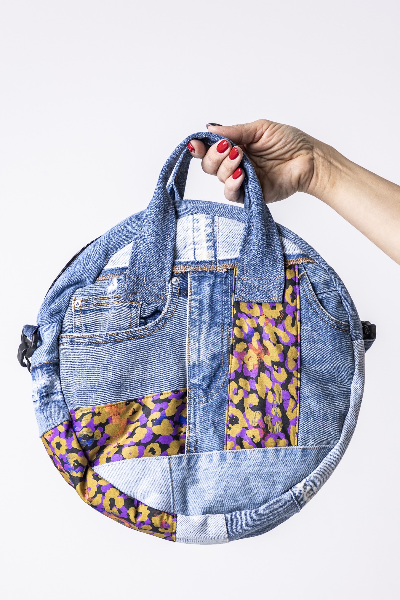 To torba, która niesie nie tylko Twoje rzeczy, ale też historię — o uważności, radości i mądrym wykorzystywaniu tego, co już mamy. Okrągła torba szyta z wyselekcjonowanych jeansów z drugiego obiegu i kolorowych materiałów, w tym nasz wzór, poznajecie? — każdy egzemplarz jest unikatowy. Solidna, pojemna i wygodna – torba na drobiazgi.