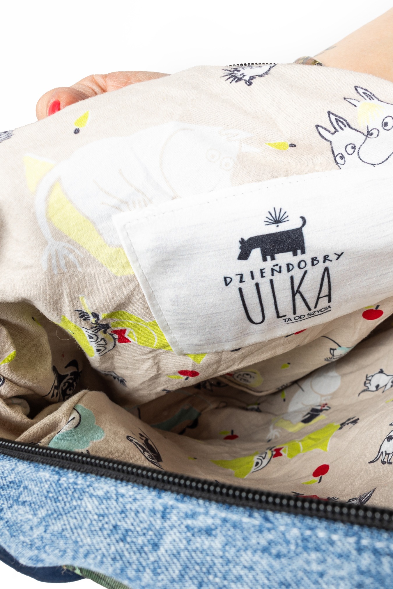 Oto torba z naszej kolekcji upcyklingowej. Powstała z materiałów, którym dajemy drugie życie — łączymy nasze produkcyjne tkaniny z wyselekcjonowanymi jeansami z drugiego obiegu. Każdy egzemplarz różni się detalami i układem wstawek — dlatego każda torba jest jedyna w swoim rodzaju.