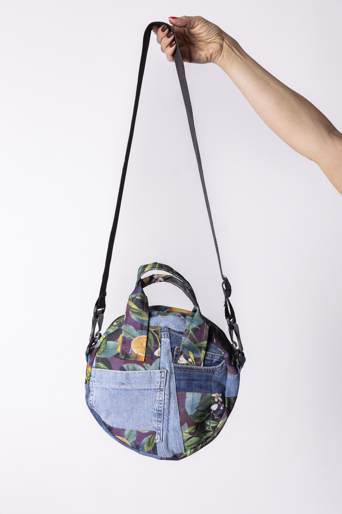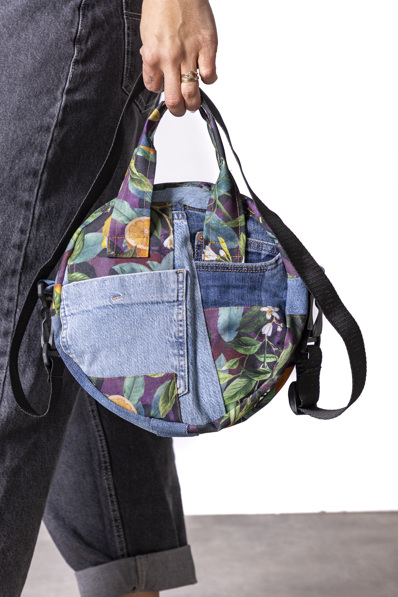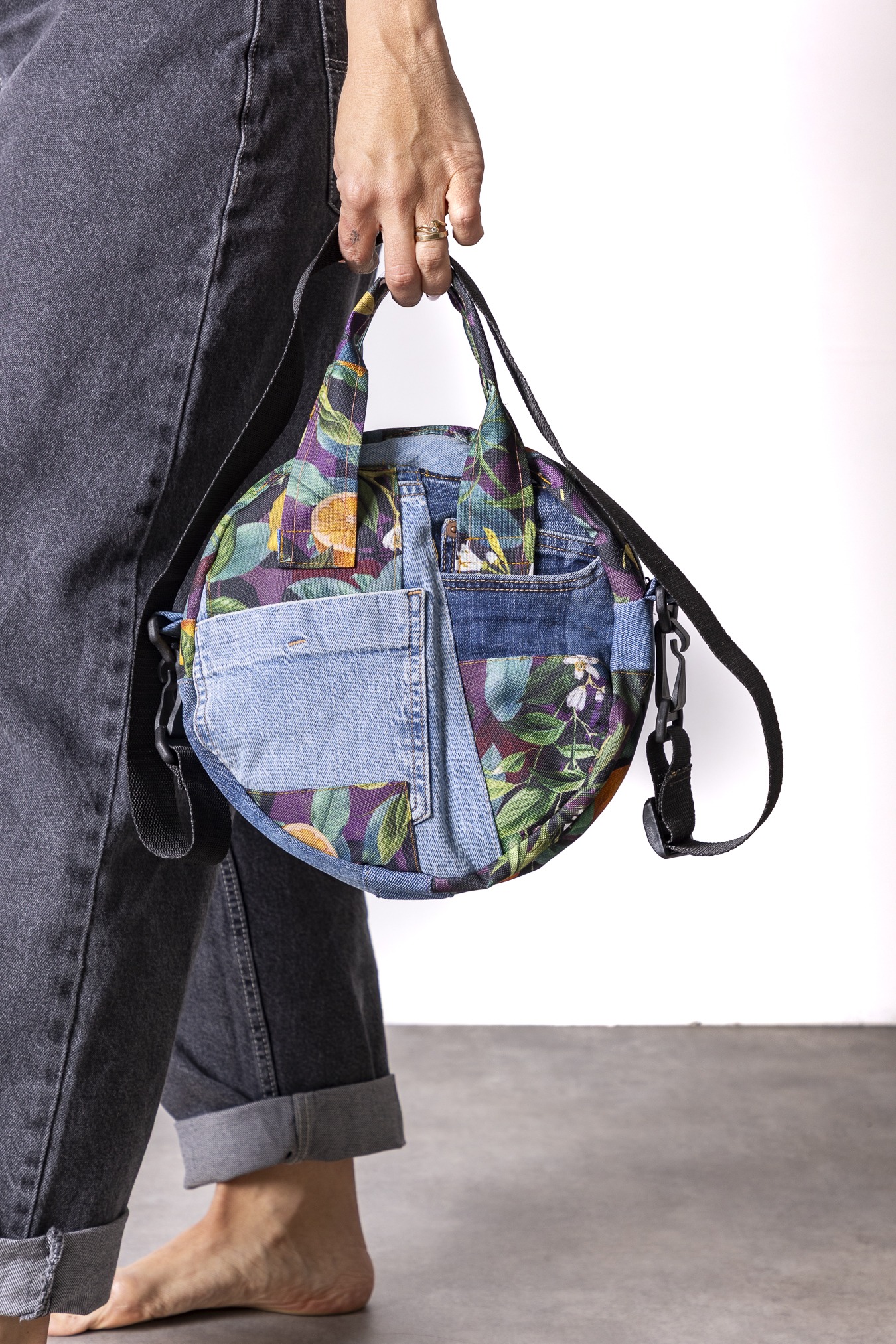 Jej okrągły kształt przyciąga spojrzenia, a kontrast między surowym jeansem a energetycznym wzorem dodaje jej charakteru i lekkości. To torba, która pasuje zarówno do codziennych spacerów, jak i do wyjść, kiedy chcesz mieć przy sobie tylko to, co najważniejsze — ale w dobrym nastroju. Okrągła torba szyta z wyselekcjonowanych jeansów z drugiego obiegu i kolorowych materiałów — każdy egzemplarz jest unikatowy. Solidna, pojemna i wygodna, idealny na co dzień i w podróży torba na drobiazgi.