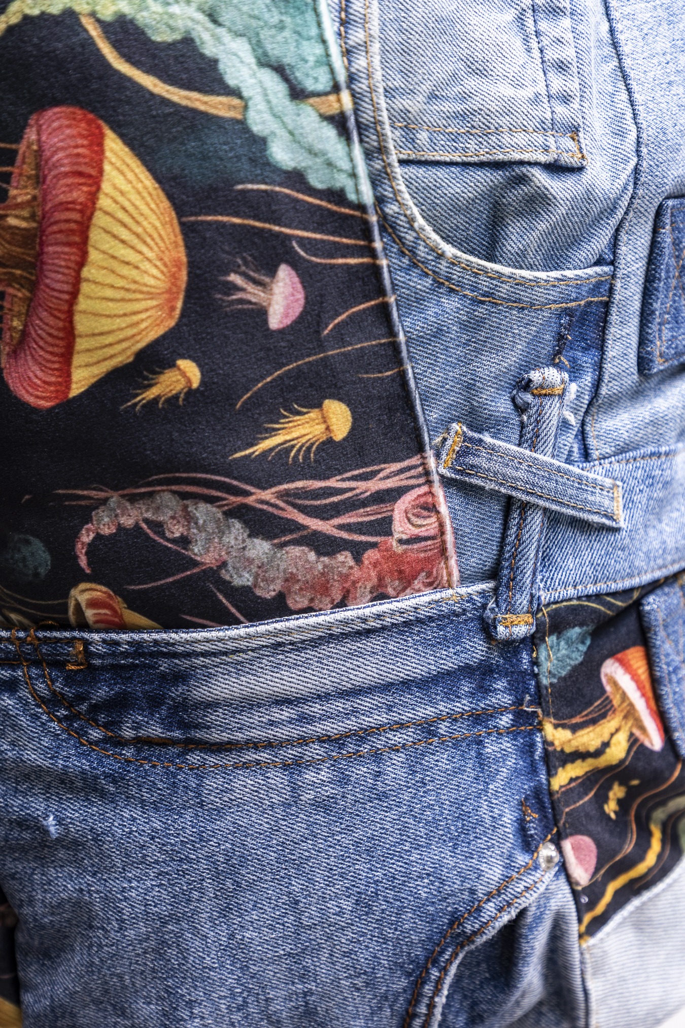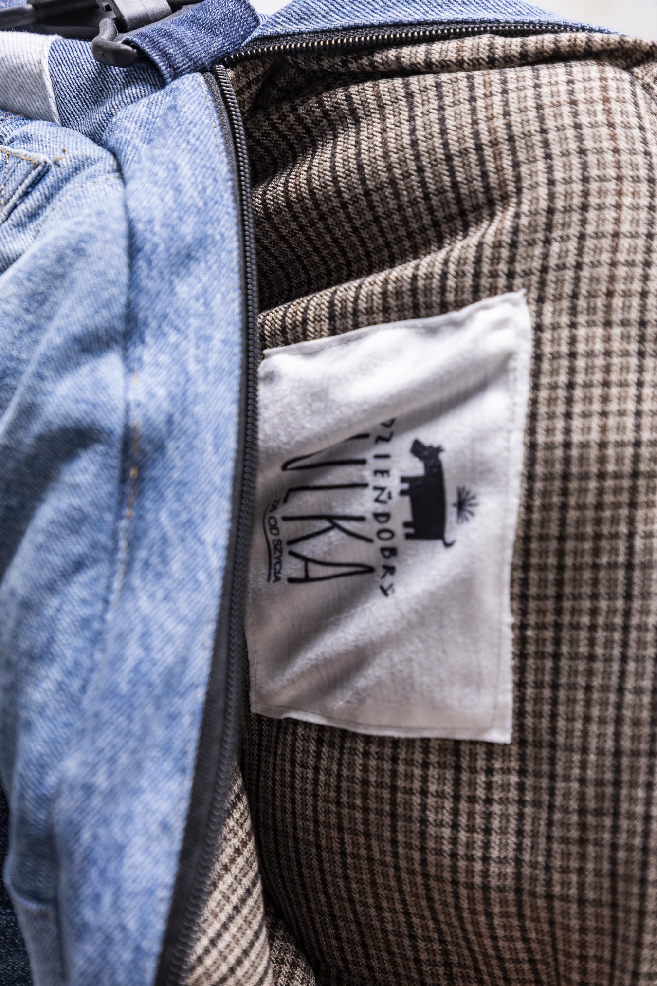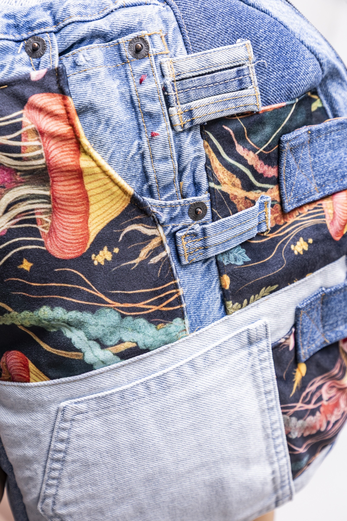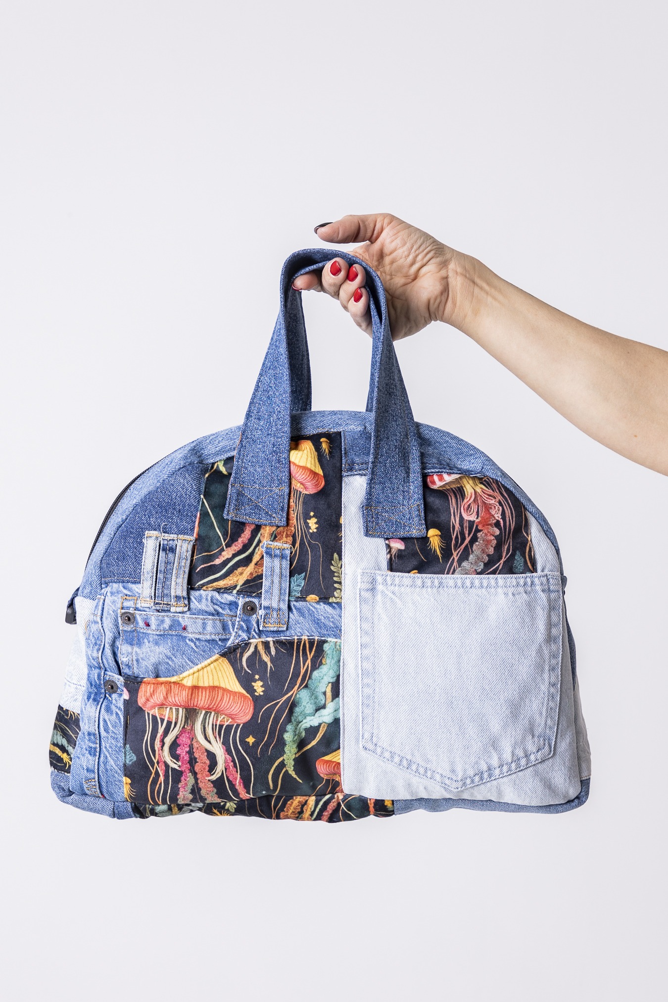 Materiały: jeans i tkaniny dzieńdobry (pozostałości produkcyjne). Każdy egzemplarz może różnić się układem wzorów i kolorów.