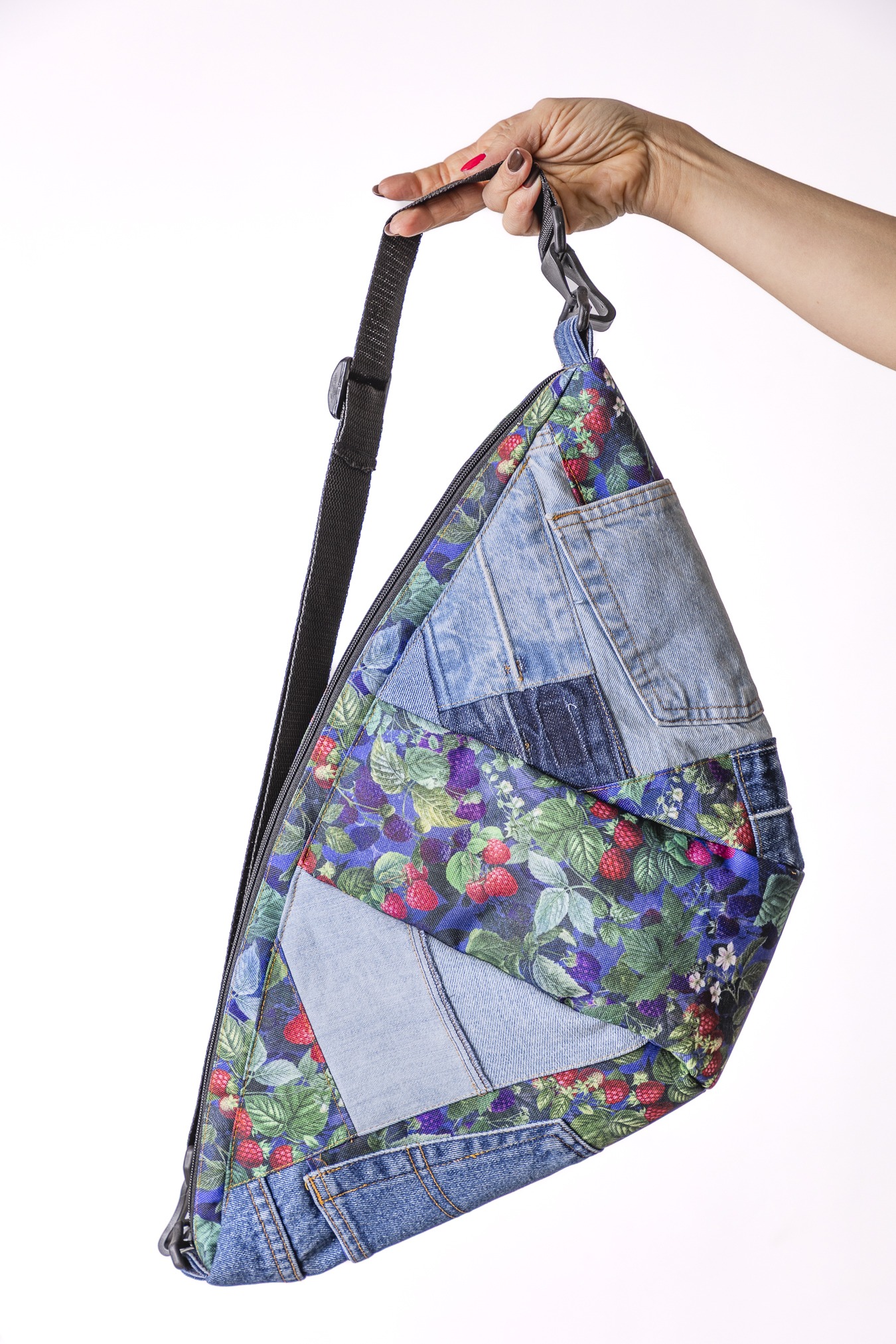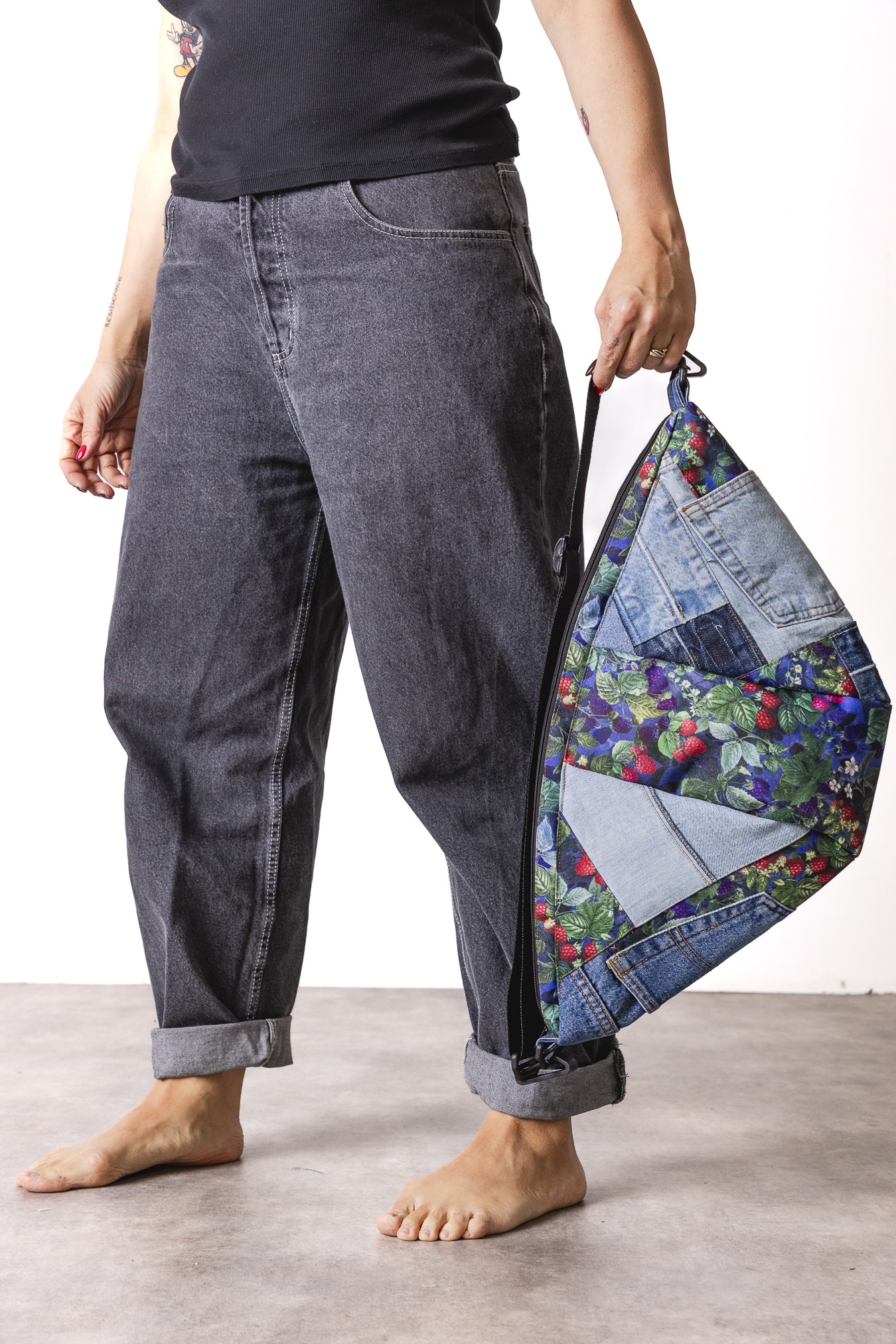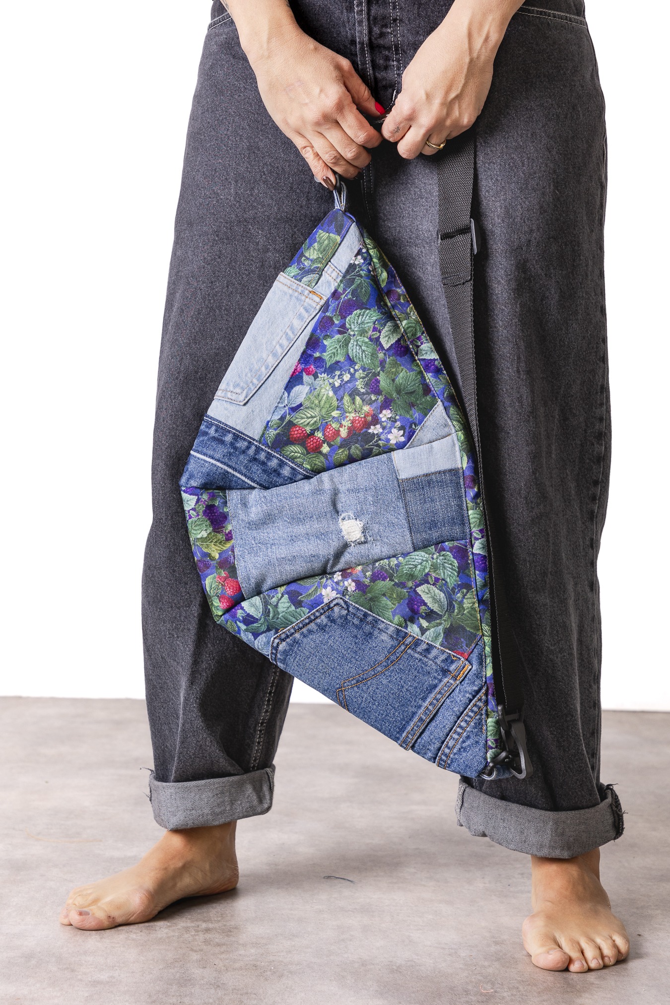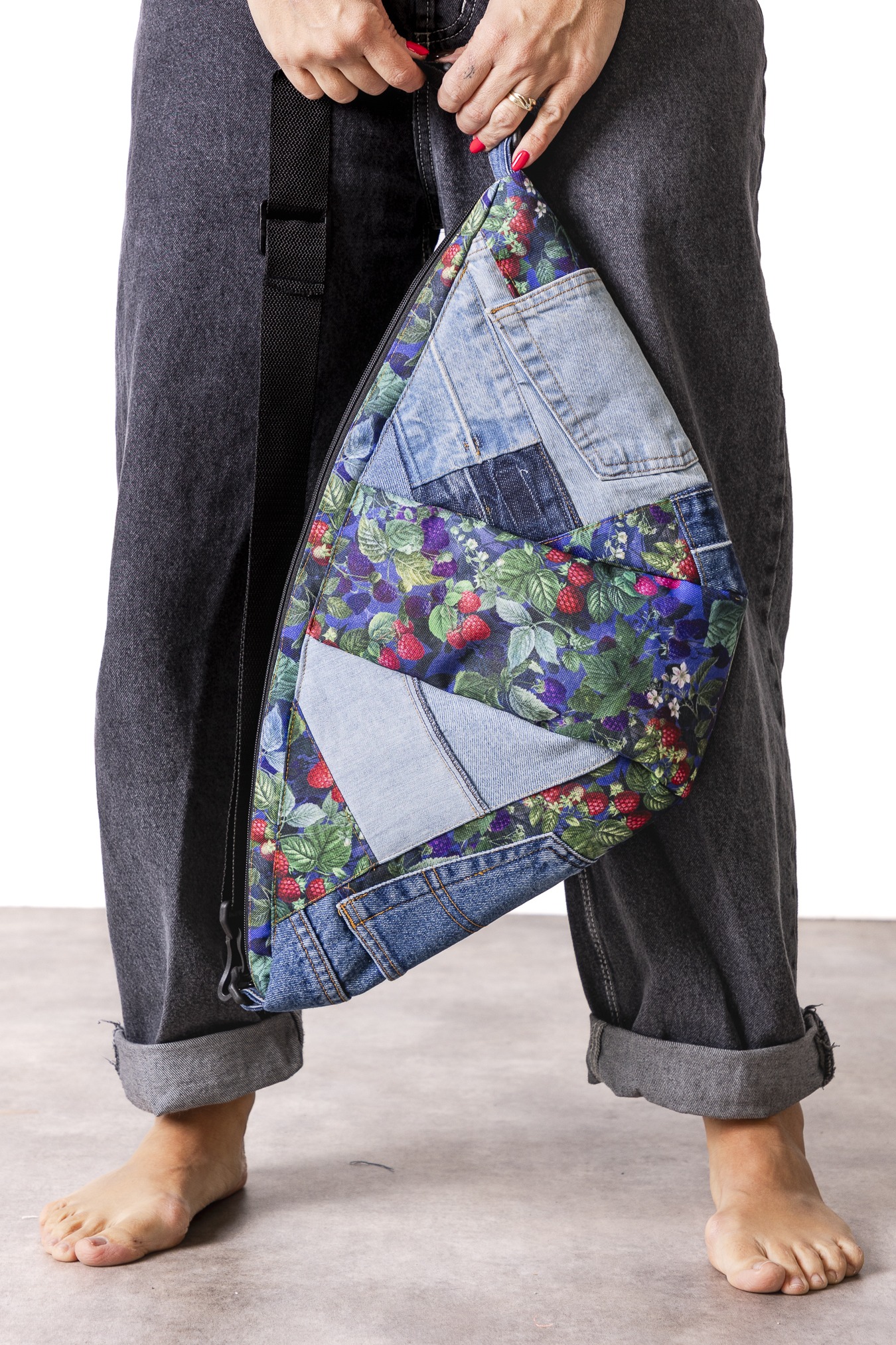 Forma „banan” to jeden z tych fasonów, który po prostu robi życie prostszym. Półokrągły kształt miękko dopasowuje się do sylwetki. Torbo-nerka szyta z wyselekcjonowanych jeansów z drugiego obiegu i kolorowych materiałów — każdy egzemplarz jest unikatowy. Solidna pojemna i wygodna, idealna na co dzień i w podróży-  upcyclingowa torbo-nerka Jeżyny.