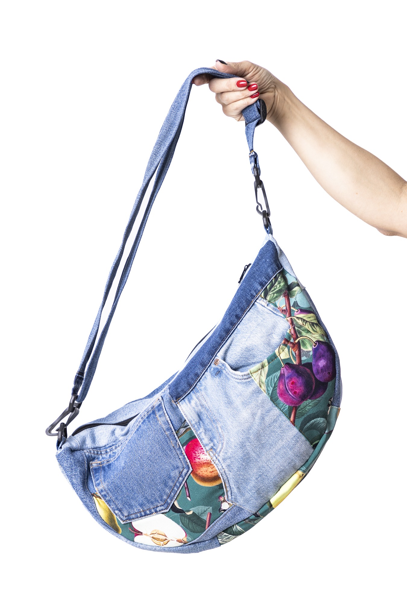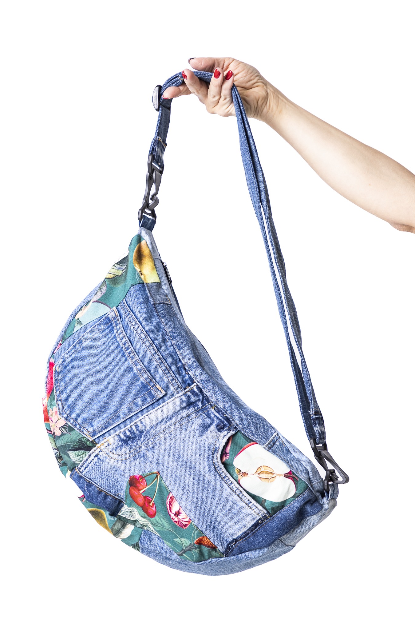 Torbo-nerka szyta z wyselekcjonowanych jeansów z drugiego obiegu i kolorowych materiałów — każdy egzemplarz jest unikatowy. Nosisz ją tak, jak lubisz: na biodrze, przewieszoną przez ramię albo wysoko na klatce. Jest lekka, wygodna i zaskakująco pojemna — zmieści telefon, portfel, klucze i te drobiazgi, bez których nie wychodzisz z domu.