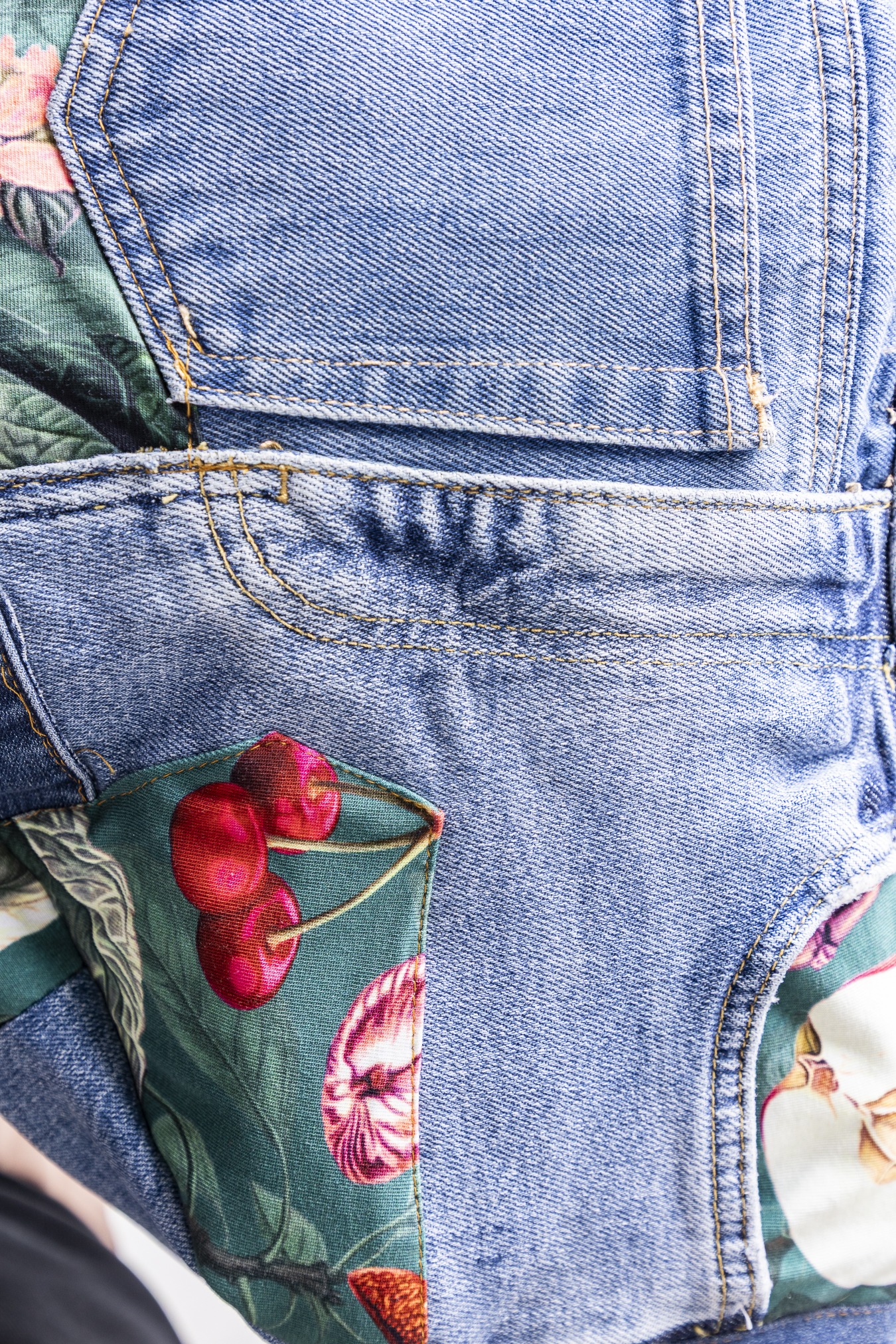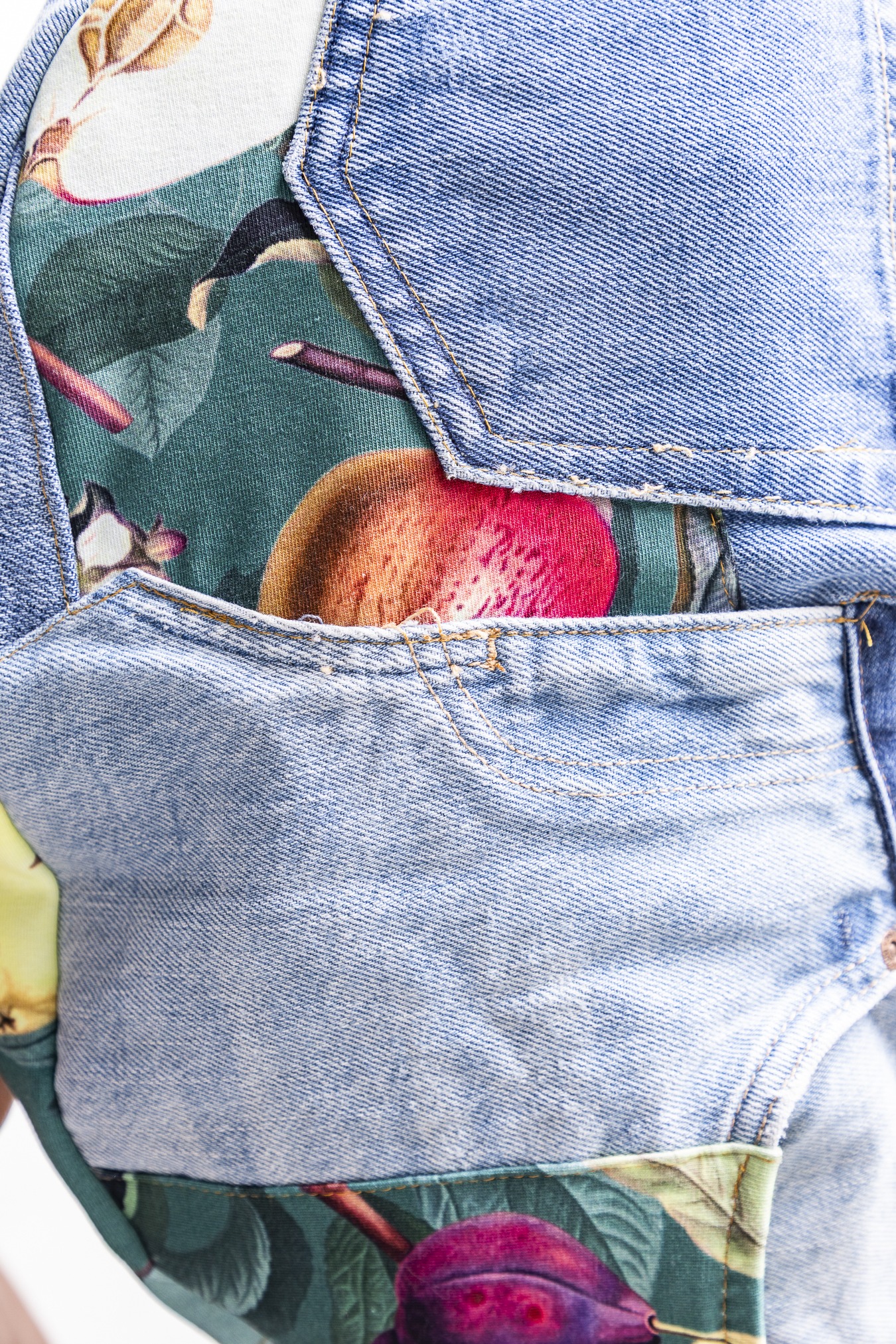 Materiały z drugiego obiegu: jeans i kolorowe materiały.