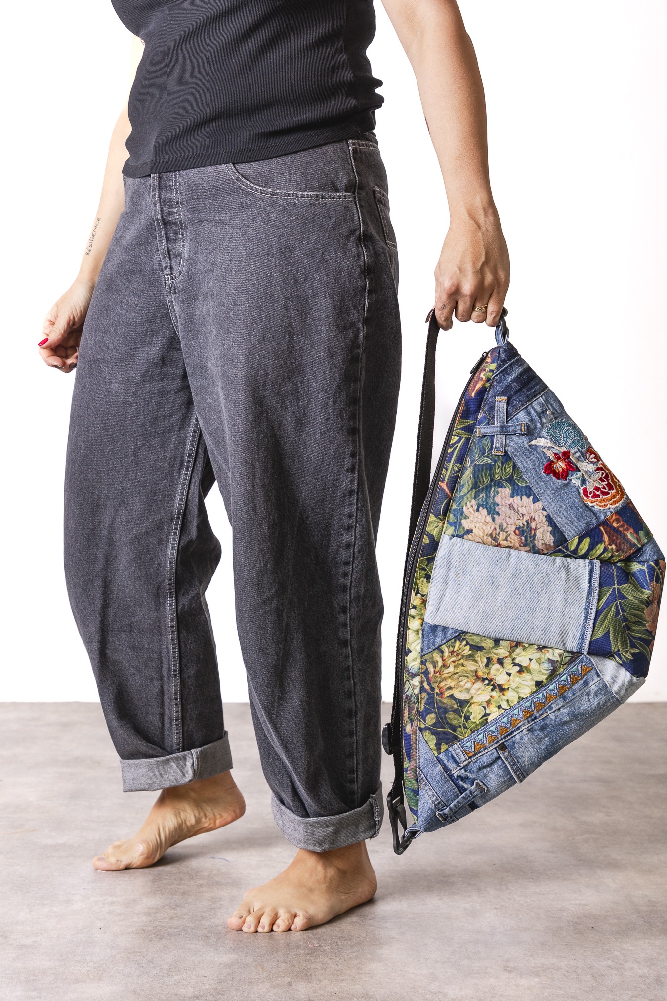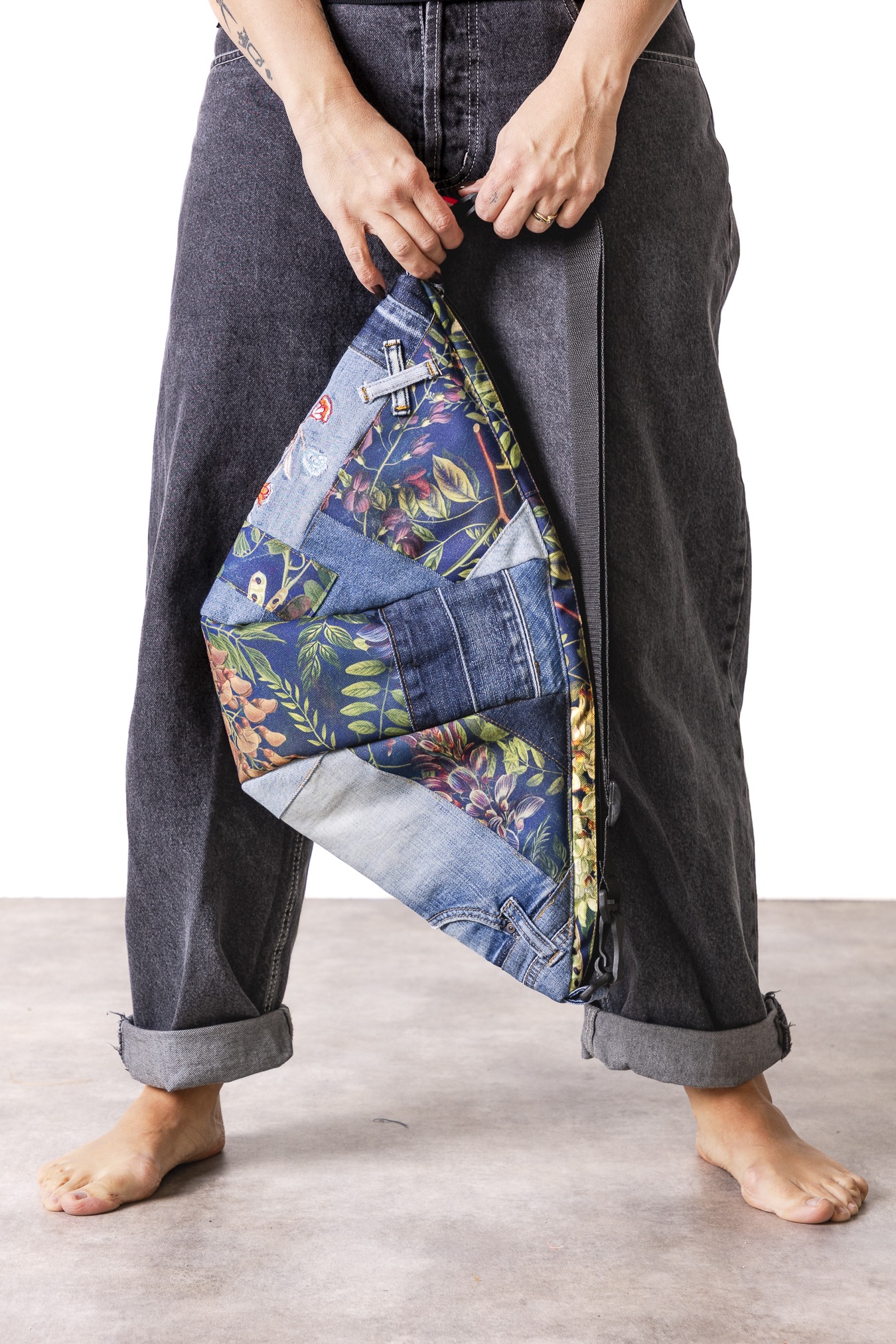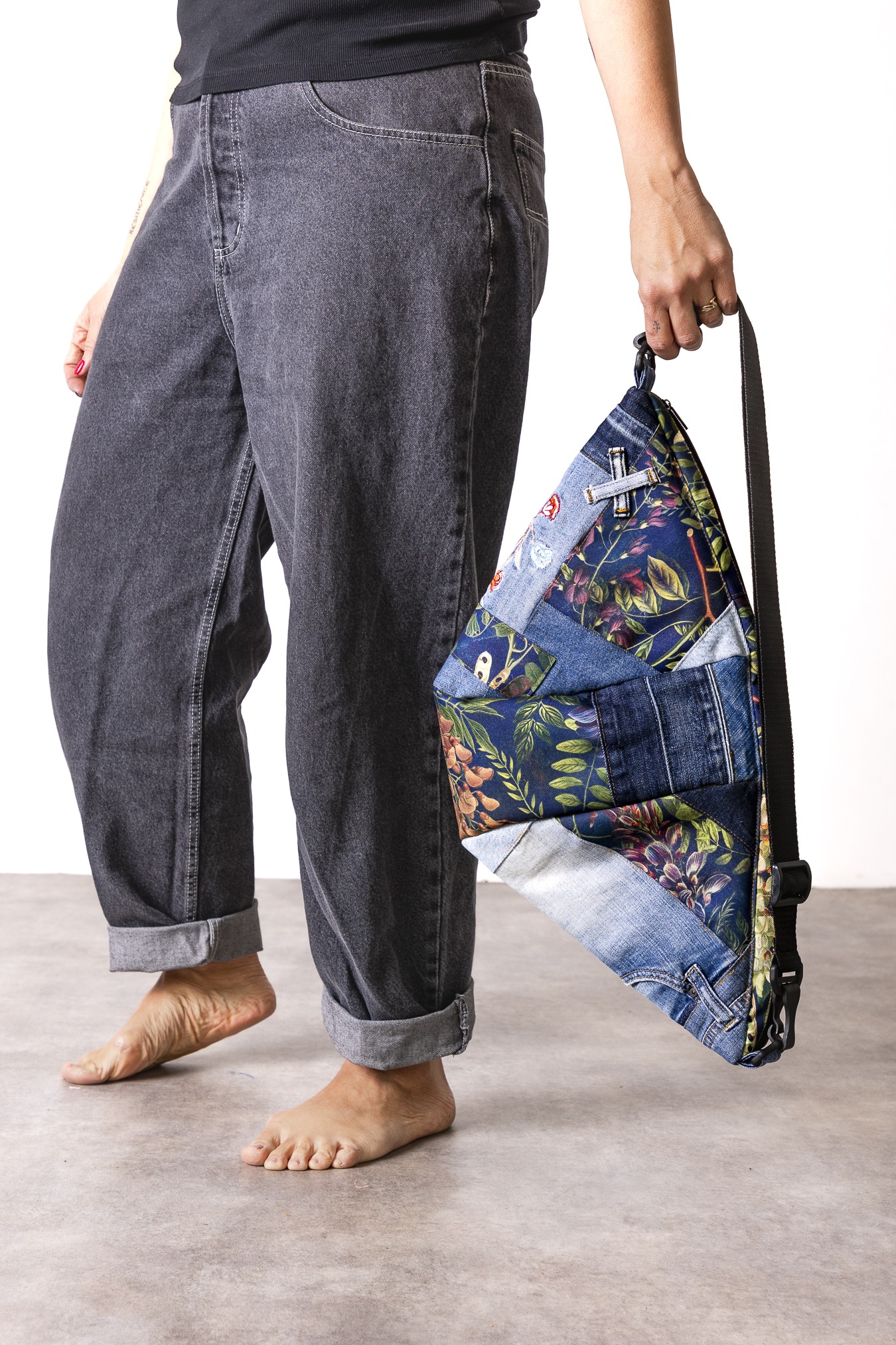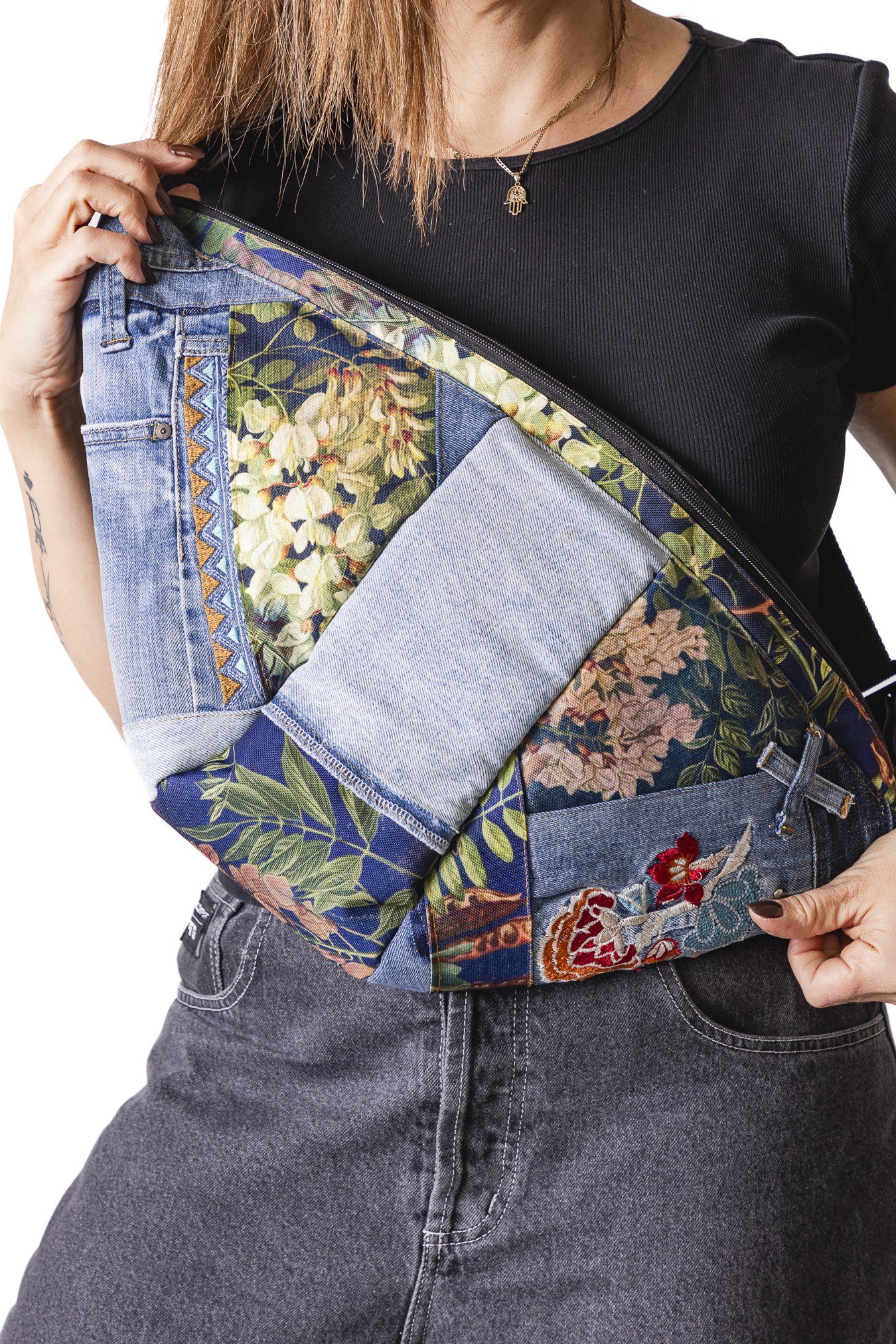 Półokrągły kształt miękko dopasowuje się do sylwetki, nie odstaje i nie krępuje ruchów — niezależnie od tego, czy jesteś w biegu, na spacerze czy w podróży. Noszona blisko ciała daje poczucie luzu i bezpieczeństwa, a przy tym wygląda lekko i naturalnie. Ta torbo-nerka powstała z materiałów z drugiego obiegu — upcyklingowy jeans i materiały w nasze wzory, dając im nowe życie. Dzięki temu każdy egzemplarz ma swój charakter i historię. Każdy egzemplarz jest unikatowy.