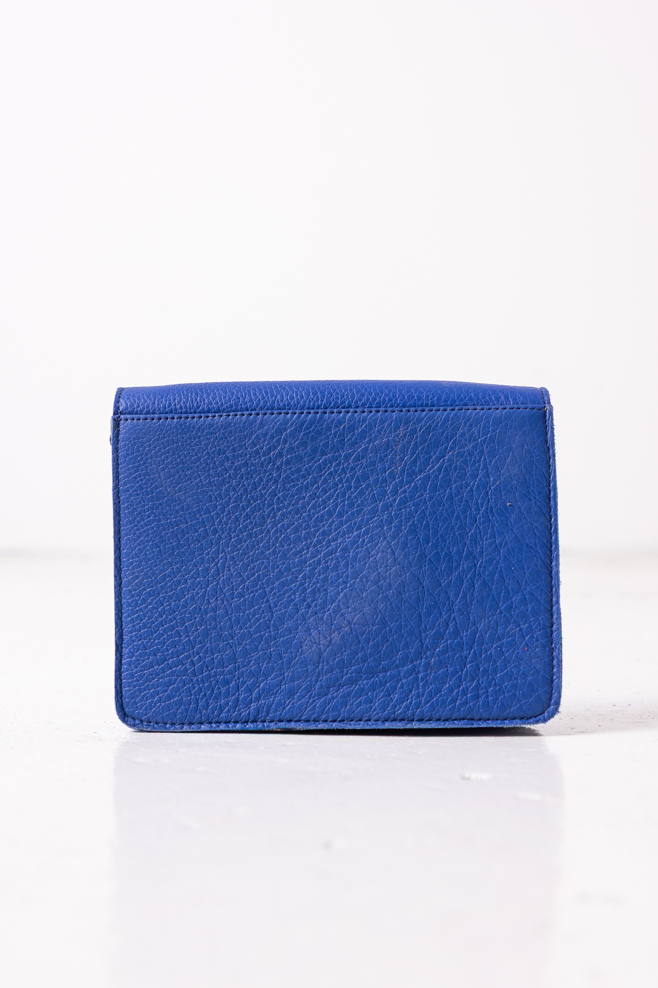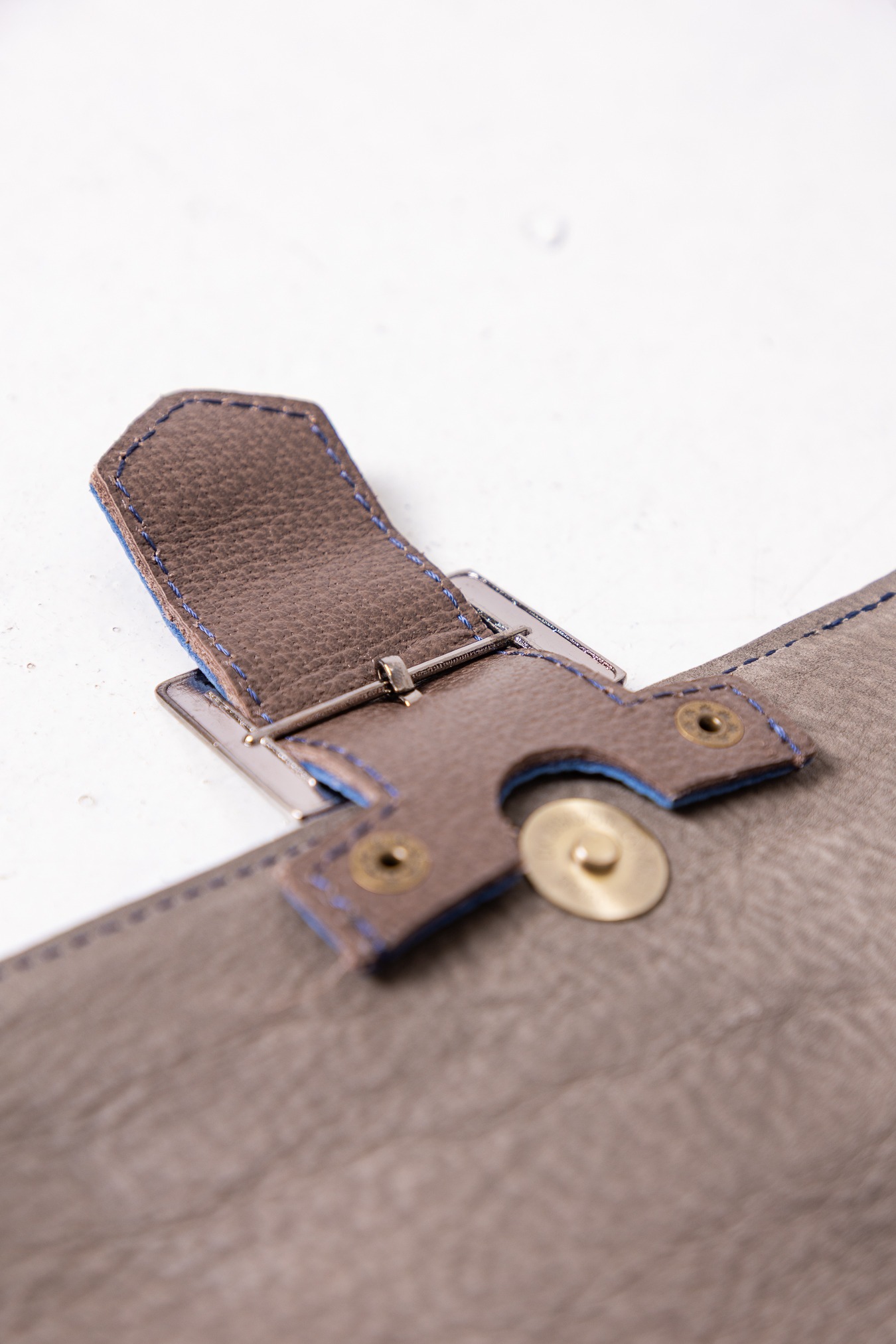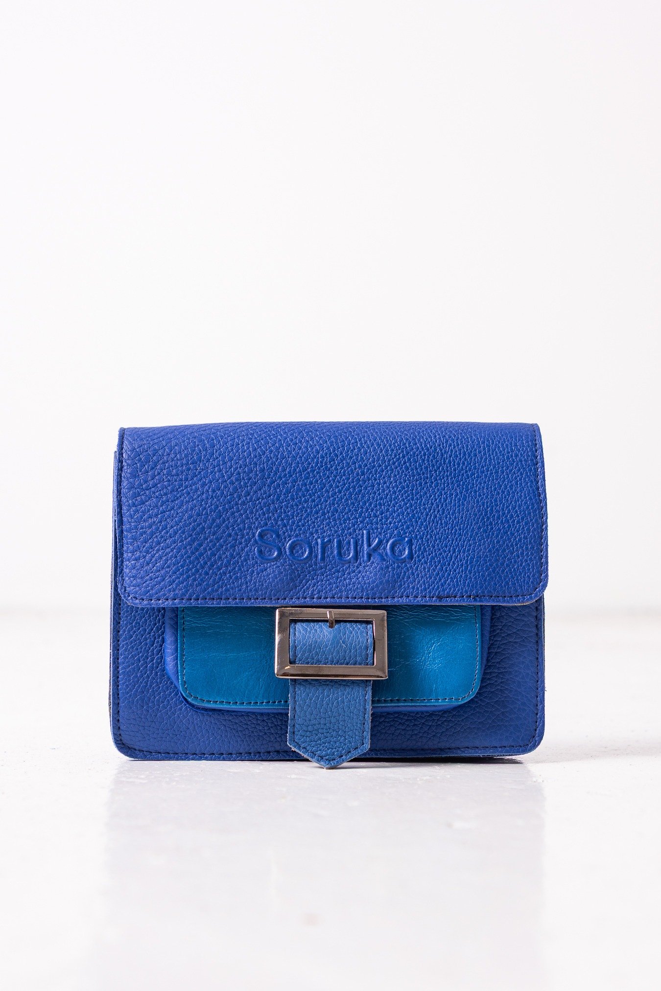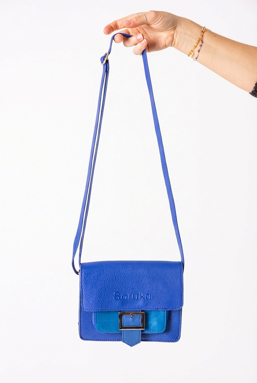Mała torebka na ramię w niebieskich tonach z efektowną klamrą. Ręcznie wykonana z recyklingowanej skóry. Posiada regulowany pasek, dzięki czemu można ją nosić na ramieniu lub na ukos. Zapinana na magnetyczny zatrzask umieszczony pod klamrą. Posiada jedną kieszeń główną, i małą zewnętrzną zapinaną na zamek.