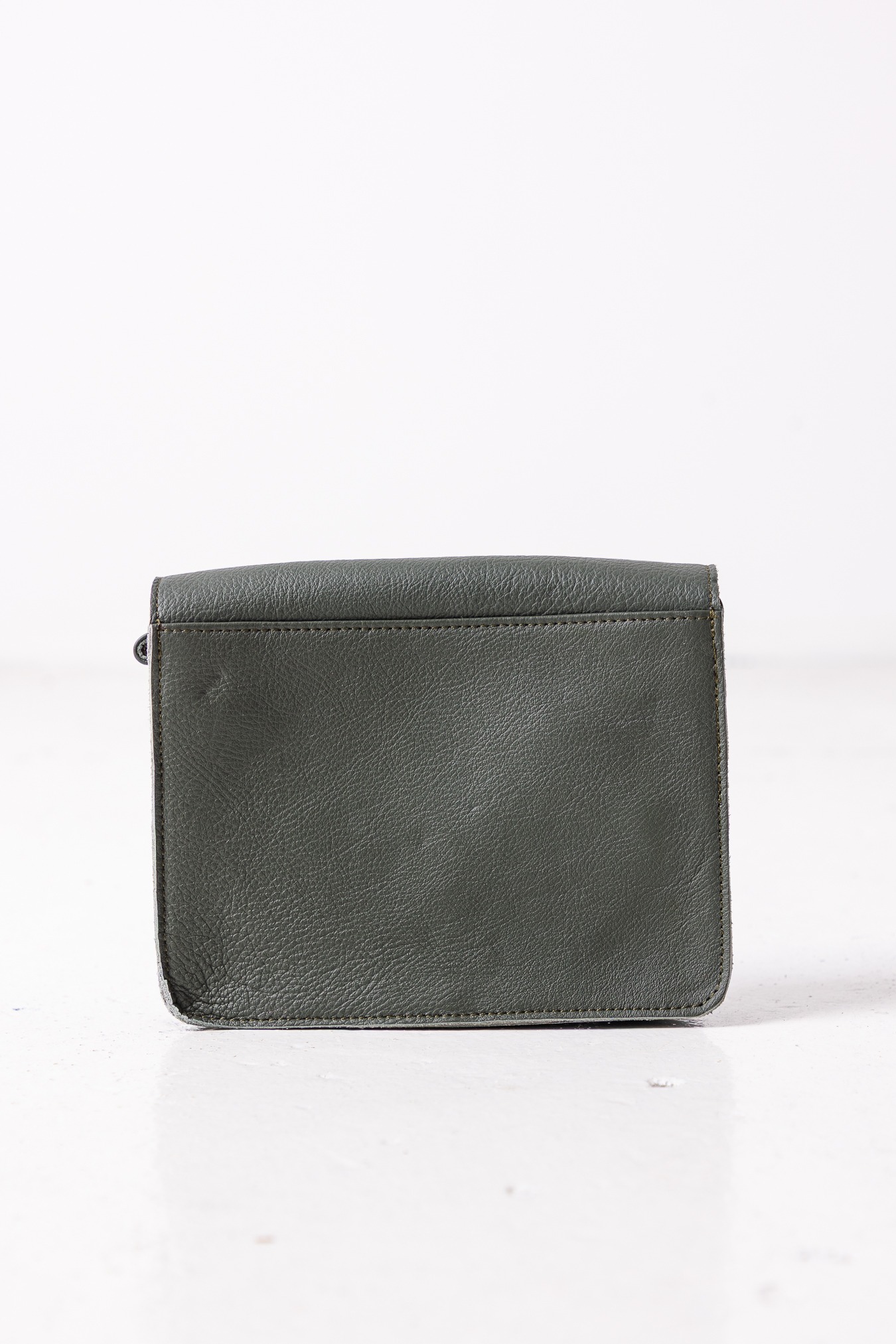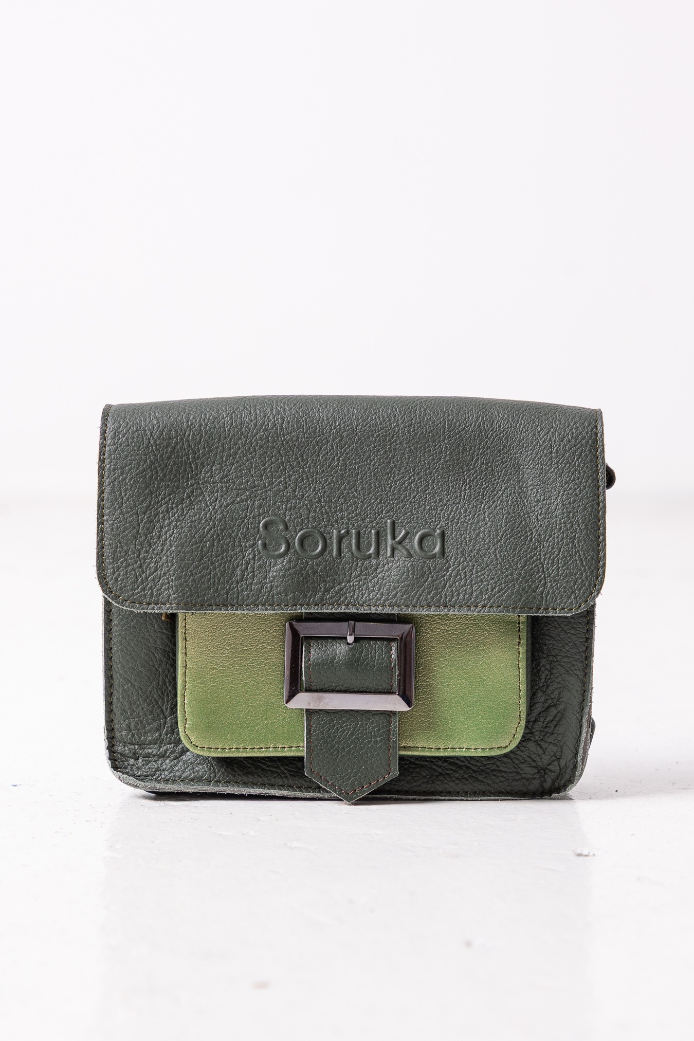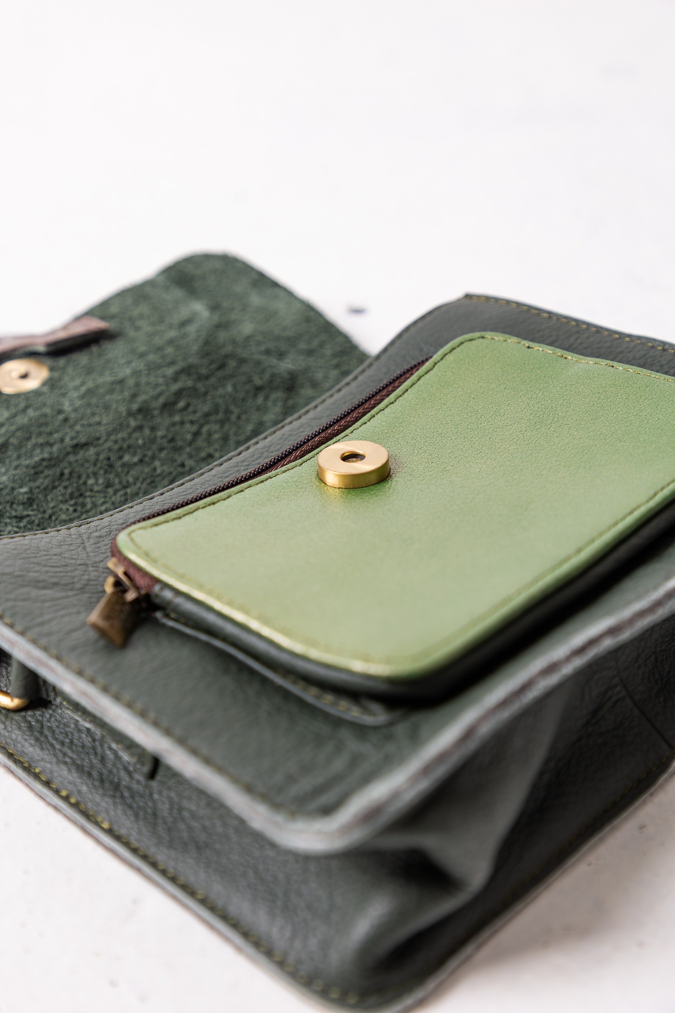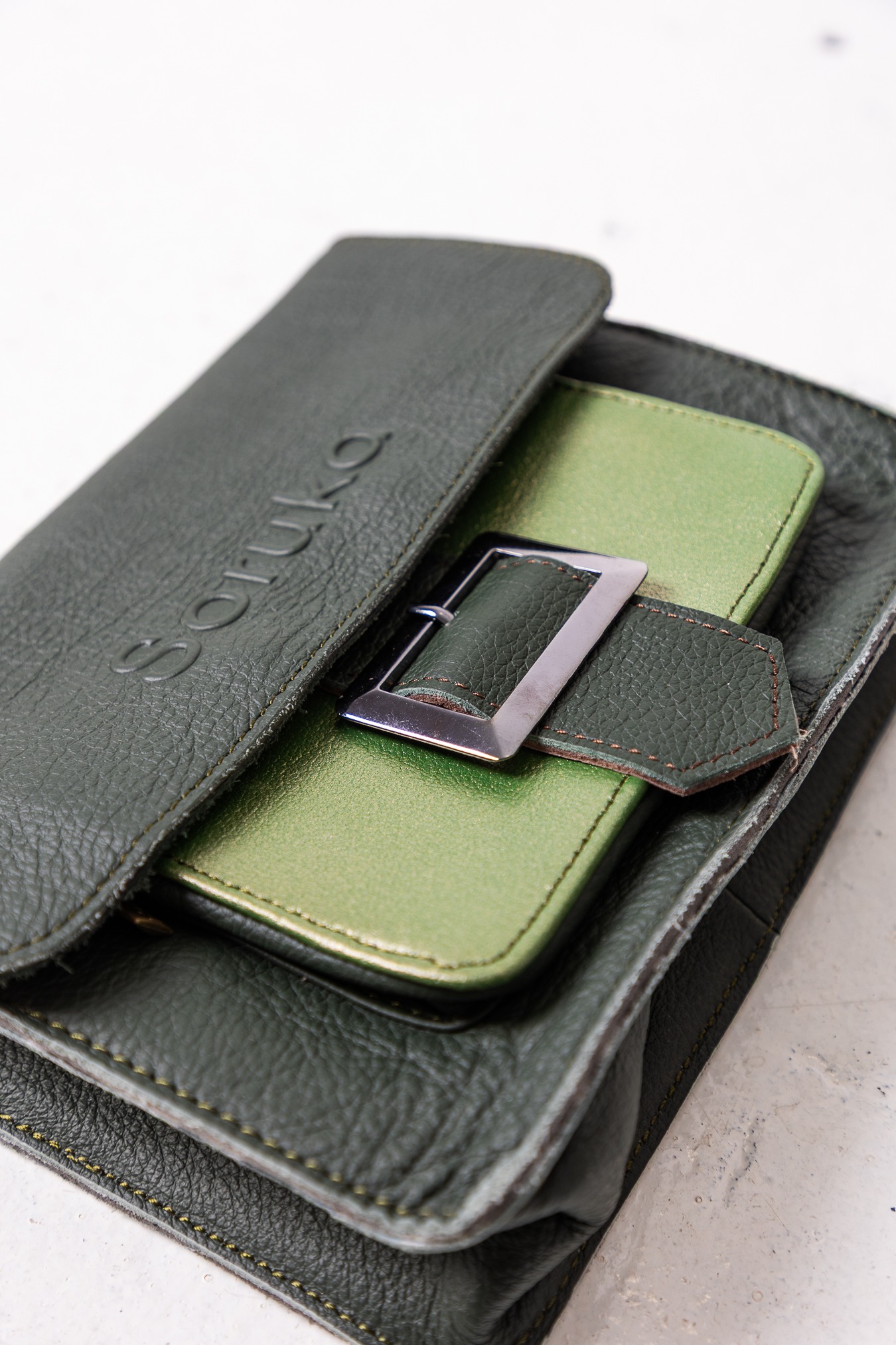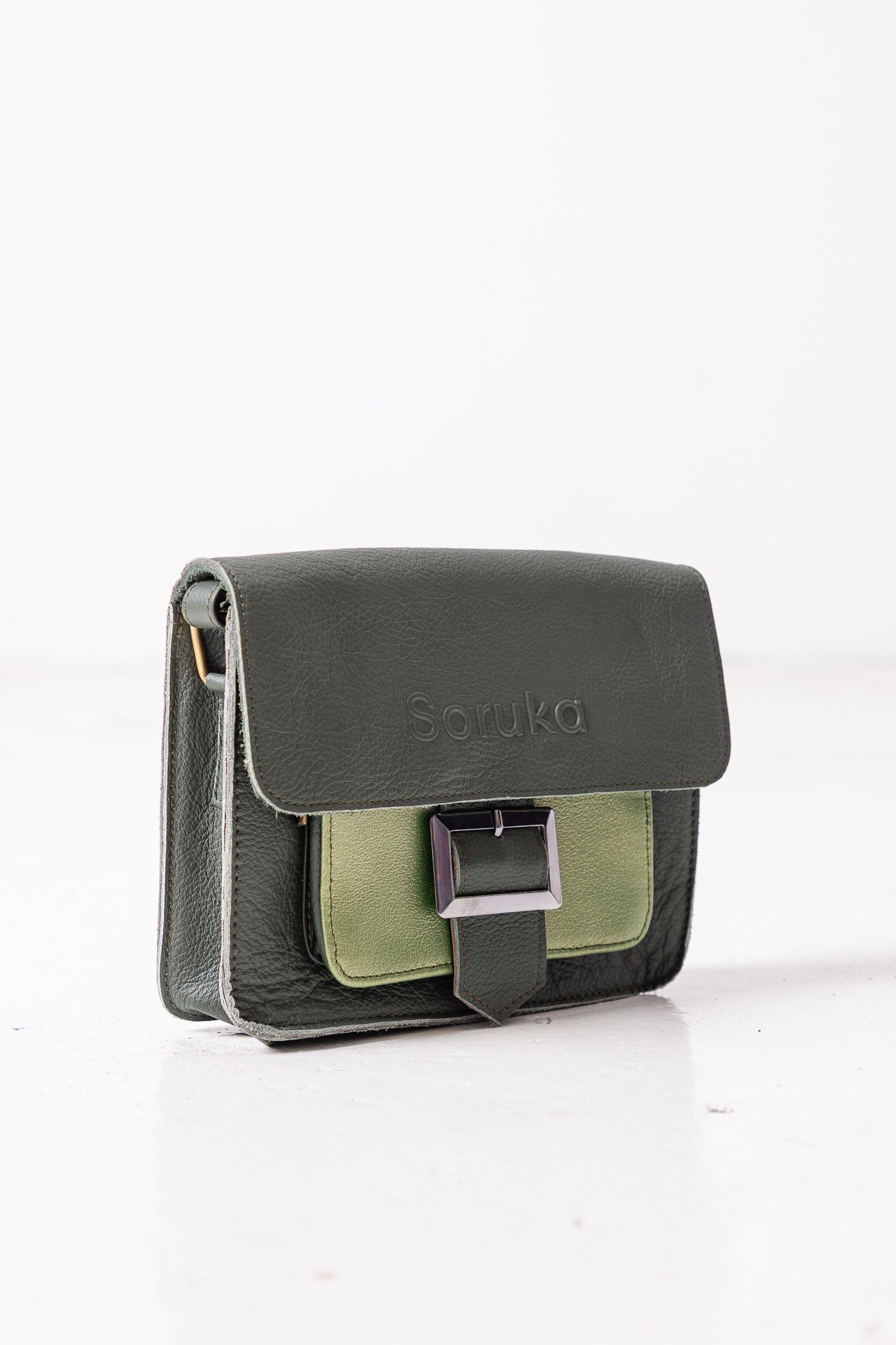 Mała torebka na ramię, w odcieniach zieleni, z efektowną klamrą to pomysł na wiosnę. Ręcznie wykonana z recyklingowanej skóry. Posiada regulowany pasek, dzięki czemu można ją nosić na ramieniu lub na ukos. Zapinana na magnetyczny zatrzask pod klamrą.