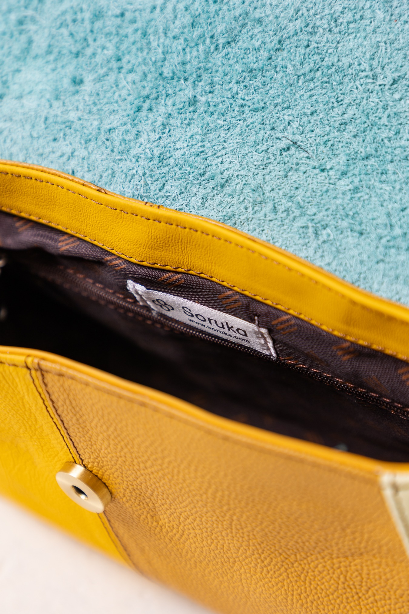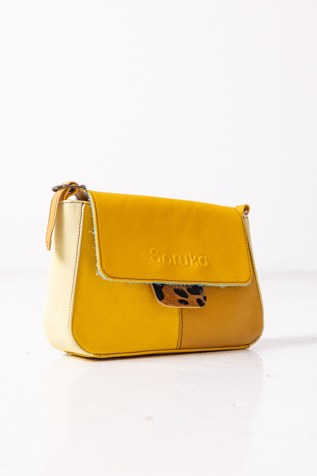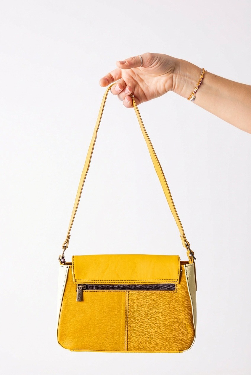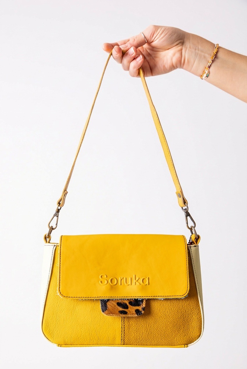 Torebka na ramię w odcieniach żółtego marki Soruka. Z wyjątkowym detalem – dwustronną, wymienną ozdobą przy zapięciu, dzięki której możesz łatwo zmieniać wygląd i dopasować ją do stylizacji. Wykonana z recyklingowanej skóry, sprawdzi się jako towarzyszka miejskich przygód. Zamykana na klapkę z magnesem — prosto, wygodnie i bez zbędnych elementów. W środku i z tyłu dodatkowa kieszeń, zapinana na zamek.
