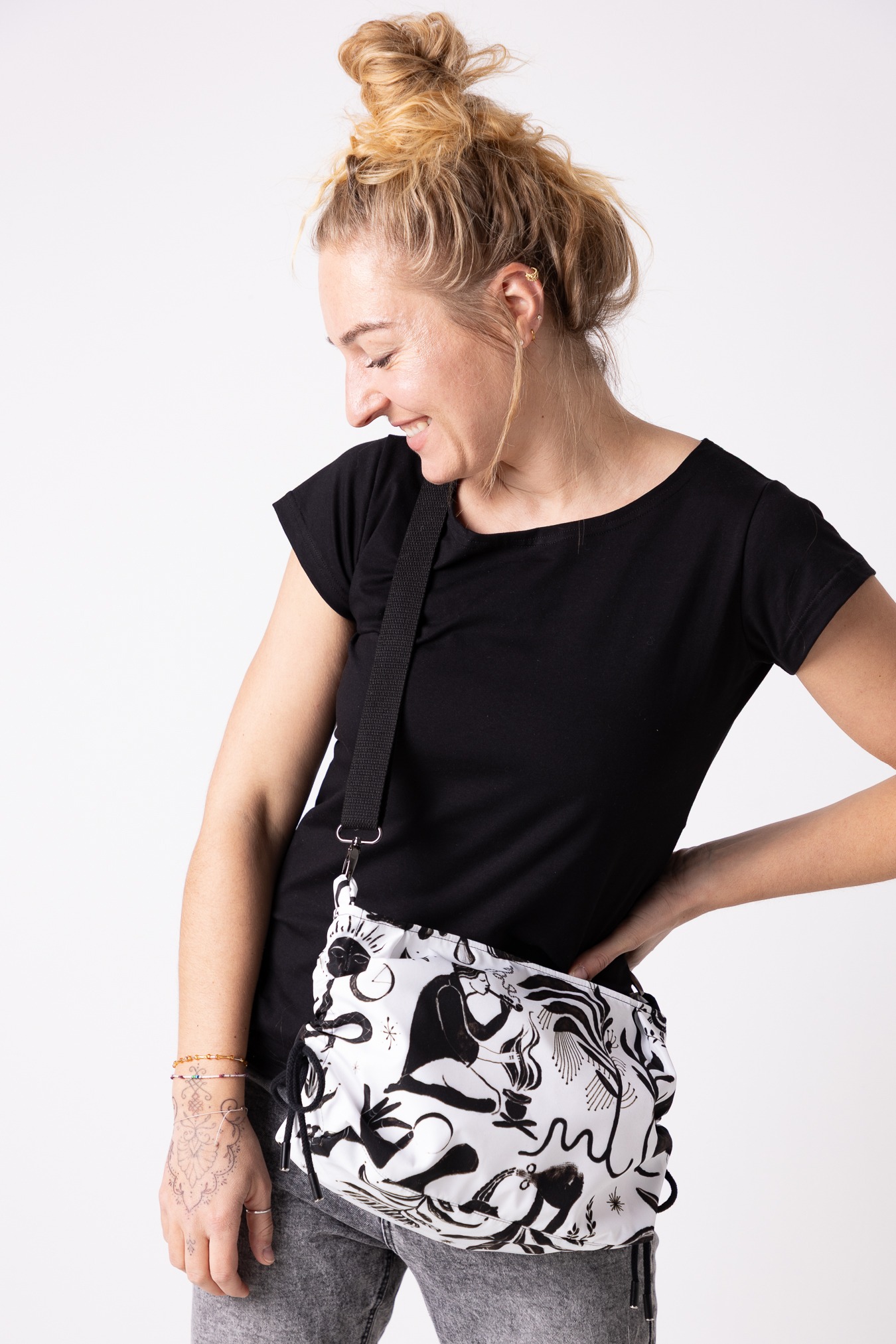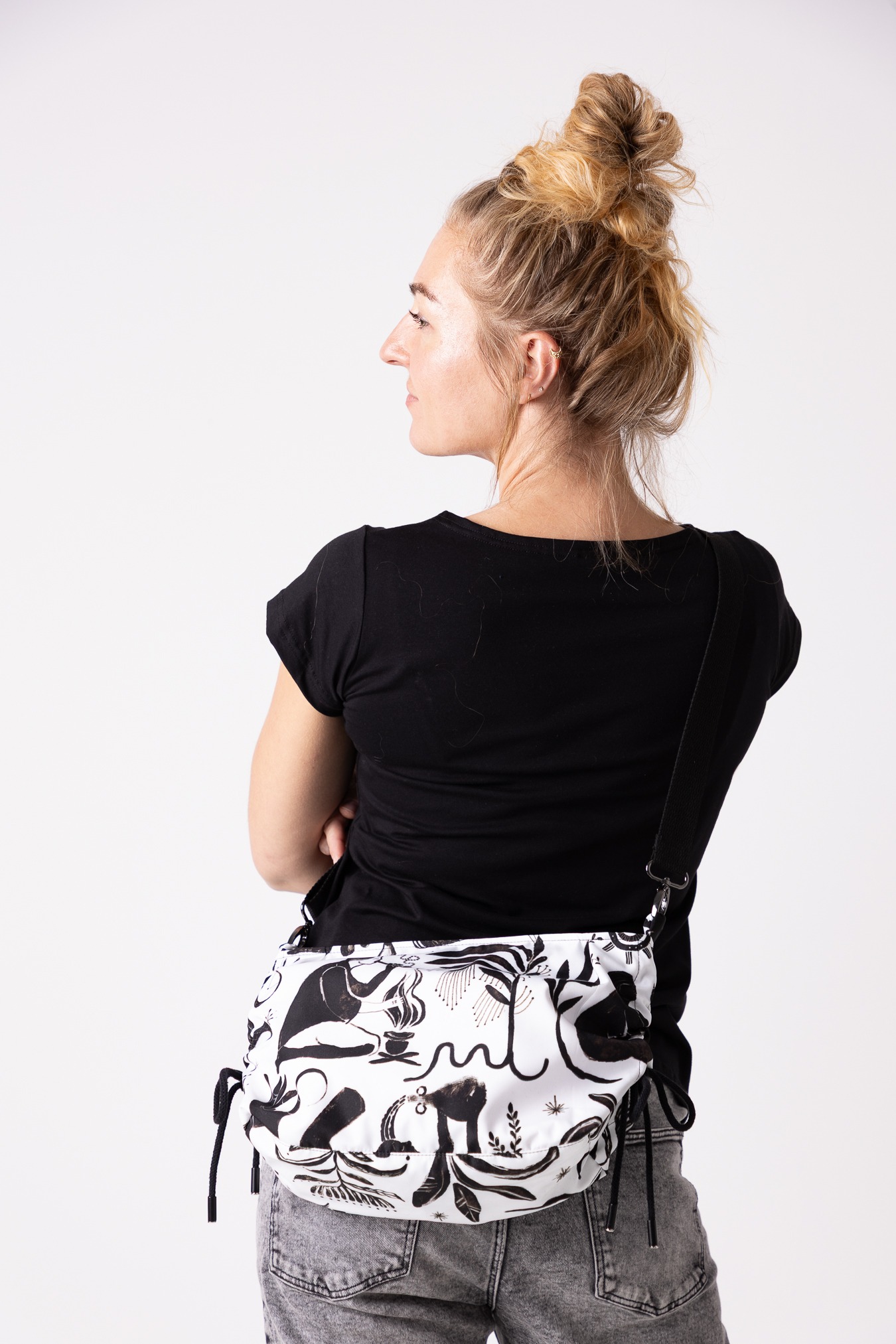 – regulowana forma – boczne sznurki pozwalają ściągnąć torbę w nerkę