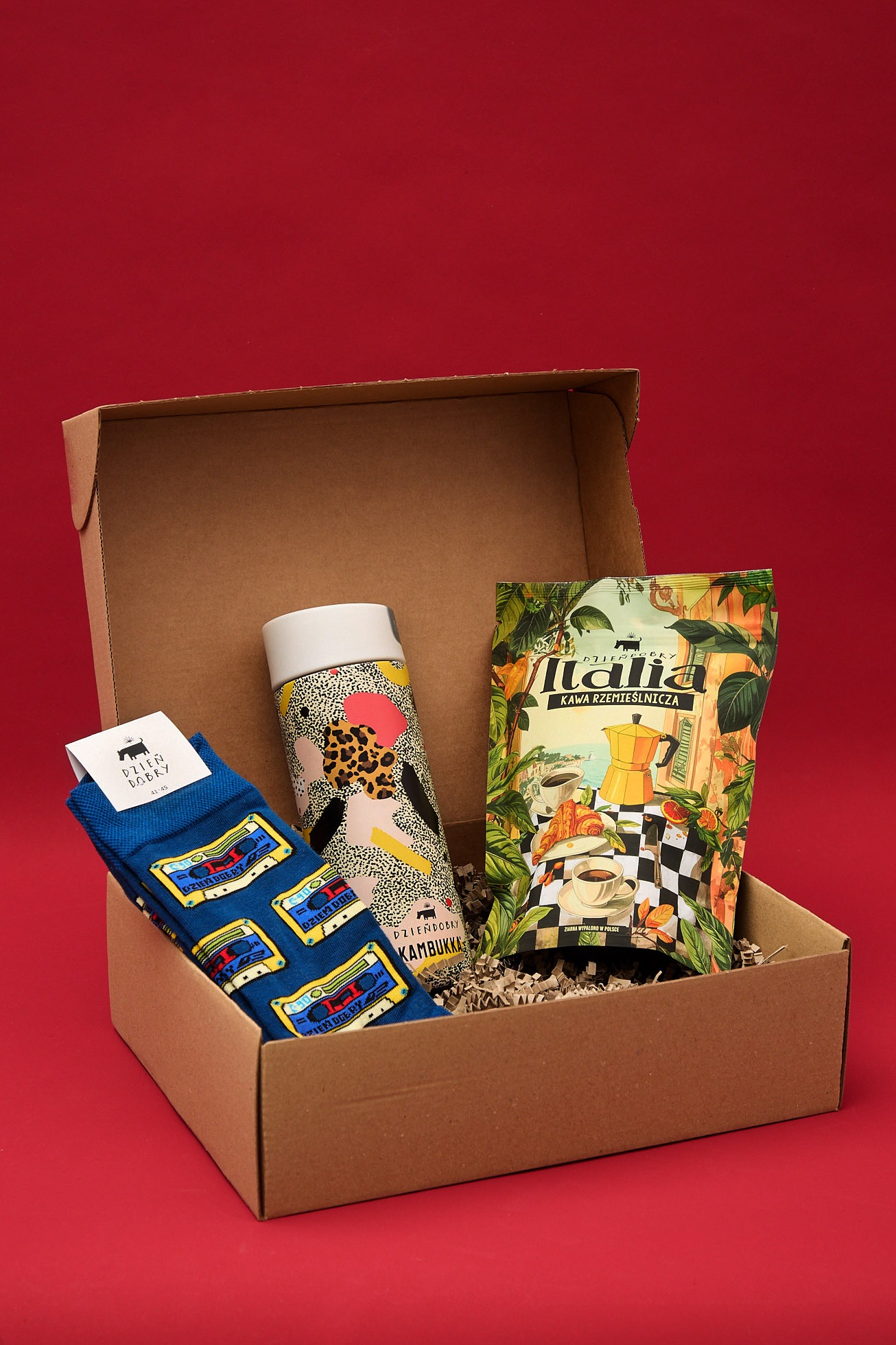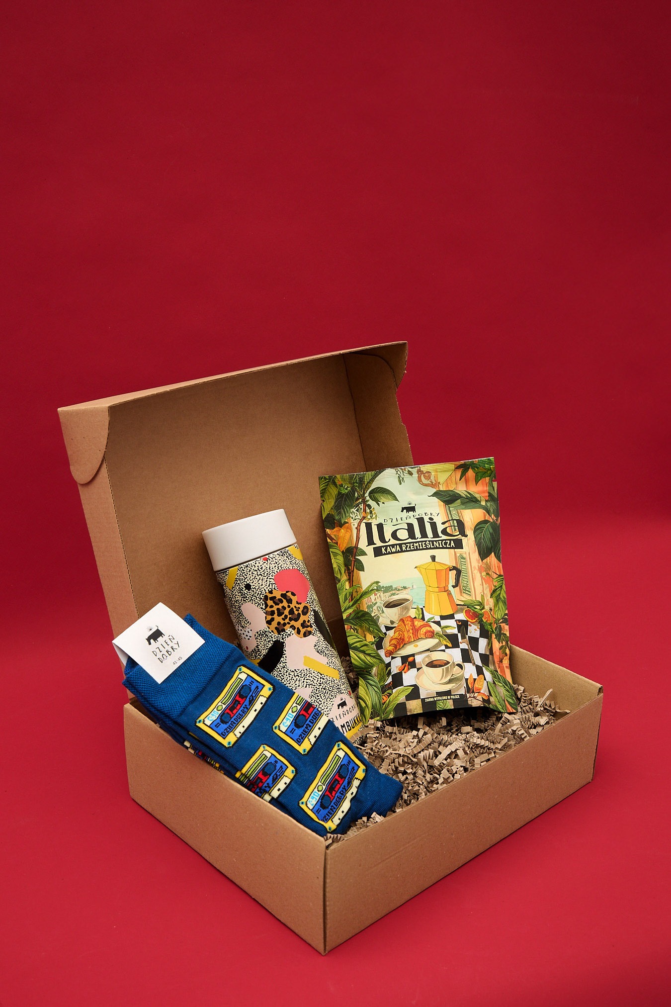 Idealny dla osoby, która lubi praktyczne prezenty… ale z charakterem. Ten zestaw łączy nostalgie, nowoczesną formę i codzienne małe przyjemności. Skarpety z grafiką z naszej kolekcji Roots, kubek termiczny utrzymuje temperaturę ciepłych napoi do 10 godzin, o pojemności 500 ml. Wyprodukowany z bezpiecznych materiałów, bez BPA, z antypoślizgowy spodem. Kawa, połączenie Arabiki i Robusty – wyrazisty smak i niska kwasowość. Stawia na nogi i robi robotę już od pierwszego łyka.