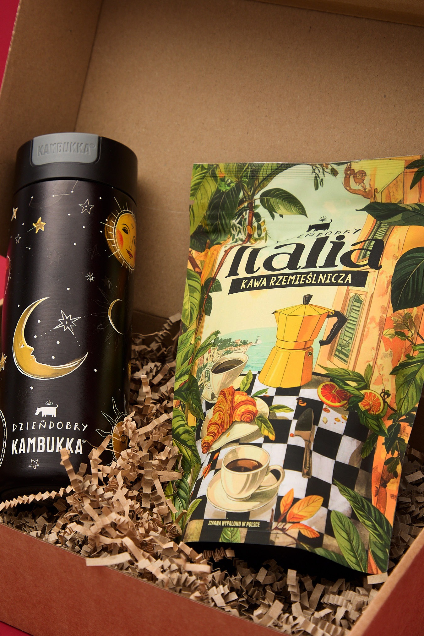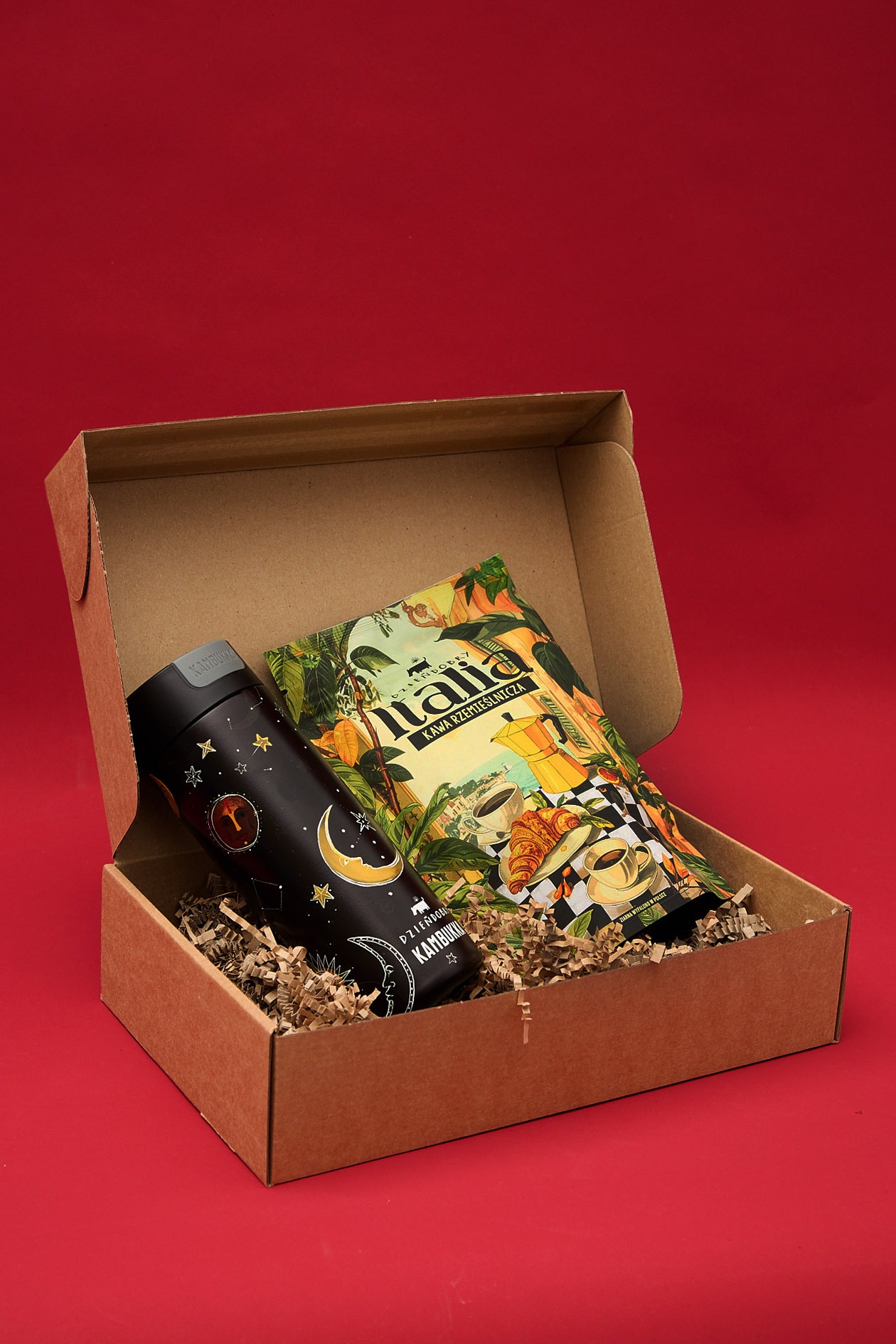Czasem najlepszym prezentem jest chwila spokoju. Zestaw Pełnia został stworzony właśnie na takie momenty — kiedy chcesz zatrzymać się na chwilę, złapać oddech i poczuć, że wszystko jest na swoim miejscu. Kubek będzie idealny do pracy, w drogę, na trening i wszystkie momenty „pomiędzy”. Długo utrzymuje temperaturę i wygodnie leży w dłoni. A aromatyczna mieszanka Arabiki i Robusty o głębokim smaku i wyrazistym aromacie – budzi nie tylko ciało, ale i myśli. Opakowanie zaprojektowane przez Jaśminę.